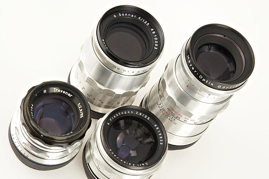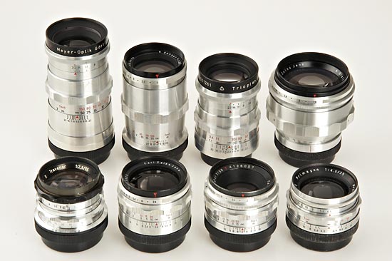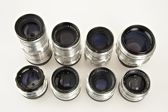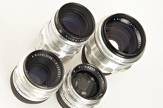 camera (shutter sticks) with 9 lenses (rare Flexon 2/50mm no.5272390, Primagon 4.5/35mm, Flektogon 2.8/35mm, Biotar 2/58mm, Biotar 1.5/75mm no.3956582, Travenar 2.8/85mm, Troplan 2.8/100mm, Sonnar 4/135mm, Telemegor 5.5/180mm), all lenses in good condition with caps, magnifying finder, waist level finder, extension tubes, filter, ever-ready case