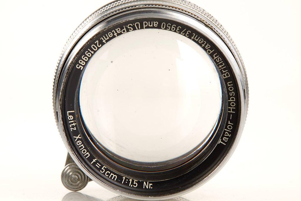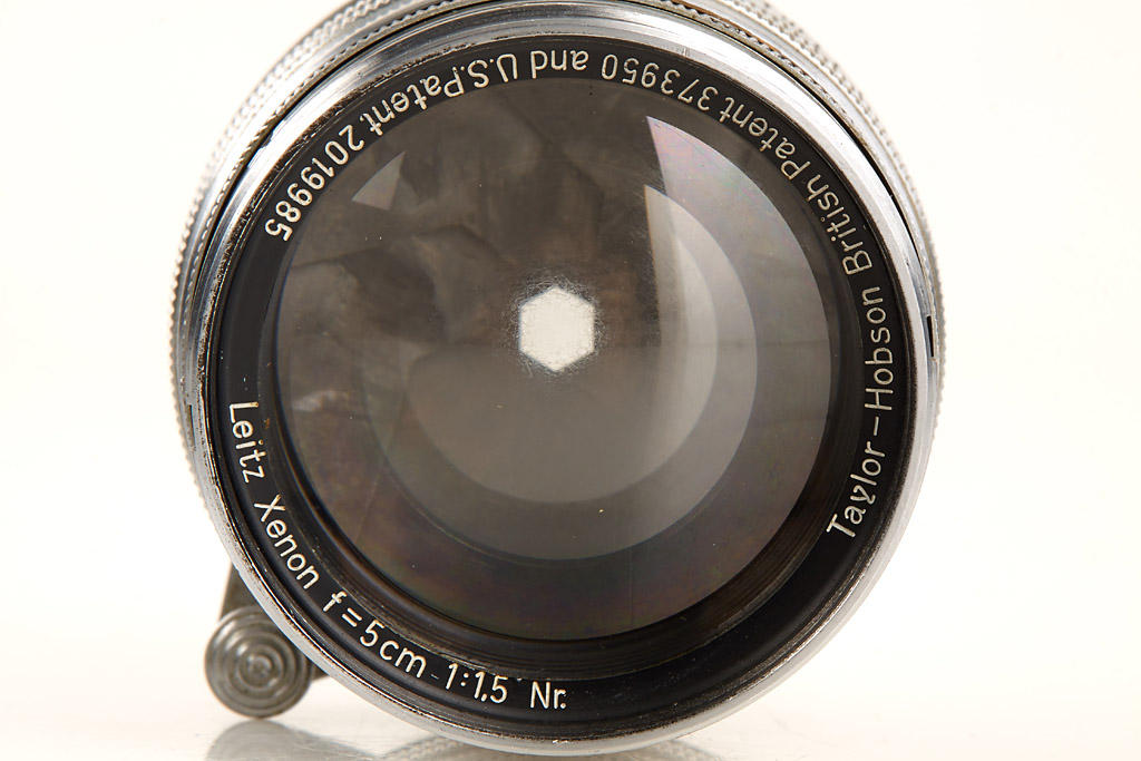 very interesting 3-ring Xenon, front ring engraved 'Taylor-Hobson British Patent 373950 and US Patent 2019985 Leitz Xenon f=5cm 1:1,5 Nr.' (no serial number or D.R.P. engraving), barrel engraved 'Ernst Leitz Wetzlar', in feet, lens in good condition with caps