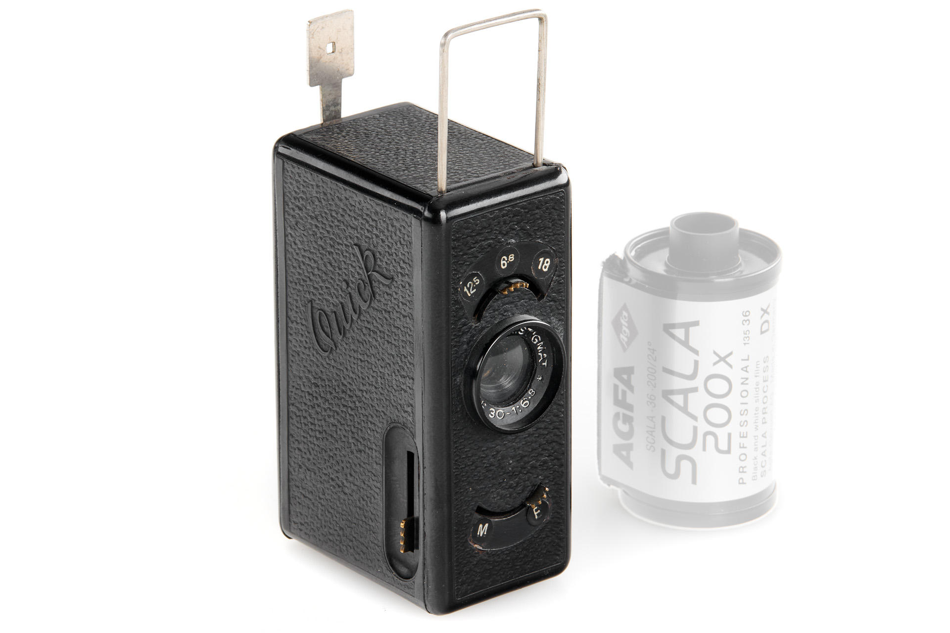 Bakelite subminiature camera for special cassettes, made in Austria, Quick-Ministigmat 6.8/30mm lens, folding finder, c.68x44x27mm