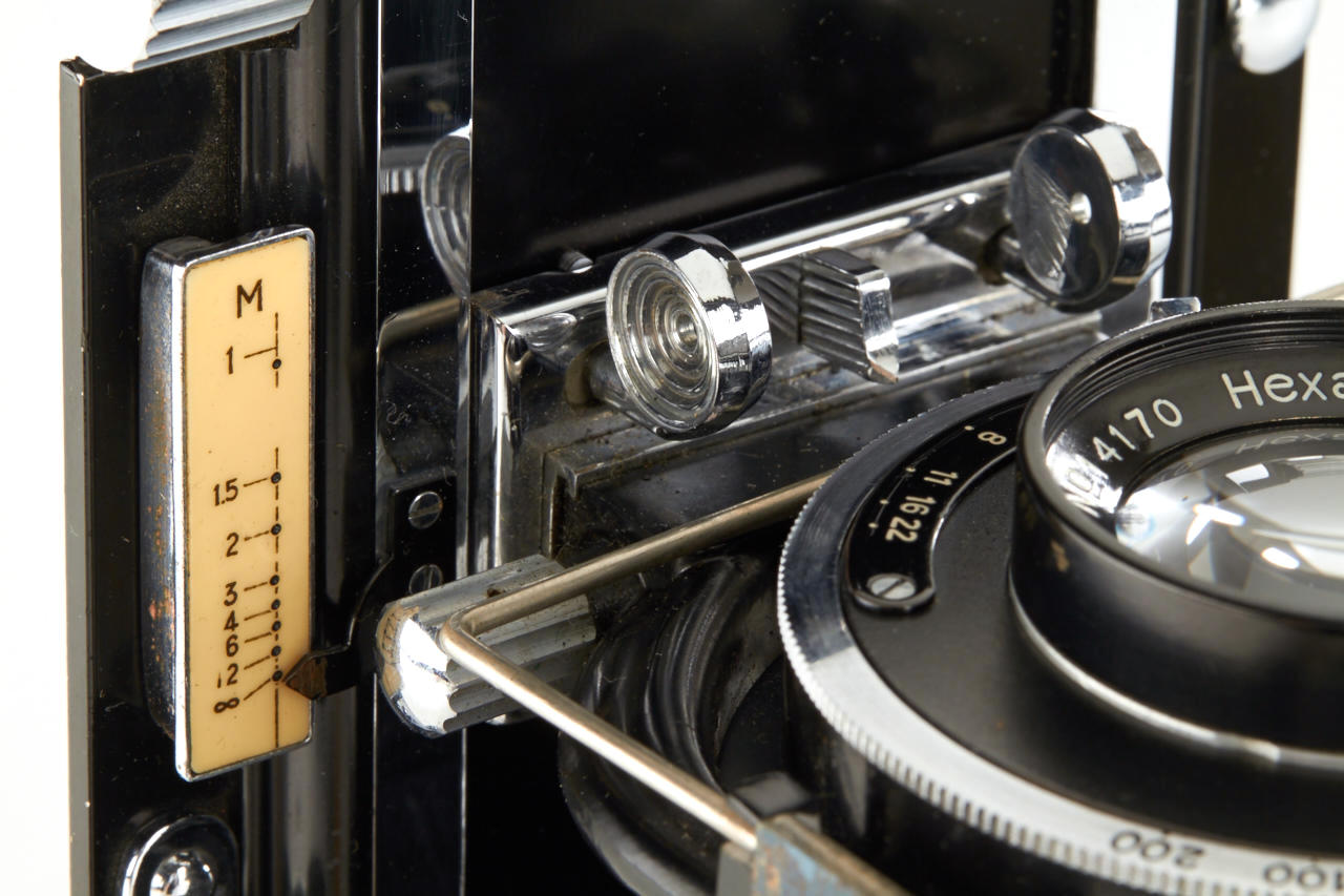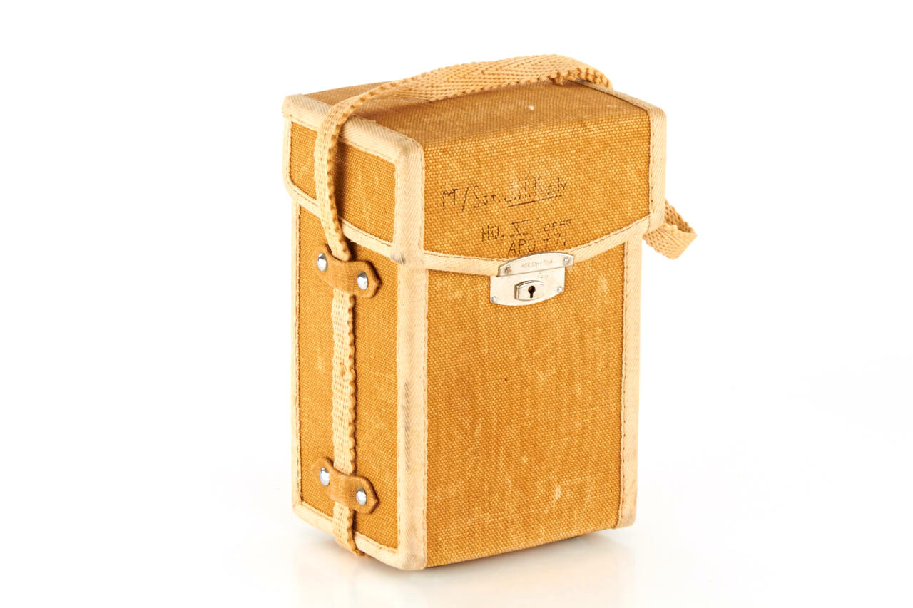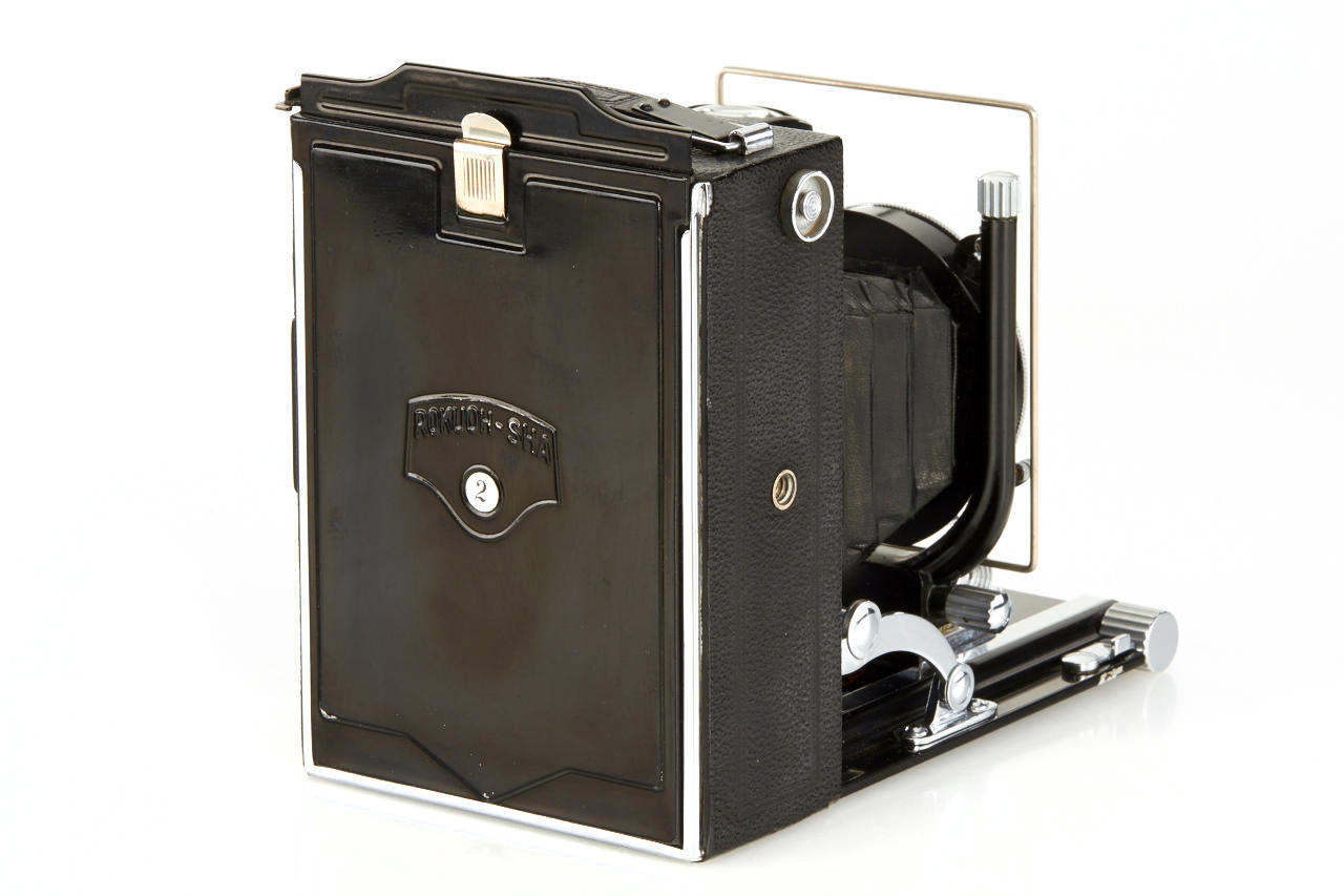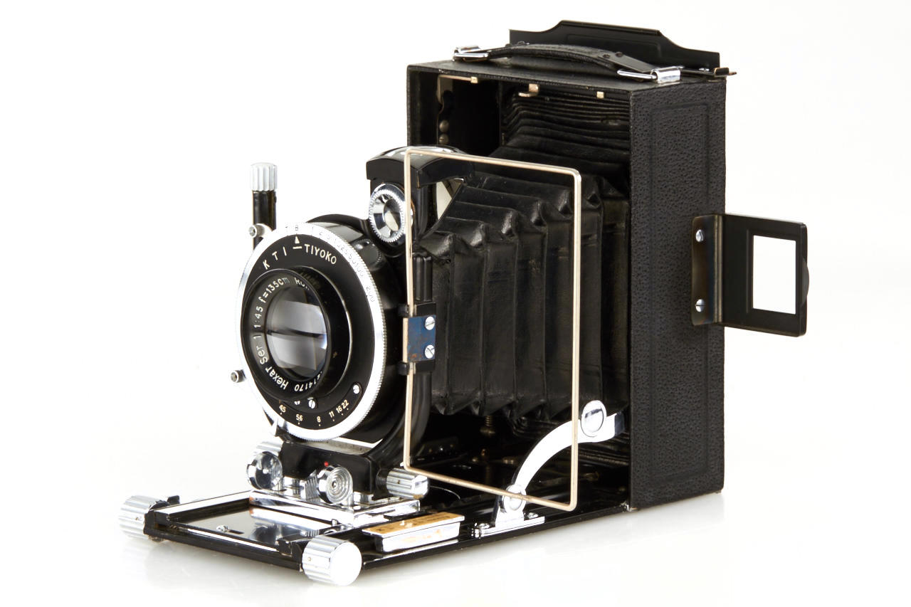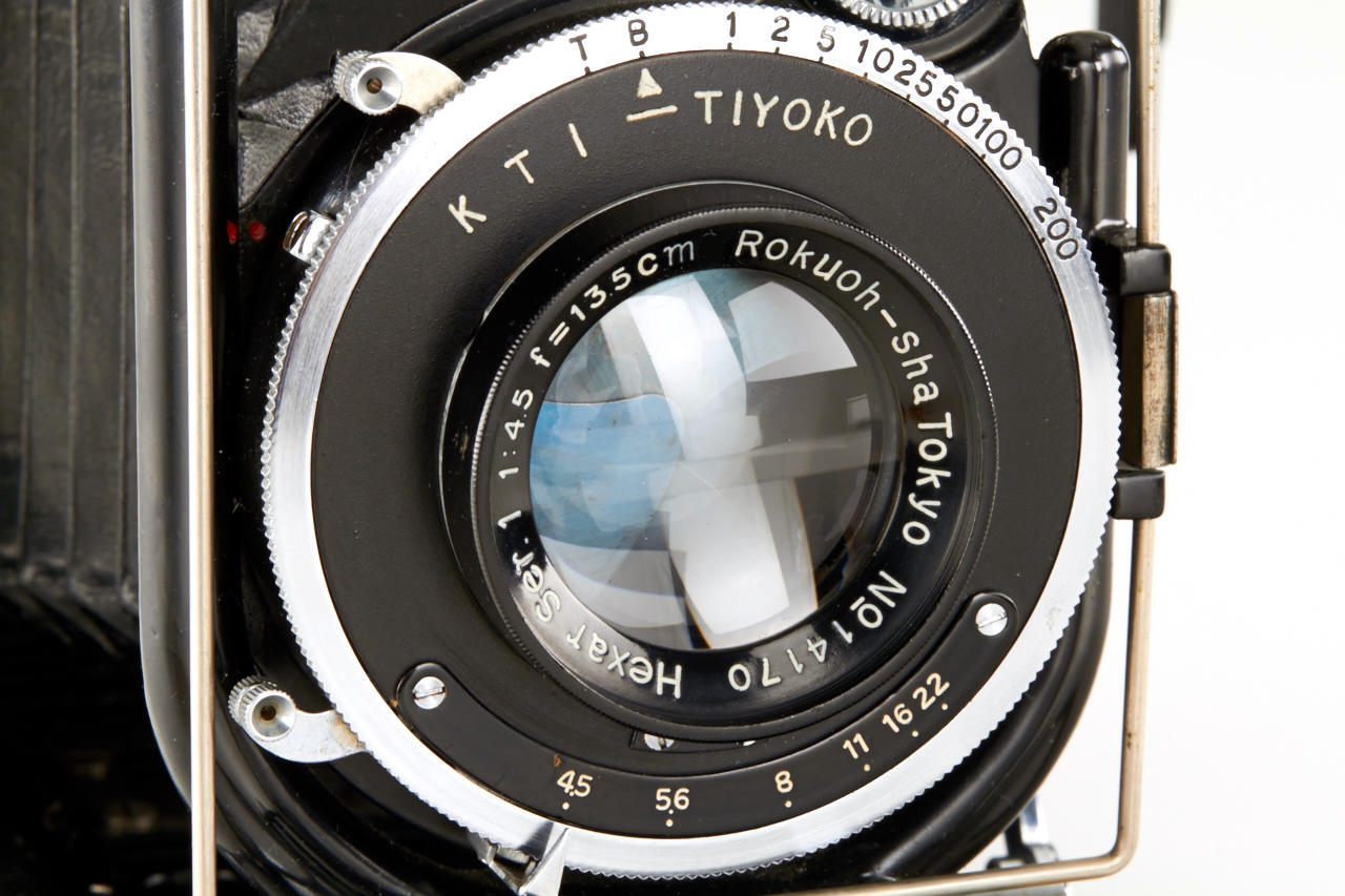 8x10.5cm, very rare camera in near mint condition, manufactured by Konishi & Co. for the Japanese military, Hexar 4.5/13.5cm no.14170 in KTI - TIYOKO shutter, red laurel wreath engraved on the bed and inside the case, focusing screen adapter, 4 plate film holders, in matching brown military case