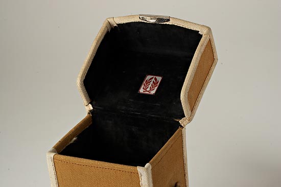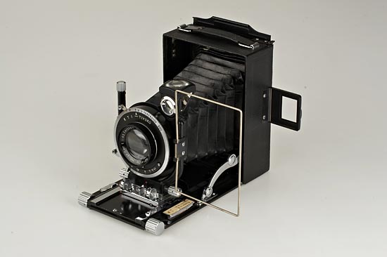 8x10.5cm, very rare camera in near mint condition, manufactured by Konishi & Chiyoda for the Japanese military, Hexar 4.5/13.5cm no.14170 in KTI - TIYOKO shutter, red laurel wreath engraved on the bed and stamped on the case, focusing screen adapter, 4 plate film holders, in matching brown case