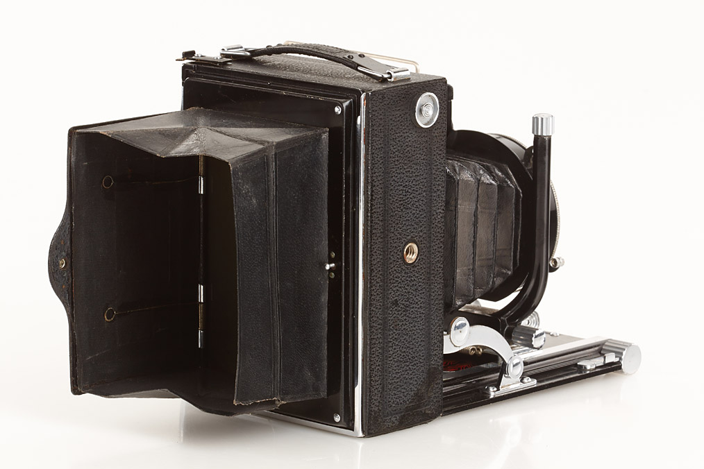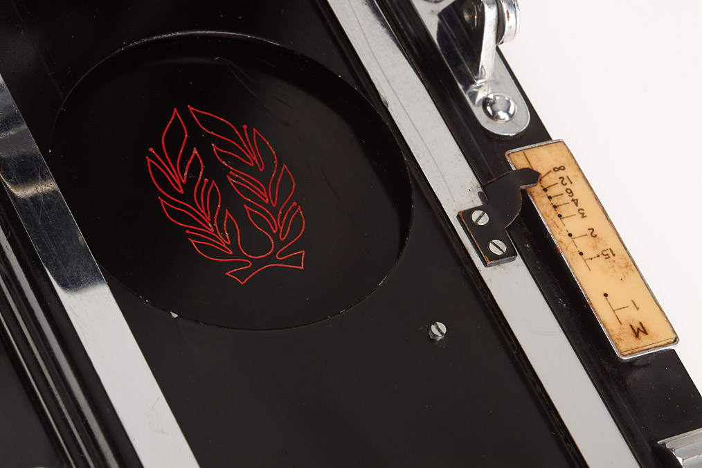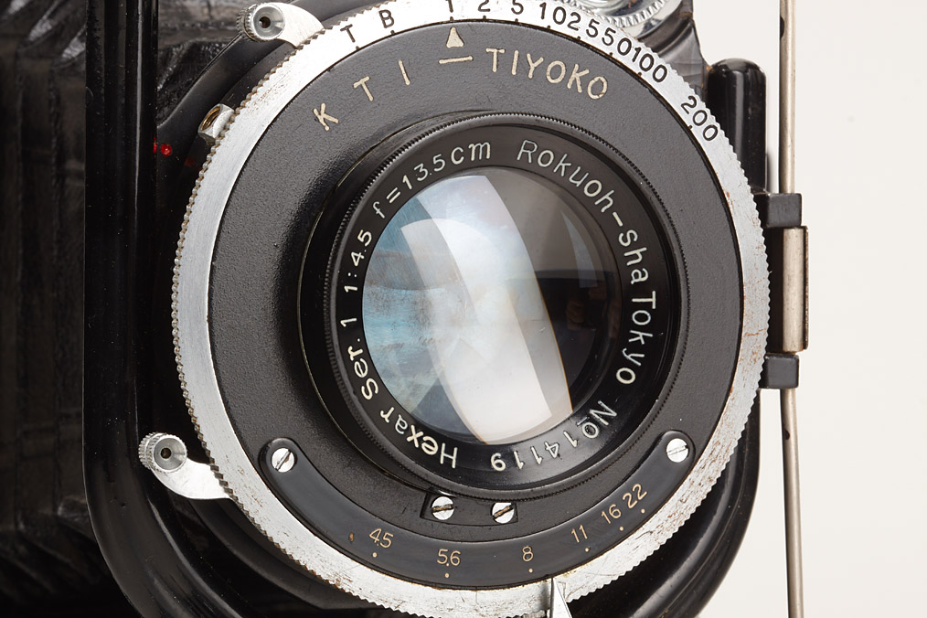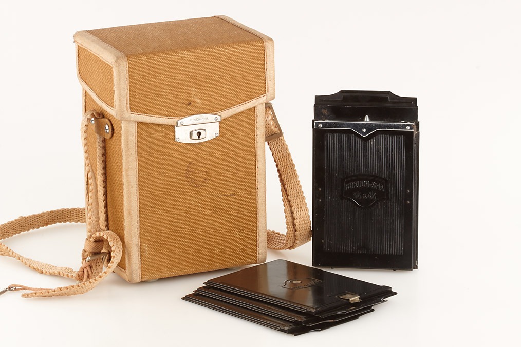 8x10.5cm, very rare camera in near mint condition, manufactured by Konishi & Chiyoda for the Japanese military, Hexar 4.5/13.5cm no.14119 in KTI - TIYOKO shutter, red laurel wreath engraved on the bed and on metal plate inside the case, focusing screen adapter, 4 plate film holders, in matching brown military case