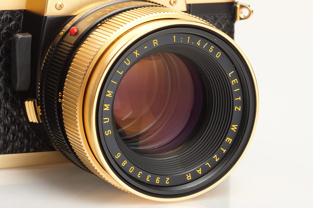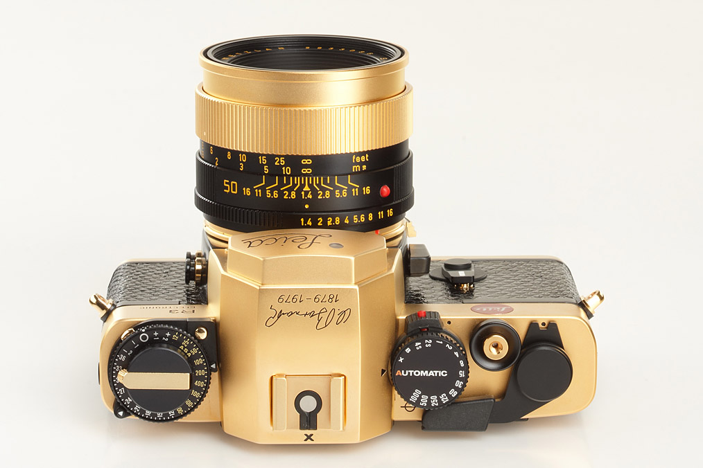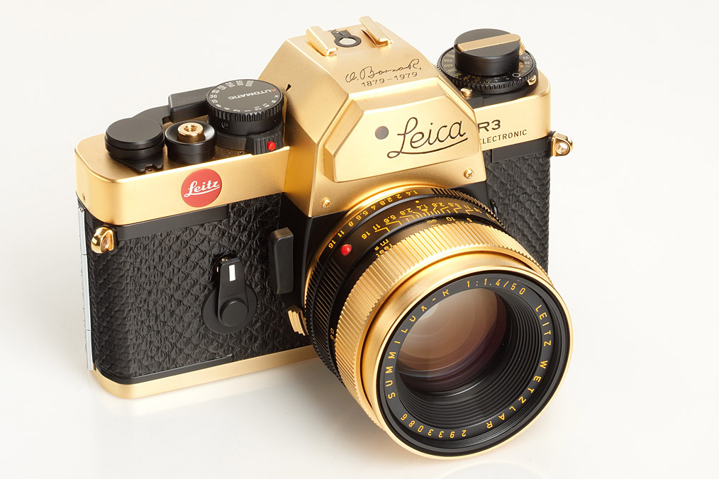 24 carat gold-plated R3 for the 100th anniversary of the inventor of the Leica, Oskar Barnack's birth, special number 100-324, gold plated Summilux 1.4/50mm no.2933086, complete and mint with papers in original maker's box