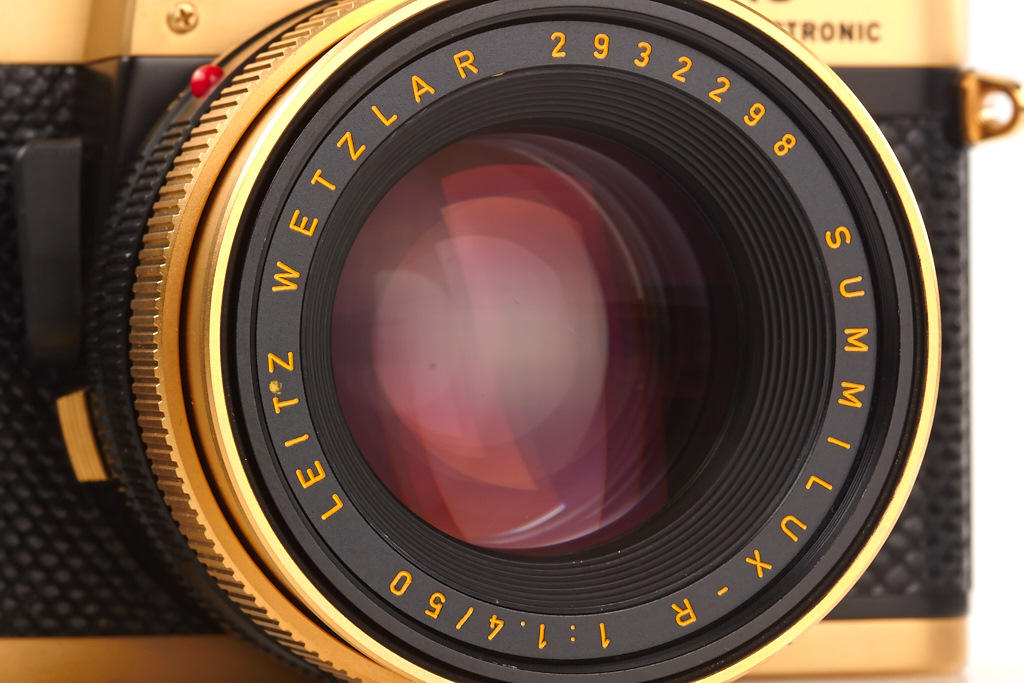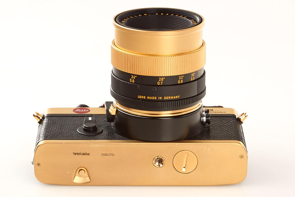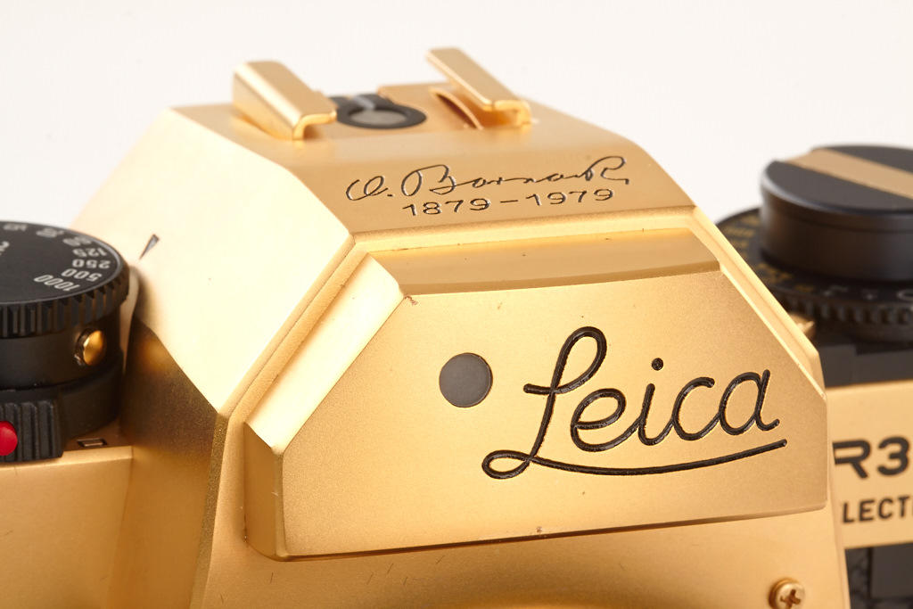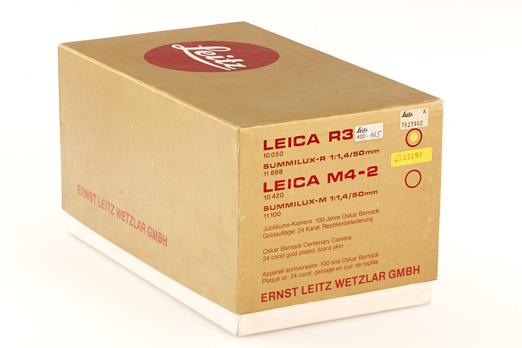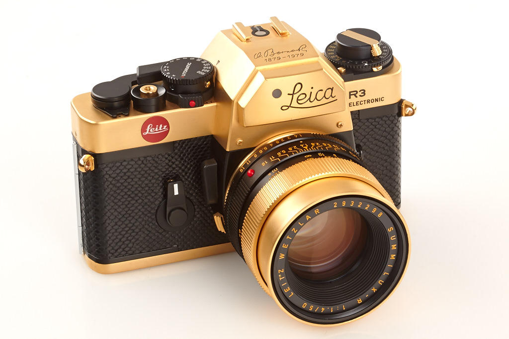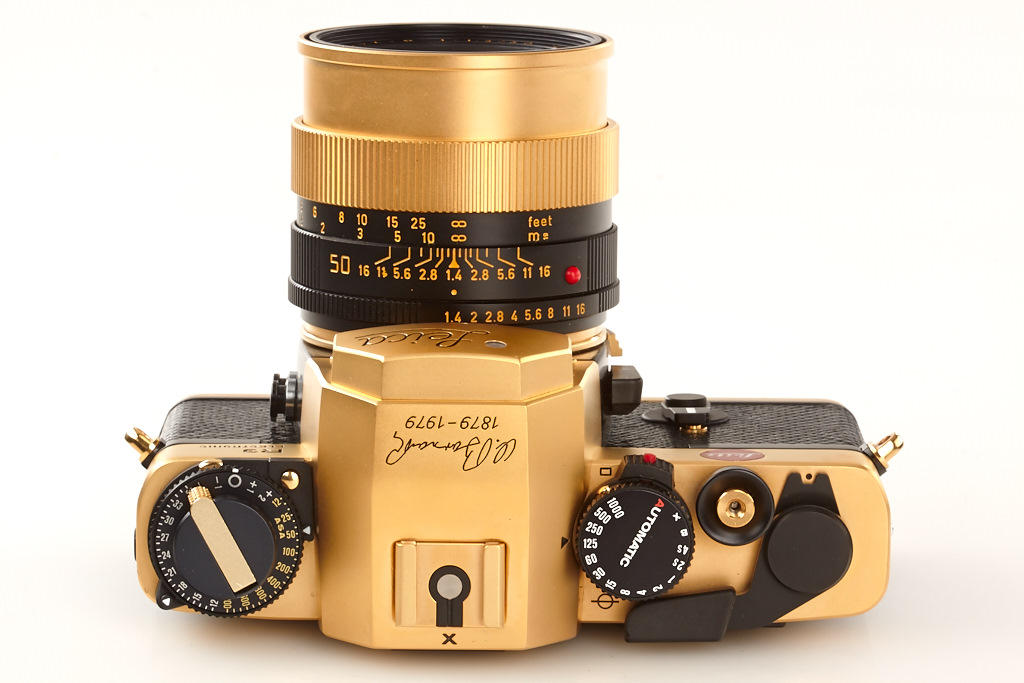 24 carat gold-plated R3 for the 100th anniversary of the inventor of the Leica, Oskar Barnack, special number 100-165, gold plated Summilux-R 1.4/50mm no.2932298, cap, wooden box, certificate, maker's box