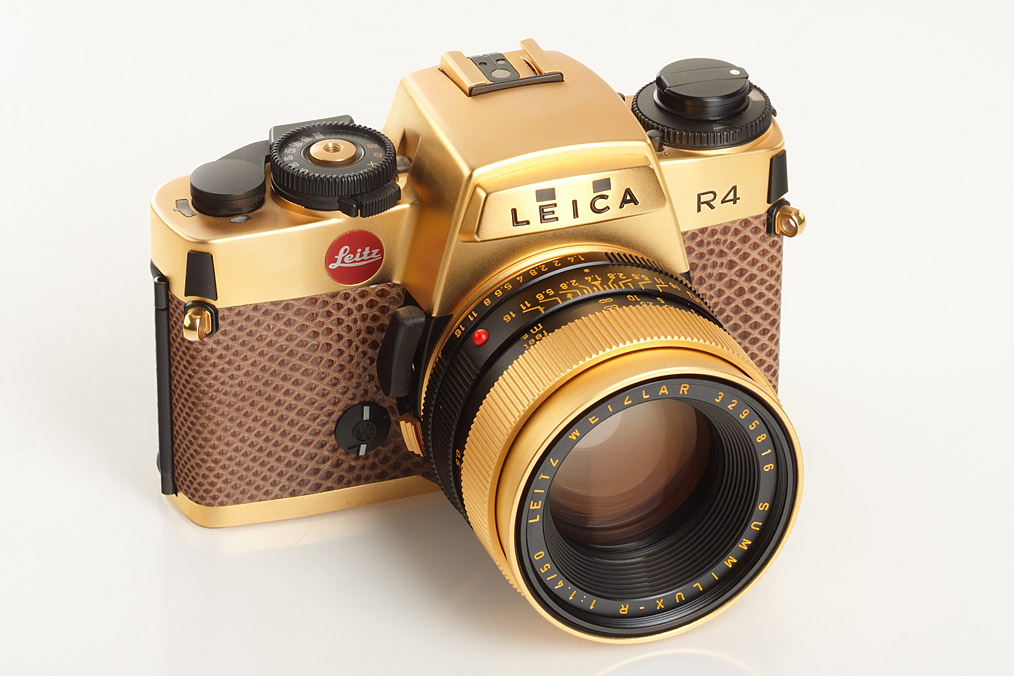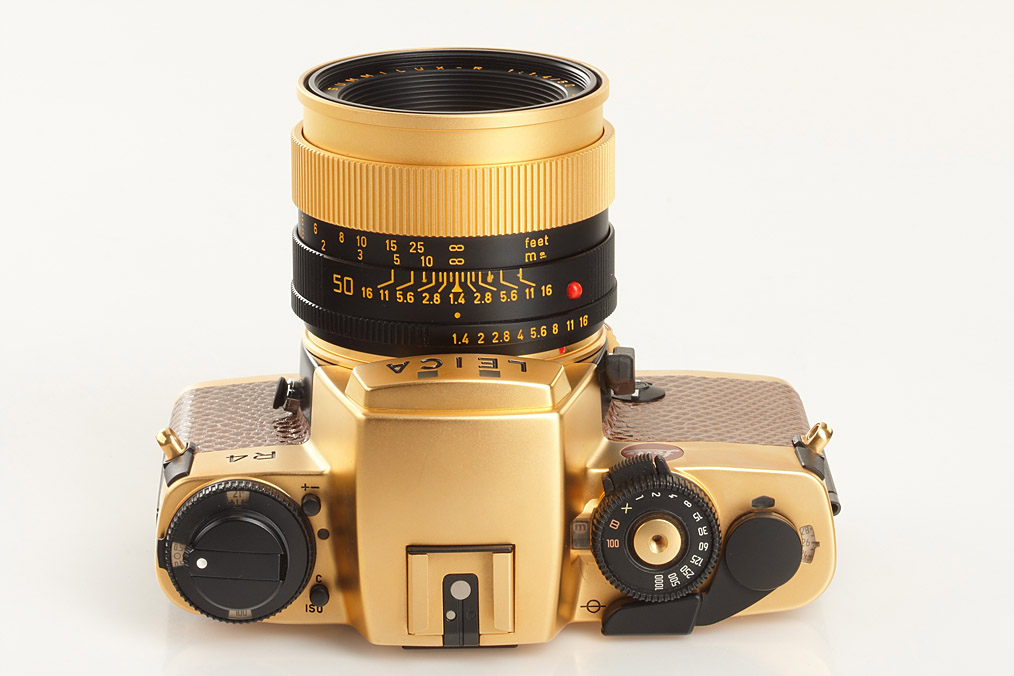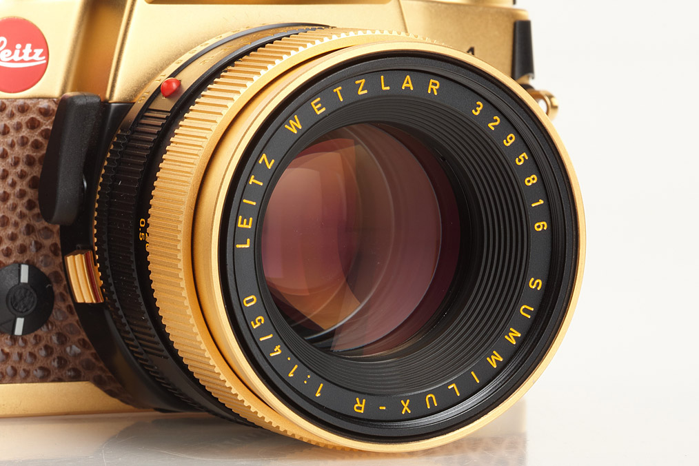 R4 gold edition (special number I-150) with gold plated Summilux 1.4/50mm no.3295816 complete, 100% new with cap, strap, all paper's and wooden box and maker's box