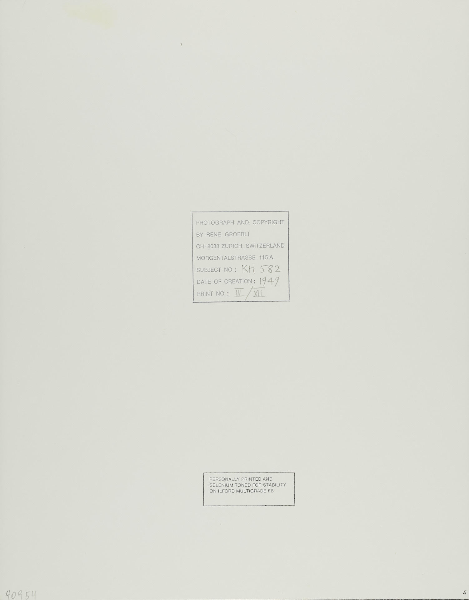 Gelatin silver print, selenium toned, printed by Groebli around 1990 24,6 x 19,6 cm Photographer's copyright stamp with handwritten date on the reverse, edition no. 3/12