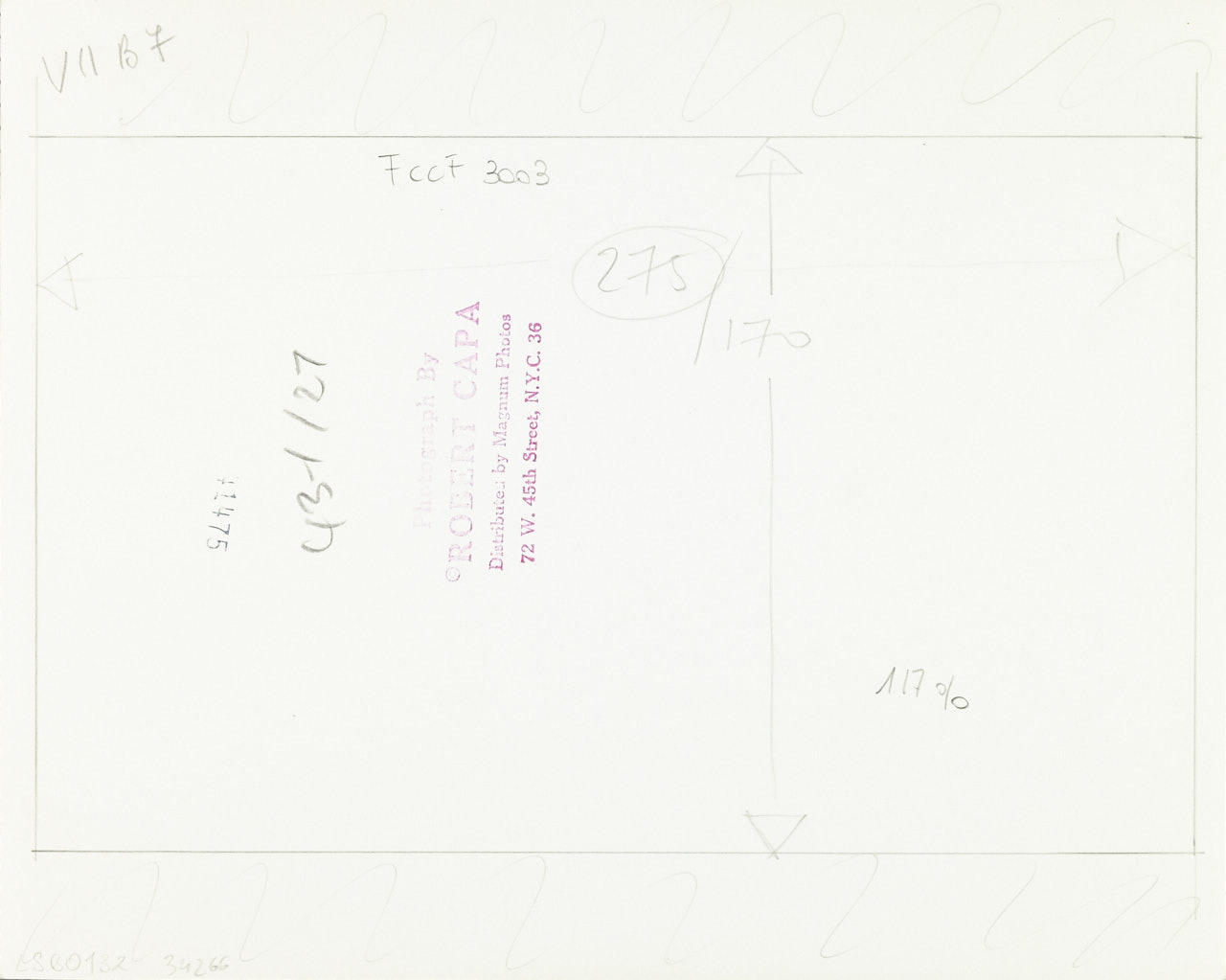 Gelatin silver print, printed in the 1970s 19,1 x 23,9 cm Photographer's agency stamp, numerical stamp, handwritten neg. no. “43-1/27” and various other handwritten notations in pencil on the reverse LITERATURE Richard Whelan (ed.), Robert Capa – The definitive collection, London 2001, p. 340; Robert Capa in Italy, Florence 2013, p. 130-131.