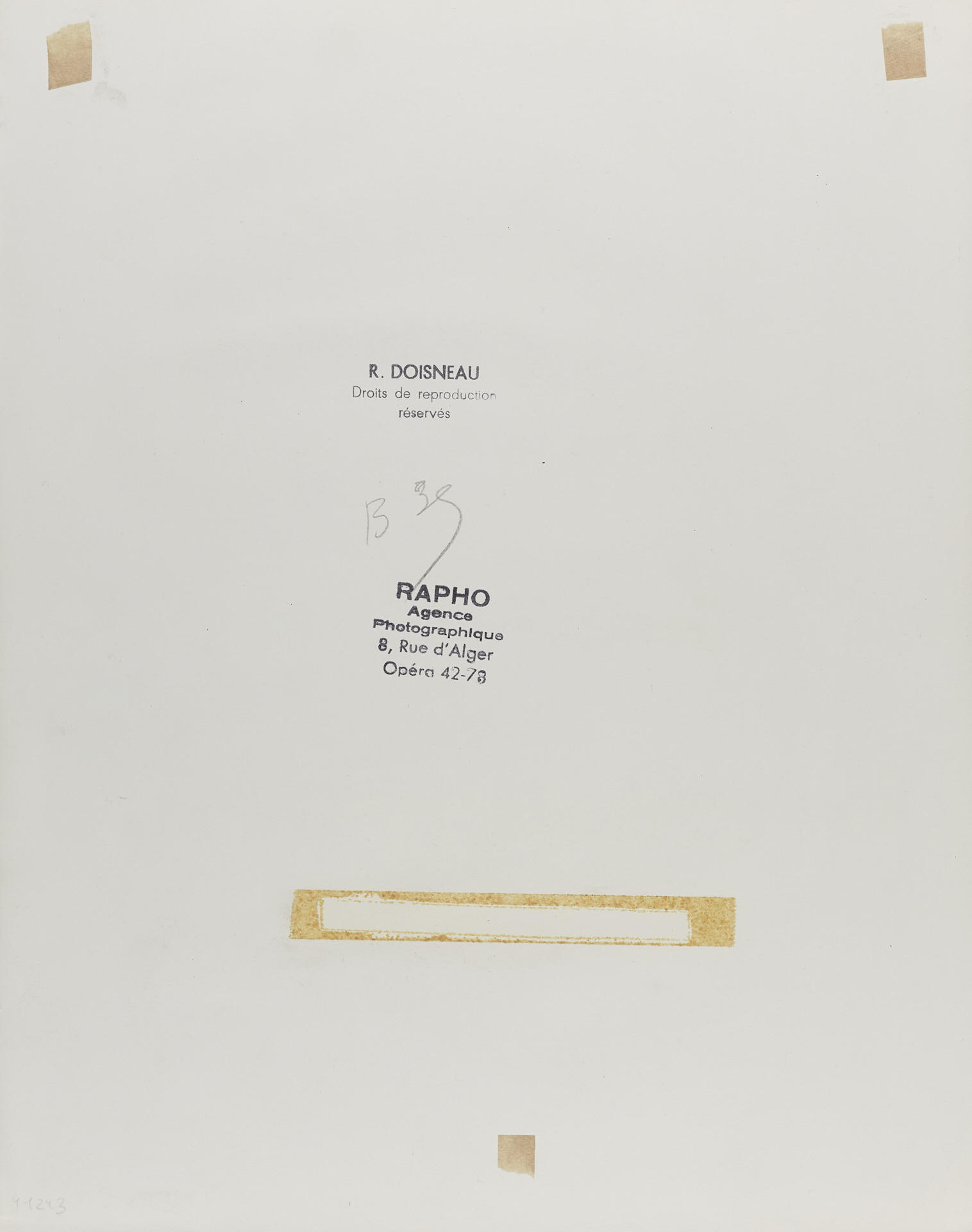 Gelatin silver print, printed in the 1950s 29,2 x 24 cm Photographer's reproduction stamp and agency stamp on the reverse LITERATURE Galerie Claude Bernard (ed.), Robert Doisneau, Paris 2000, pl. 13; Peter Hamilton (ed.), Robert Doisneau. La vie d’un photographe, Paris 1995, p. 59; Drei Sekunden Ewigkeit – Photographien Robert Doisneau, Munich 1980, p. 109.