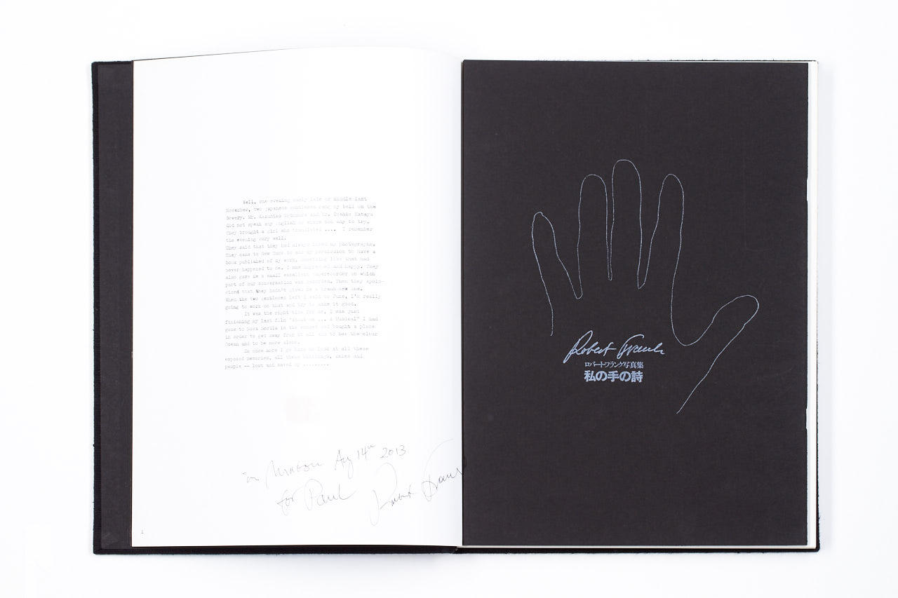 Very rare first Japanese edition, limited to 1.000 copies, signed and dedicated by Robert Frank (in Mubon Aug 14th 2013 for Paul, Robert Frank), design by Kohei Sugiura, 125 pages with 30 pages booklet insert and double gatefold, hardcover, 35,9 x 32,6 cm with full black cloth, and black cloth slipcase with mounted gelatin silver print, issued in two variants (this copy comes with the slipcase variant ‘Platte River Tennessee’, limited to only 500 copies)