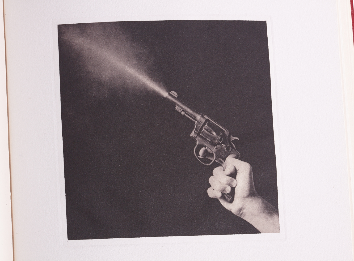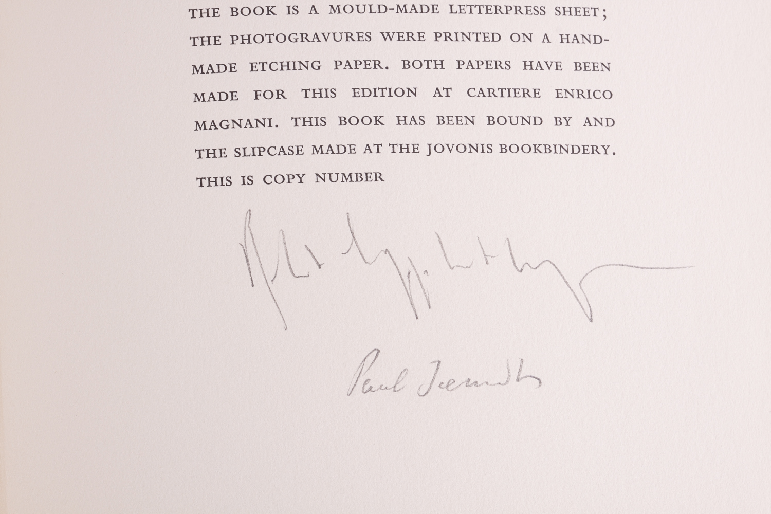 First and only edition, 29,2 x 19,9 cm (11.5 x 7.8 in), illustrated with seven original photogravures by Mapplethorpe, bound in full red morocco, black lettered cover and spine in black cloth slipcase, one of 50 presentation copies signed by Mapplethorpe and Schmidt. The book was beautifully printed by the Wild Carrot Press in Perpetua type on special mould made letterpress paper. The photogravures were printed on handmade etching paper by Jon Goodman.