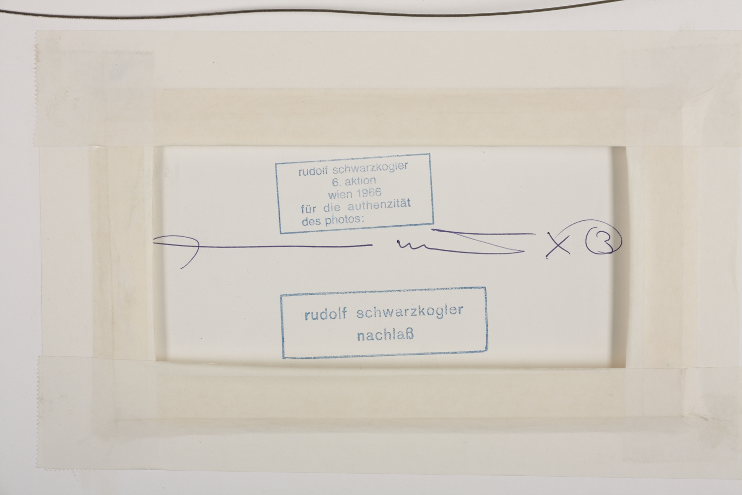 Photo by Michael Epp Gelatin silver print, printed early 1970s, framed 39 x 39 cm (15.4 x 15.4 in) Photographer's “rudolf schwarzkogler, 6. aktion, wien 1966, für die authenzität (sic):” stamp, signed by Hermann Nitsch on the reverse, “rudolf schwarzkogler nachlaß” stamp on the reverse LITERATURE Eva Badura Triska / Hubert Klocker, Rudolf Schwarzkogler. Leben und Werk, Museum Moderner Kunst, Vienna 1992, p. 236.