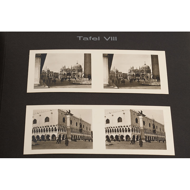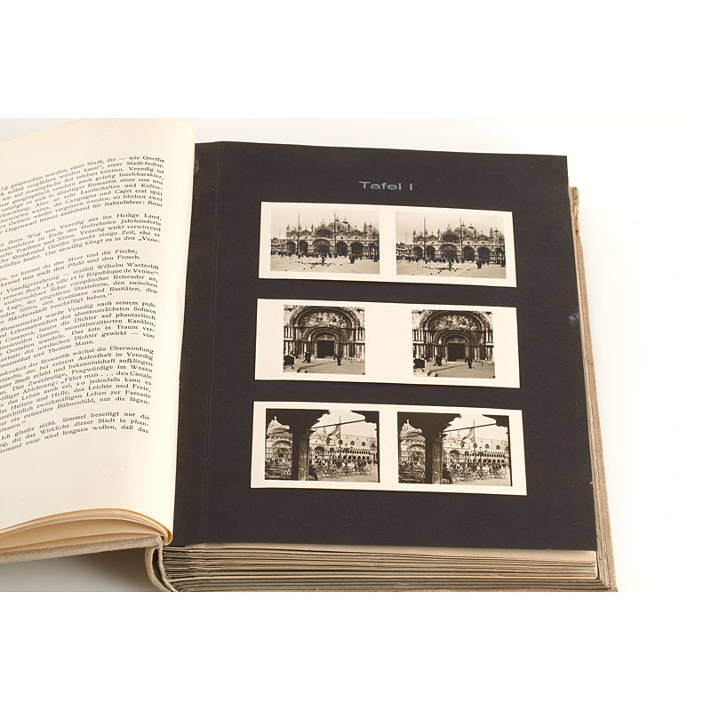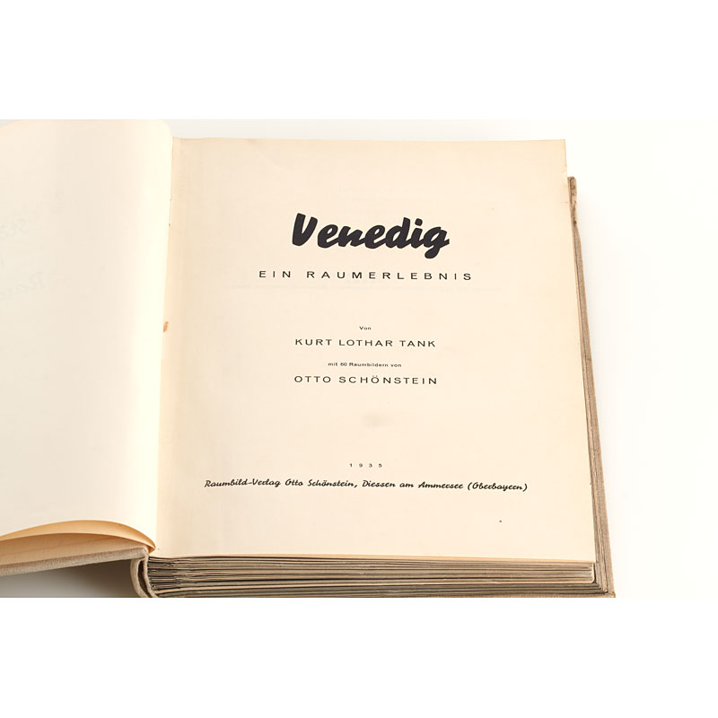 With 60 images and a Zeiss stereo viewer, 107 pages, 20 tables. The first Raumbild-Band from Raumbild-Verlag Otto Schönstein, Herrsching / Ammersee, published 1935. The photos were taken in 1932 on Otto Schönstein's honeymoon. The journey by train and boat led the couple through the Brenner Pass to Bolzano, Venice, Chioggia (30 km from Venice), Ancona, Bari and Sicily (Catania, Taormina, Nicolosi).