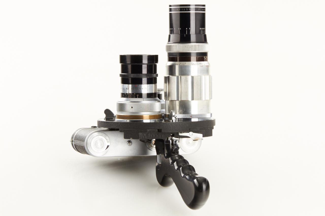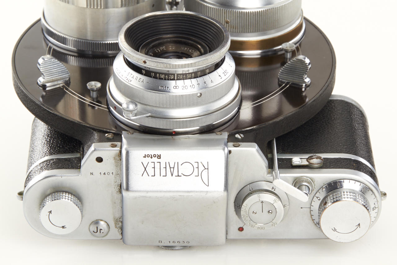 prototype of the famous Rotor with early series 1000 body (prism engraved 'RECTAFLEX rotor B.16630') with 3 lenses: Angenieux Type Z2 2.9/50mm no.140550, Angenieux Type Y2 3.5/135mm no.195574, Tessar 3.5/7.5cm no.412320, with grip - very interesting device, recently discovered