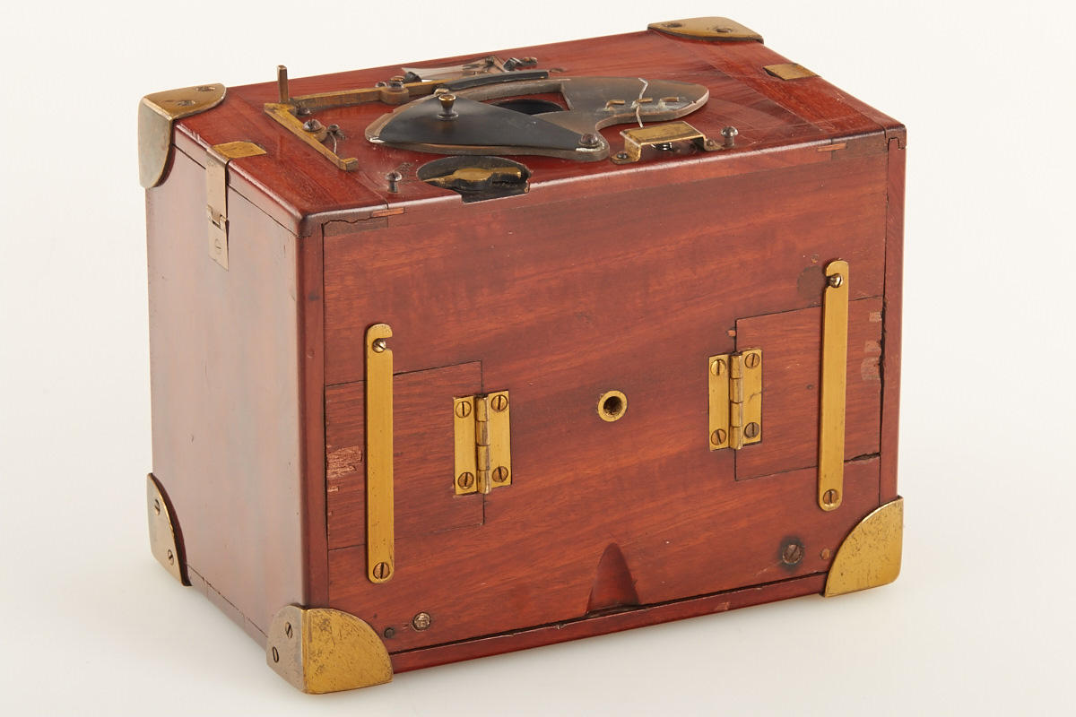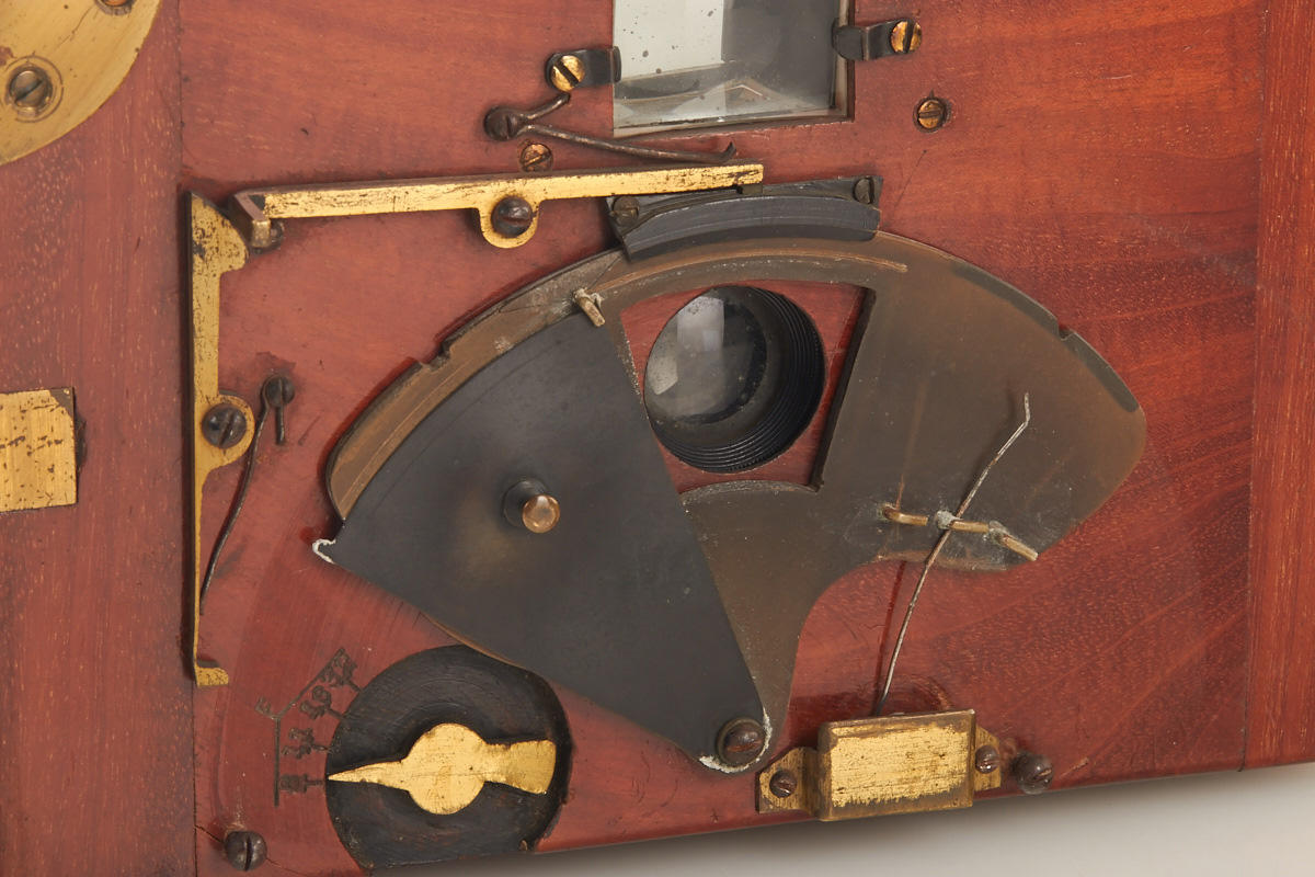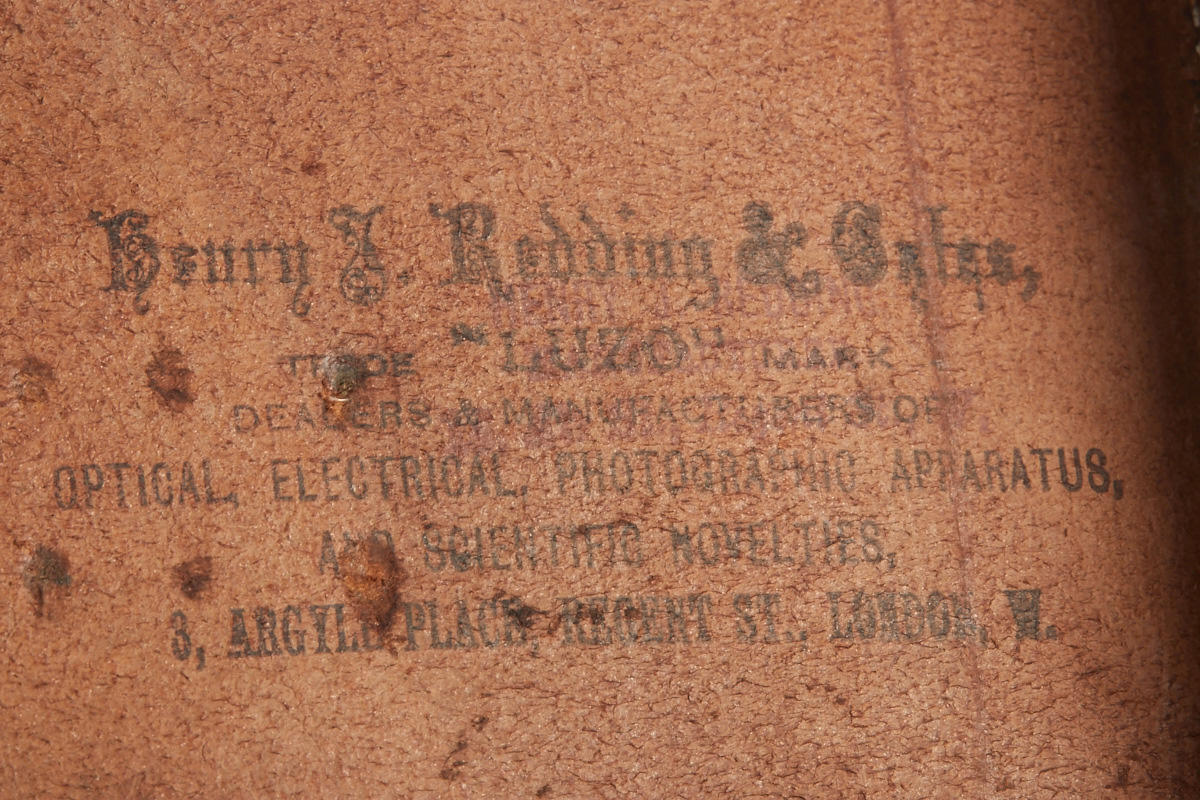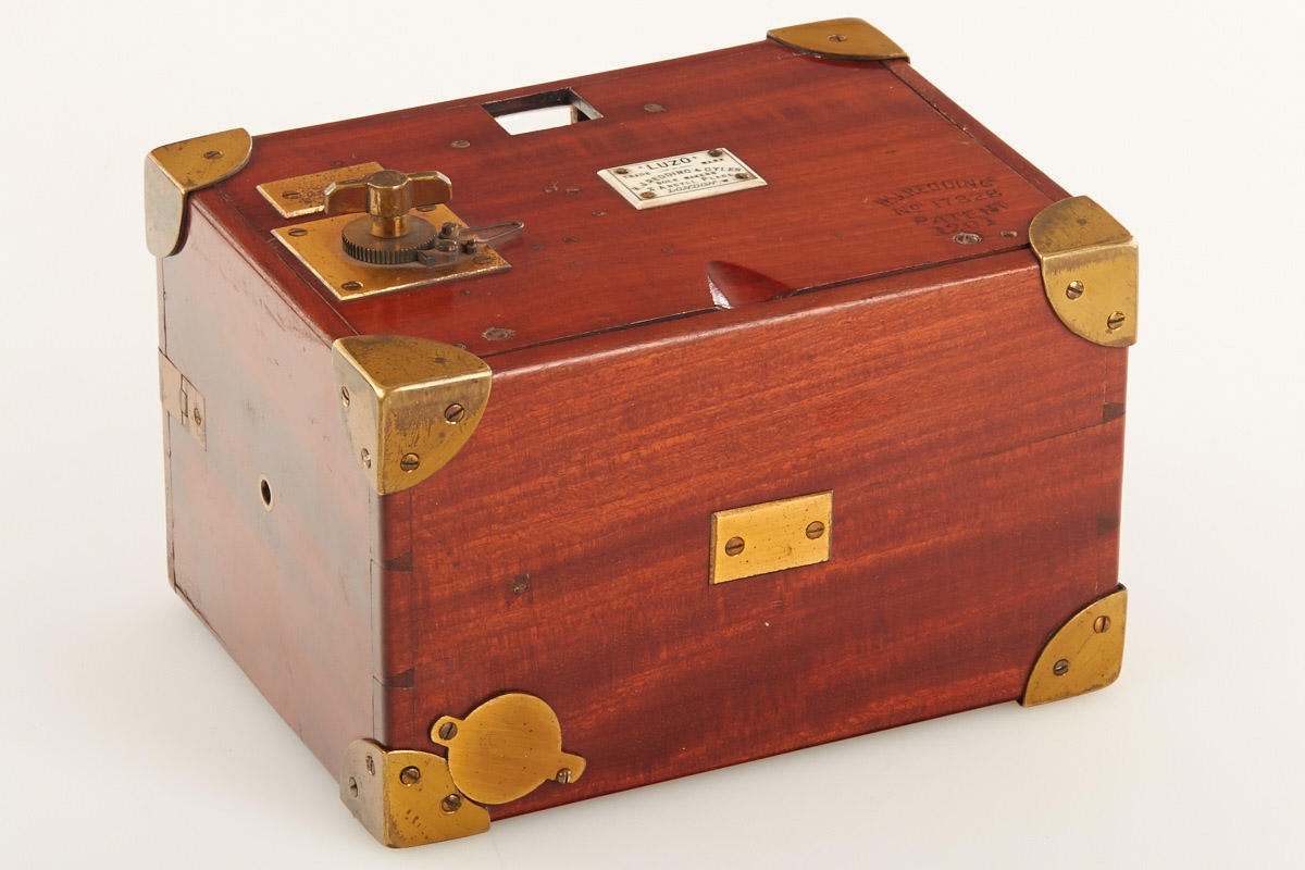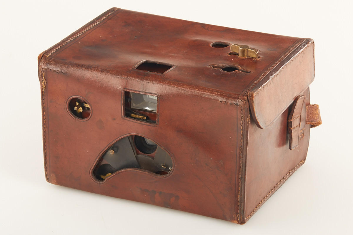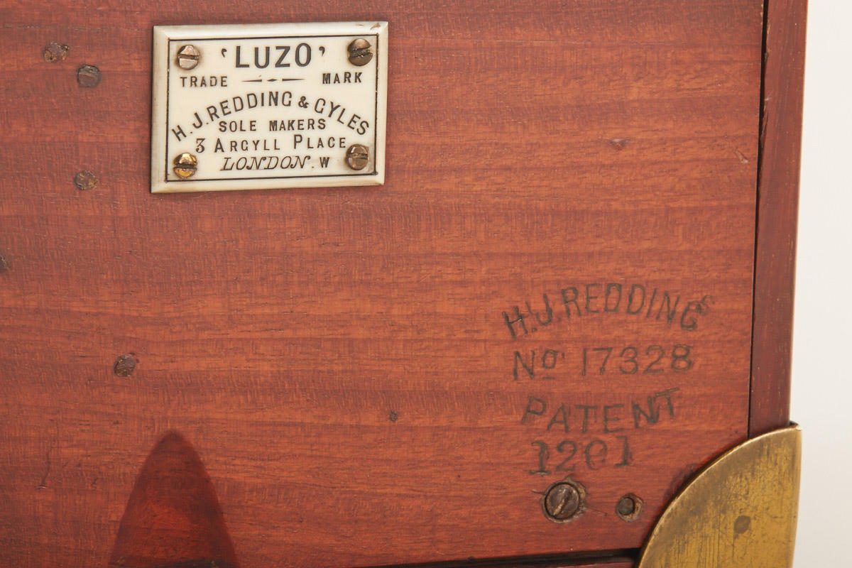 for roll film 3 1/4 x 4 1/4 inch, very rare mahogany box-camera, brass fittings, second version with rectangular viewfinder, film counter, fixed focus lens, label 'LUZO TRADE MARK H.J.REDDING & Co. 3 ARGYLL PLACE, REGENT ST., LONDON, W., the first English roll film camera in original condition with matching leather case