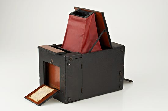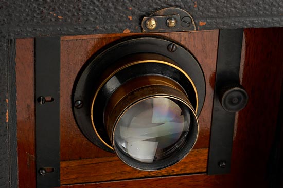 Reflex Camera Co., Yonkers, NY, U.S.A., for exposures 4 x 5" on dry-plates, the black leather-covered mahogany body with red leather focusing hood, Taylor & Hobson Ltd. Cooke Anastigmat Series IV 5.6/6" lens no.28958, in front of a focal plane shutter, speeds 1/10 to 1000 sec. (optional fan air-brake for speeds 1 sec. to 1/10 sec.), storage space at back for plate holders. Ex Spira Collection. Auer No. 1015 & 1017. An early American single-lens-reflex camera.