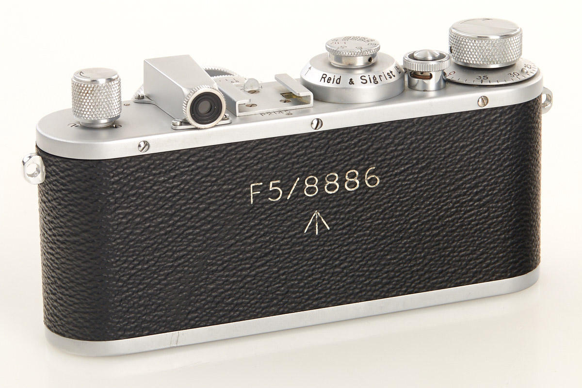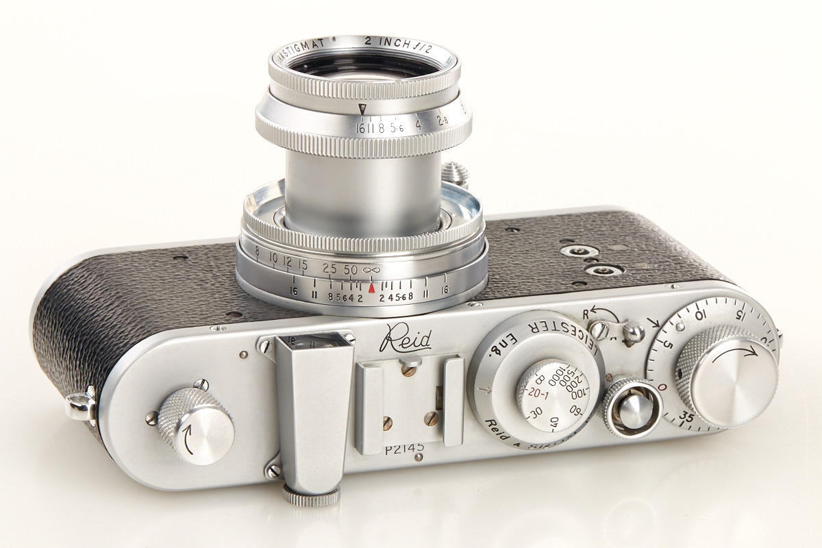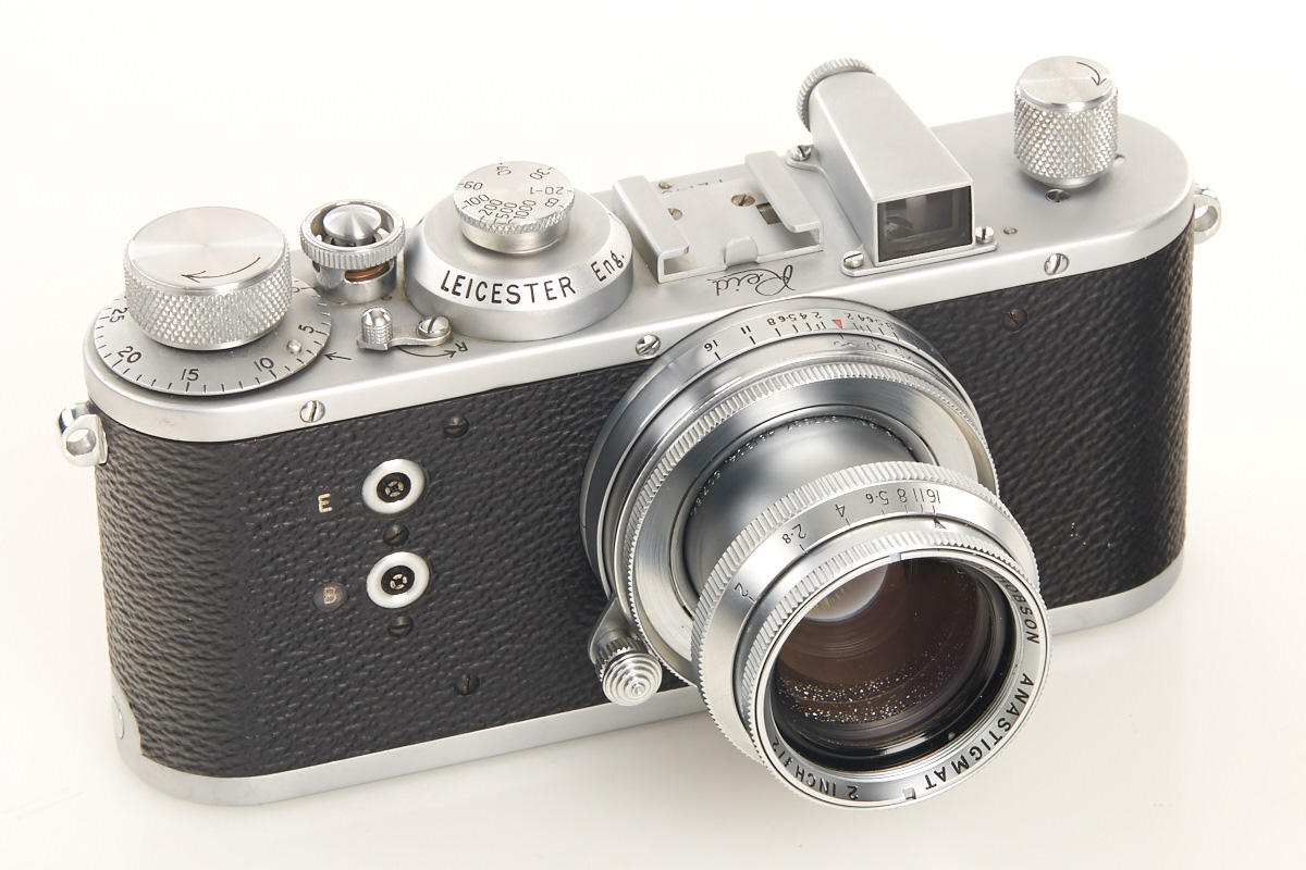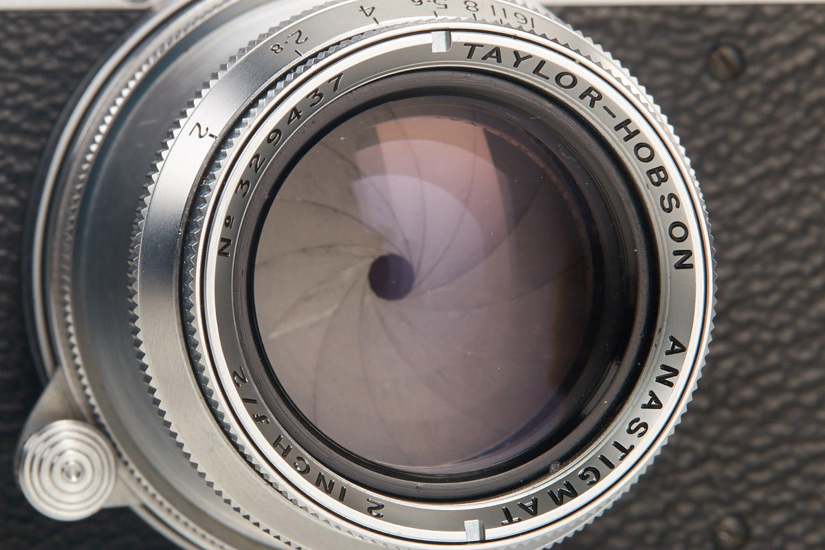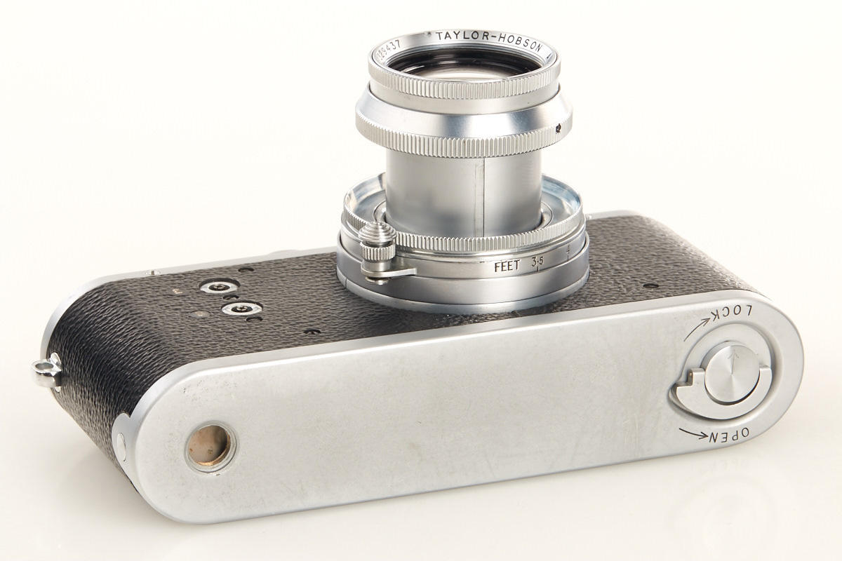 English Leica copy in near mint condition and good working order, with mint Taylor-Hobson Anastigmat 2/2" no.329437 (cap), body marked F5/8886 arrow up' in white letters on back leather covering, grey W/D aftermarket maker's box, with matching Dallmeyer Dalrac 4.5/13.5cm no.544772 engraved 'W6/WF/0562' (both caps)