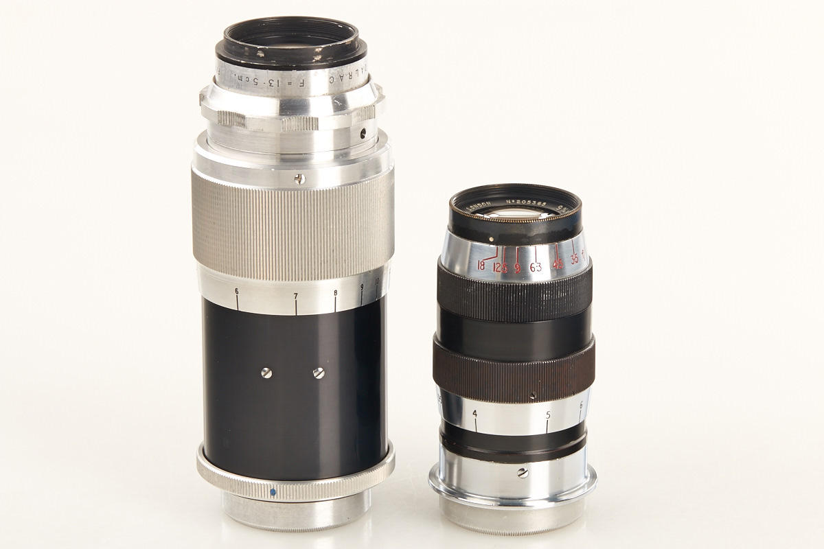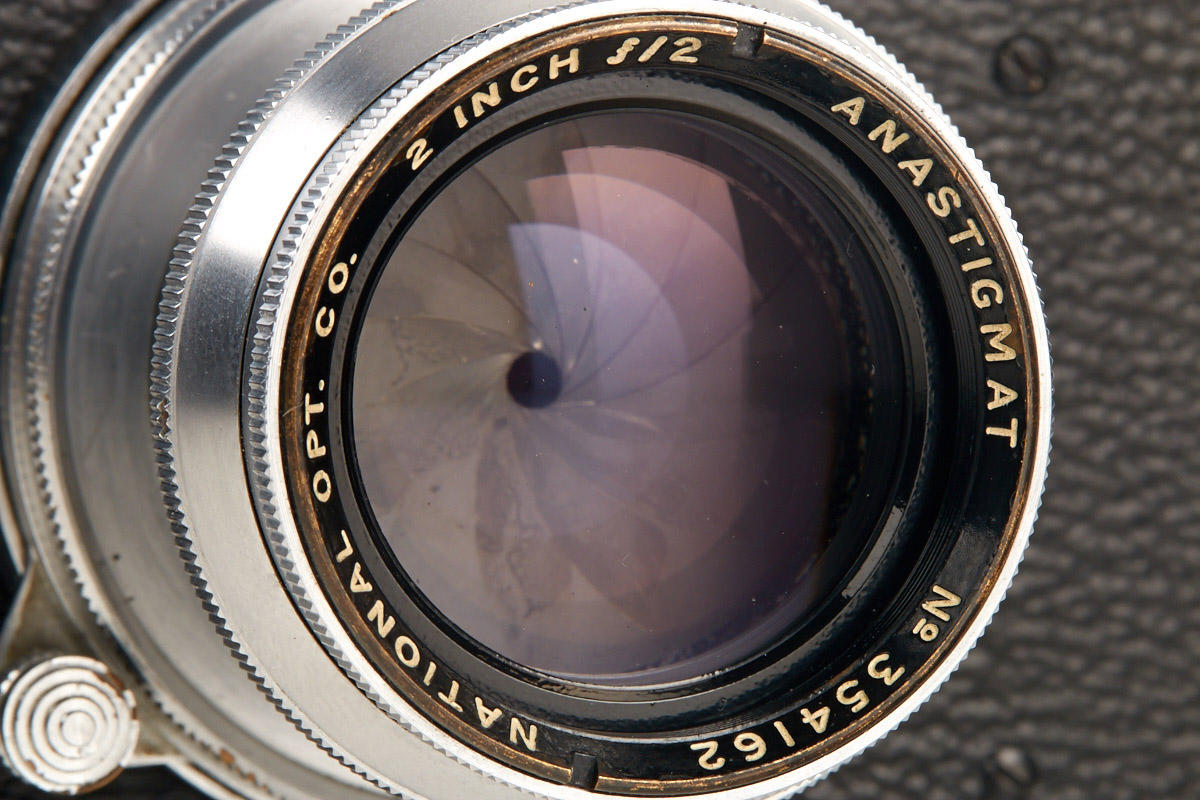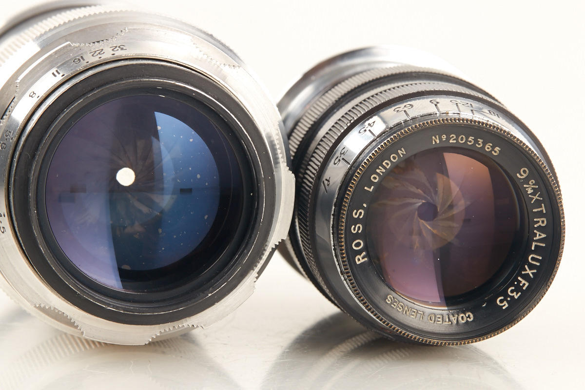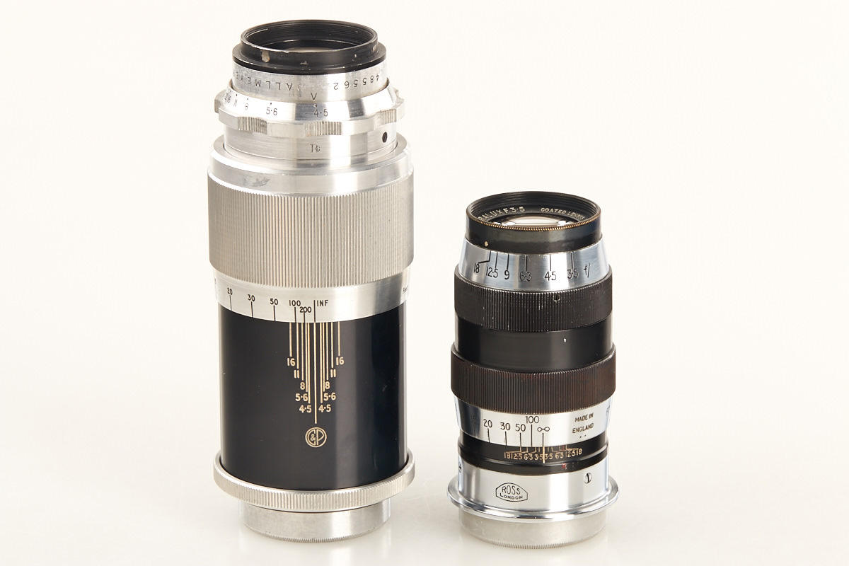 in very fine condition and good working order, with quite rare National Opt. Co. Anastigmat 2/2" no.354162 (good optics, original cap and hood), black/silver maker's box, RF coupled Ross XTRALUX 3.5/9cm no.205365 (coated lenses, both original caps), Dallmeyer Dalrac 4.5/13.5cm no.485562 (cond. C, cleaning marks, caps)