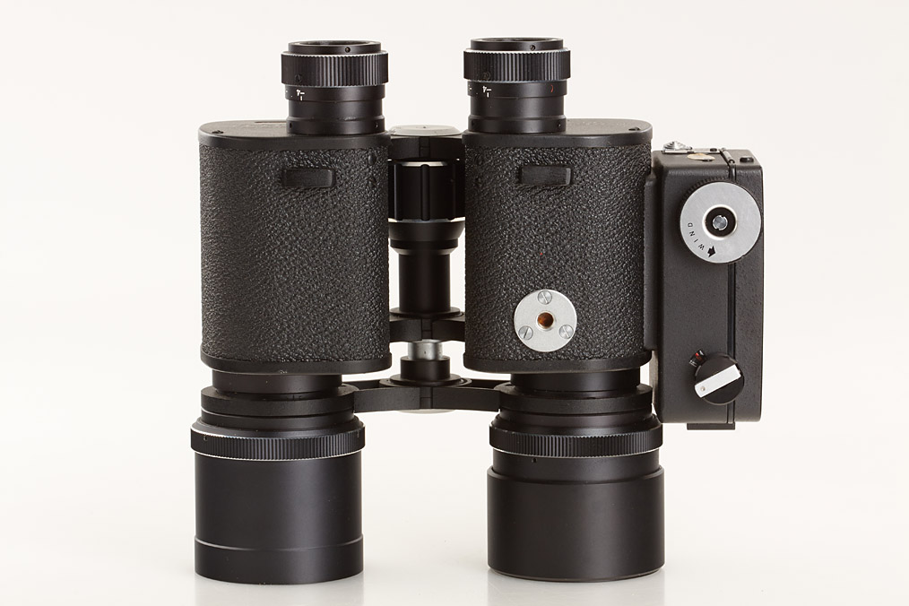 Nicnon binocular camera distributed by Ricoh, for half frame exposures on 35mm film, Rikenon 3.5/165mm no.201146, clockwork motor drive and 7x50 magnification binoculars, in mint condition