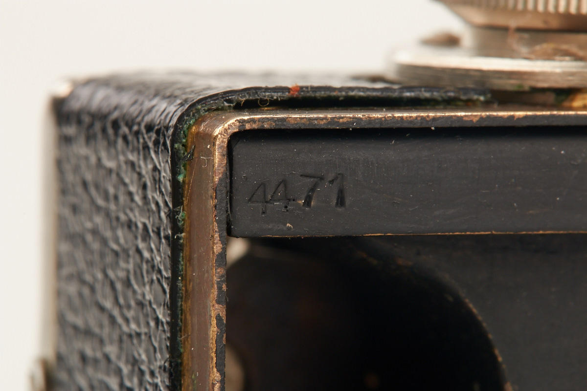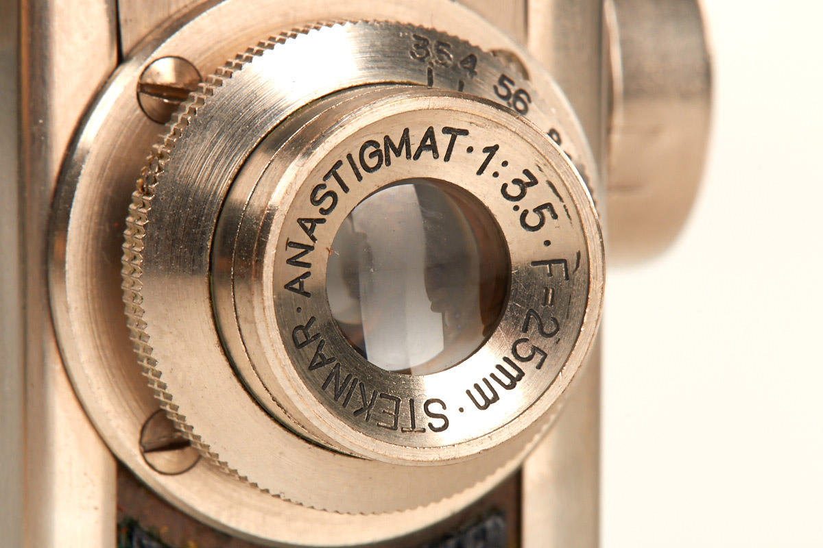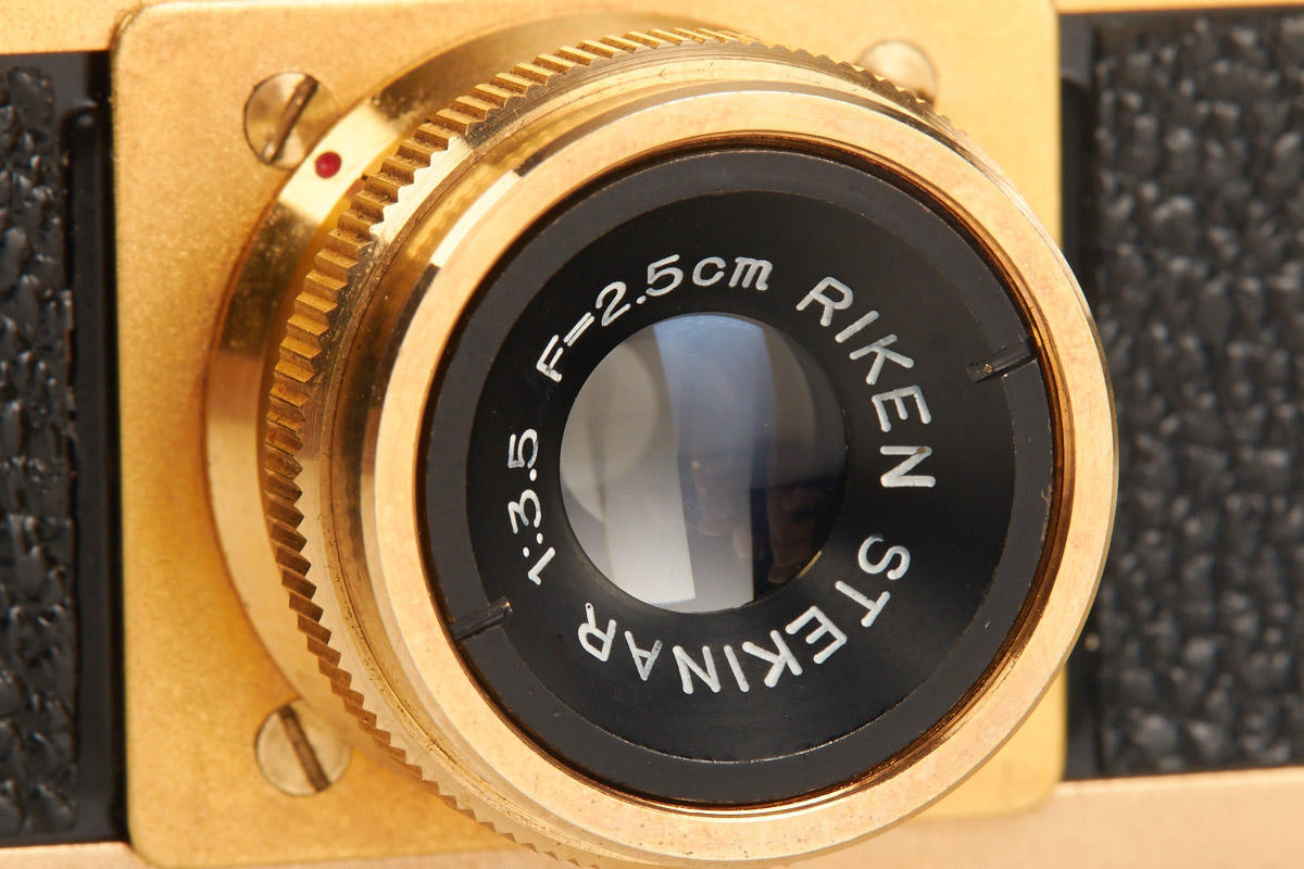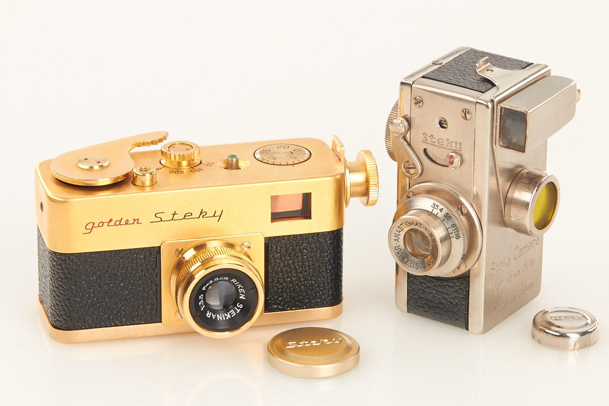 two Steky cameras in excellent condition: (1) later variation of the nickel-plated original Steky no.4471, stamped on the side 'MADE IN JAPAN', uncommon camera for 16mm film, mint with case, spool, cap and maker's box, (2) mint Ricoh Golden Steky no.4339 with cap and instructions