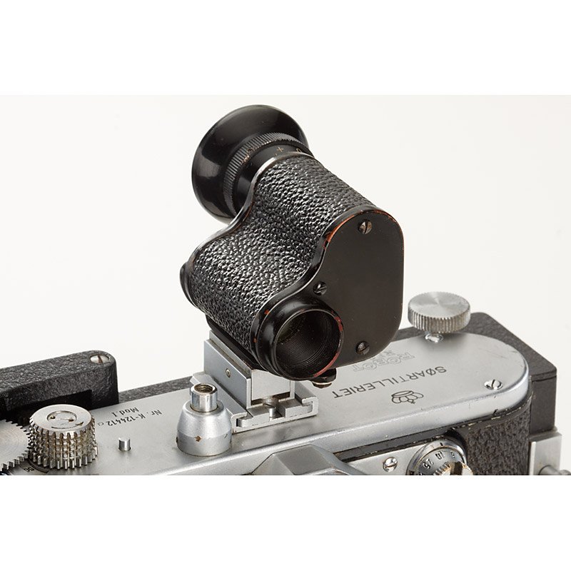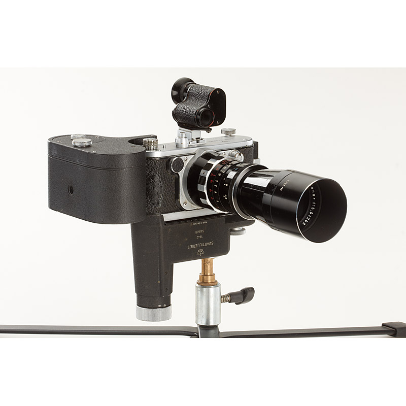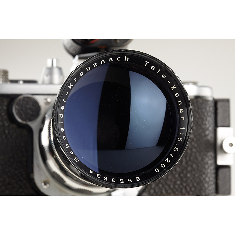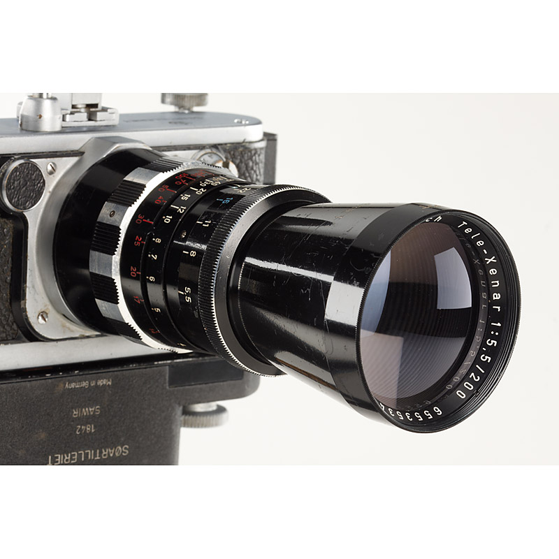 rare military camera with Tele-Xenar 5.5/200mm no.6553534, monocular finder, 10m magazine SATIN no.1377, spring-wound motor drive SAWIR no.1842 (SOARTILLERIET and one crown engraved on top-plate, lens barrel and motor), camera needs service