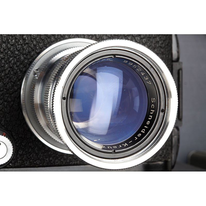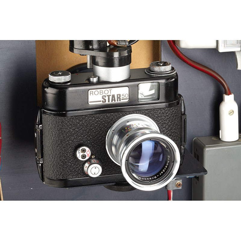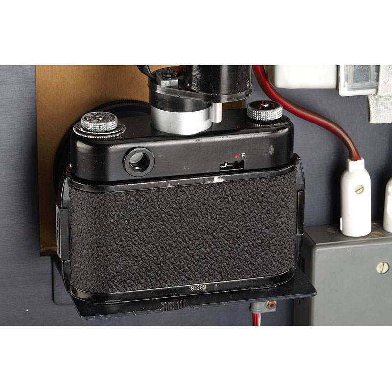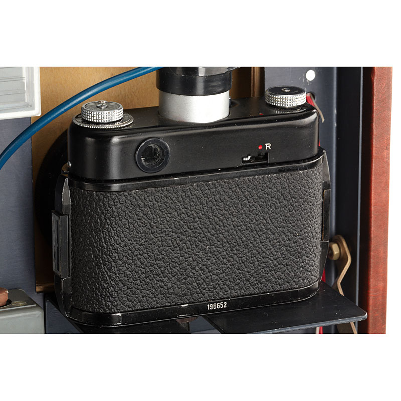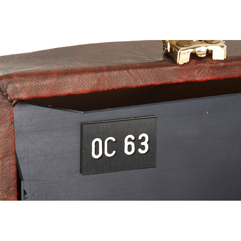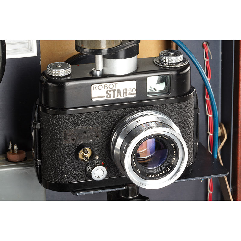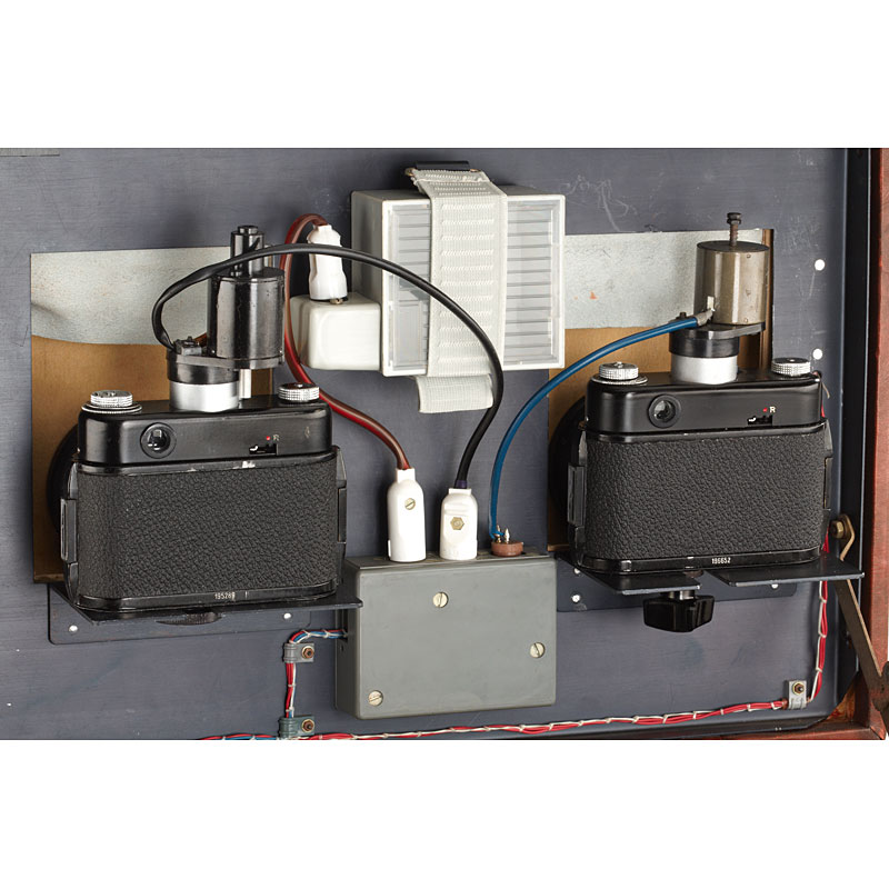 faux leather attaché case with two built-in Robot Star 50 cameras with fully electric release, equipped with Xenon 1.9/40mm no.12136637 and Tele-Xenar 3.8/75mm no.9952437, taking pictures through the front door when the front lid is opened. A highly sophisticated design, technically superb and original spy outfit used by the East German Secret Service STASI