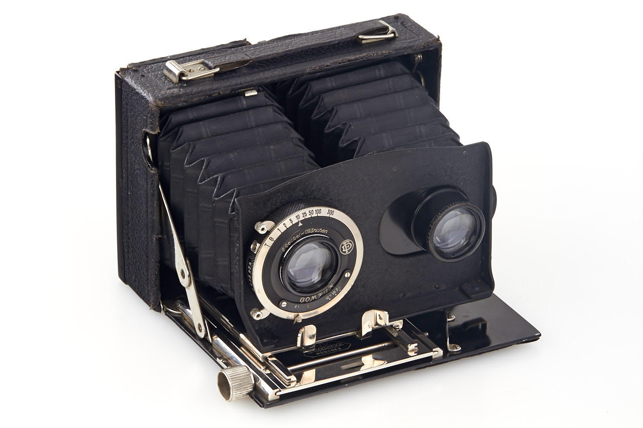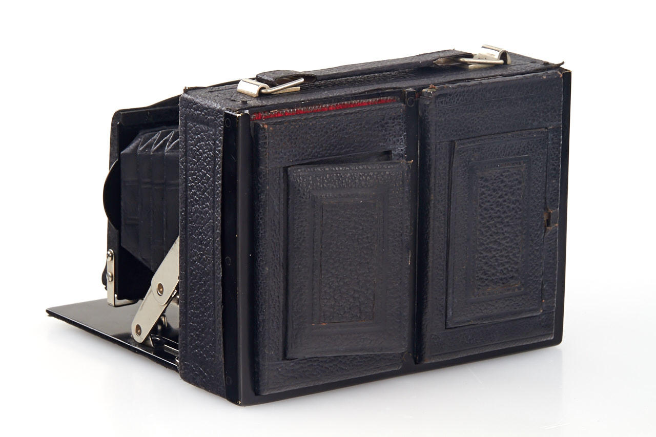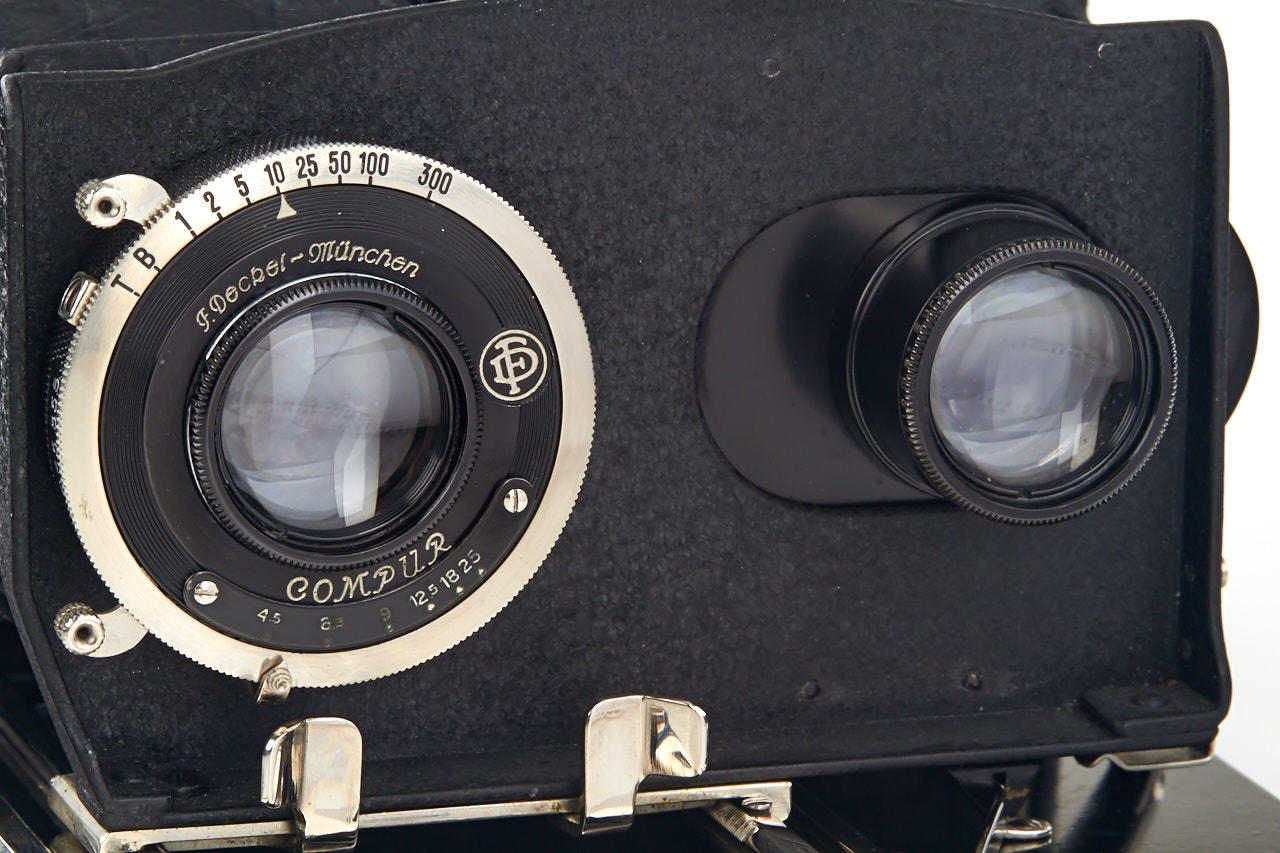 formerly unknown horizontal twin-lens (non-reflex) folding bed camera for 4.5x6cm exposures on plates, made by Rodenstock or Eder Präzisionskamera, Munich (the camera shows some small differences to the Eder Patent camera), engraved with Rodenstock logo on the folding bed, equipped with Rodenstock Doppel Anastigmat Eurynar 4./9cm no.445757 and no.445728 as taking and viewing lens, with two ground glass plates on the back, in overall very good condition