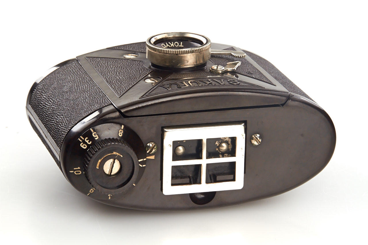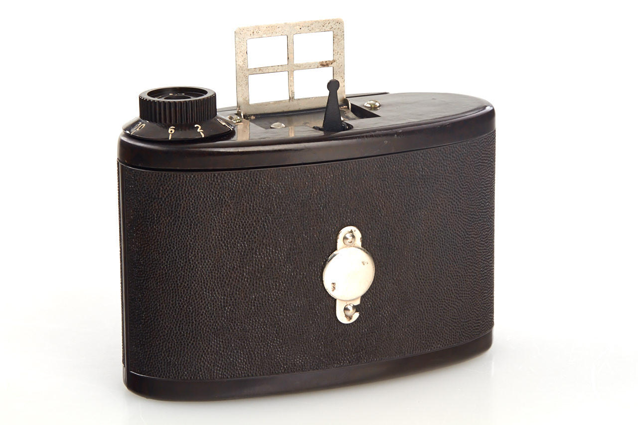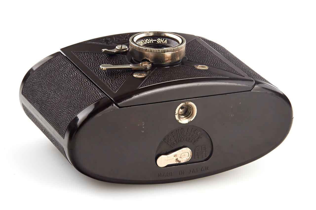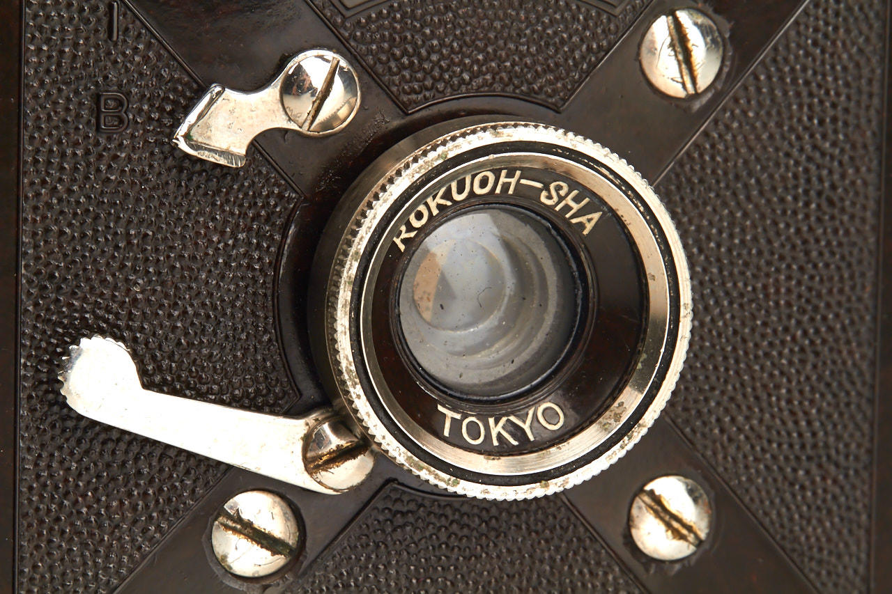 rare Japanese Bakelite camera for 4x5cm exposures on 127 film, Rokuoh-Sha meniscus lens, with original everready case, in excellent condition