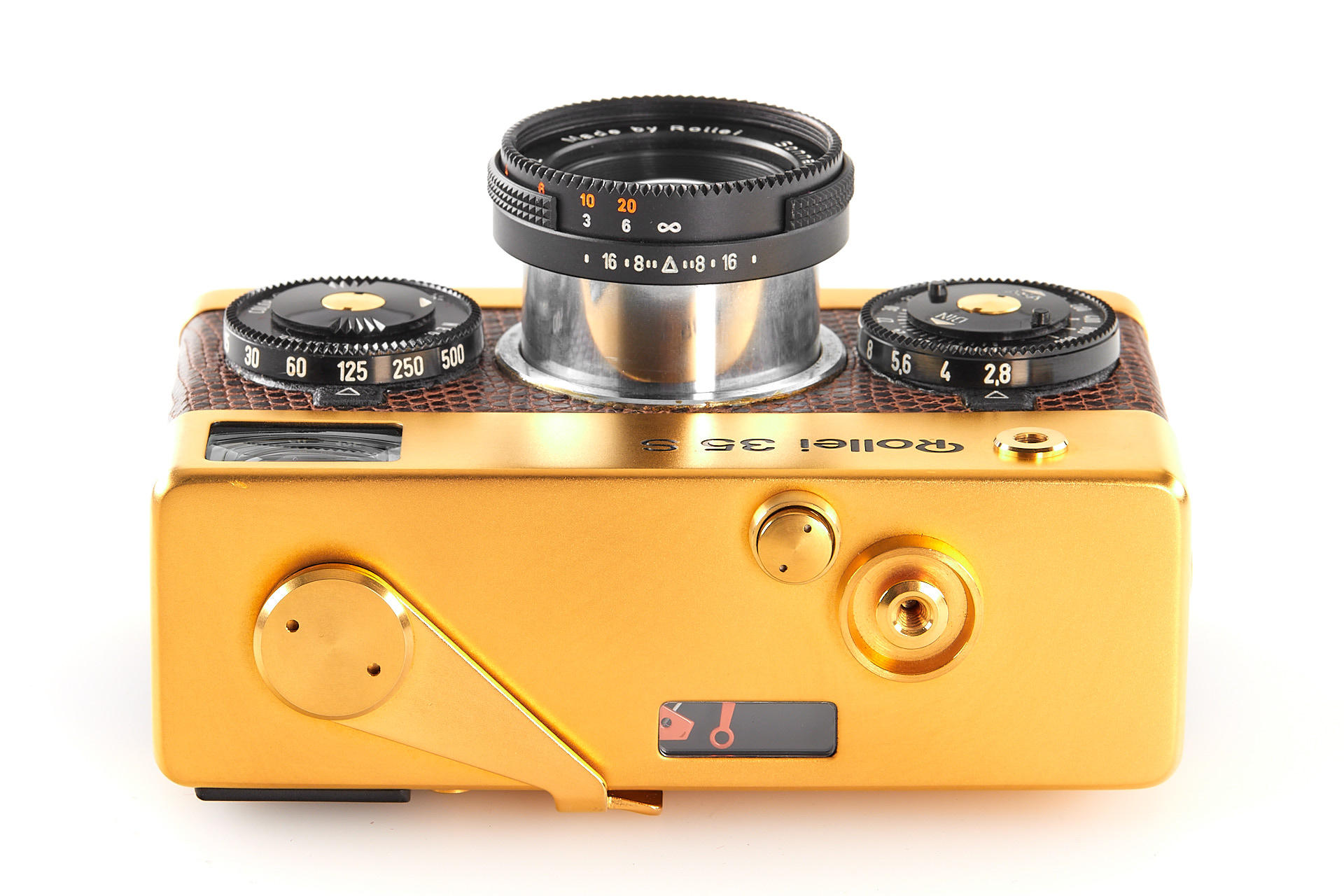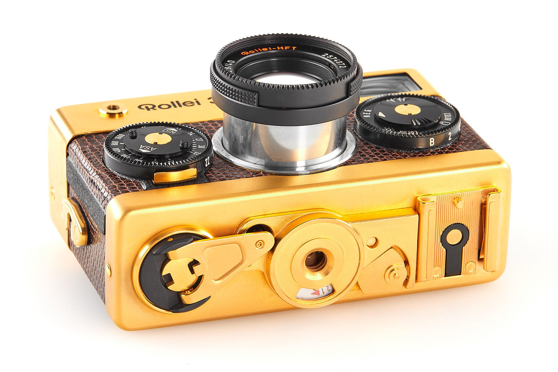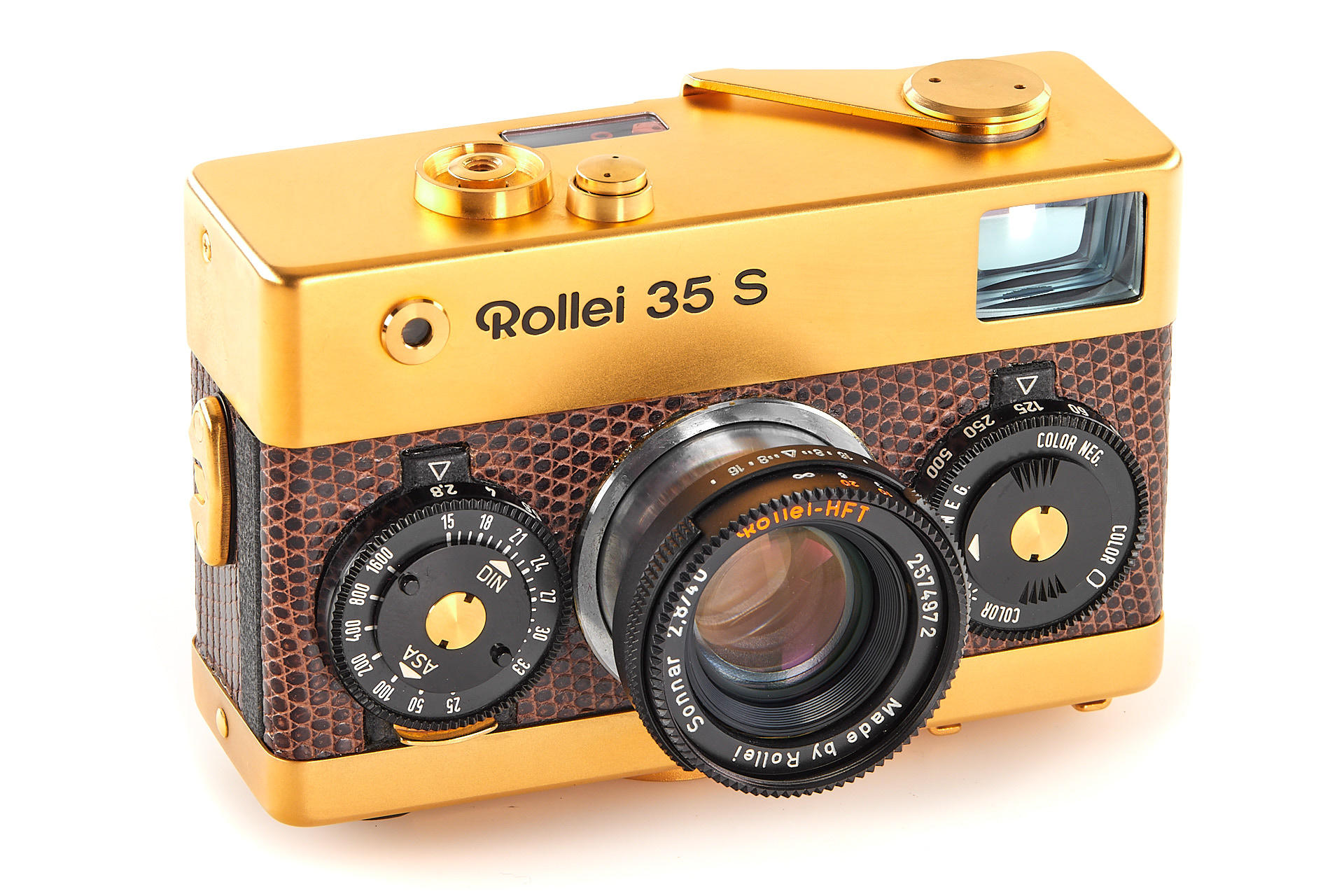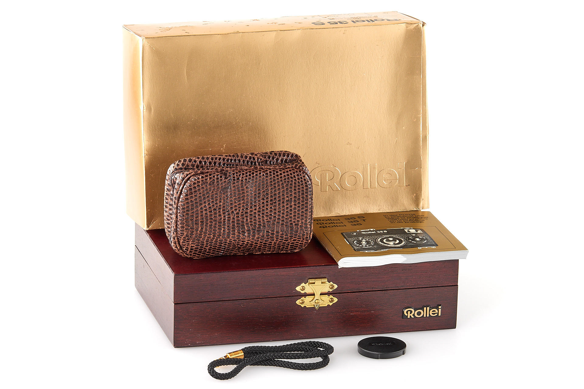 gold-plated Rollei 35S from a special edition of 1500 cameras, issued to commemorate 60 Years of Rollei, Sonnar 2.8/40mm no.2574972, with lizard skin case, strap, instructions, wooden presentation box and outer box