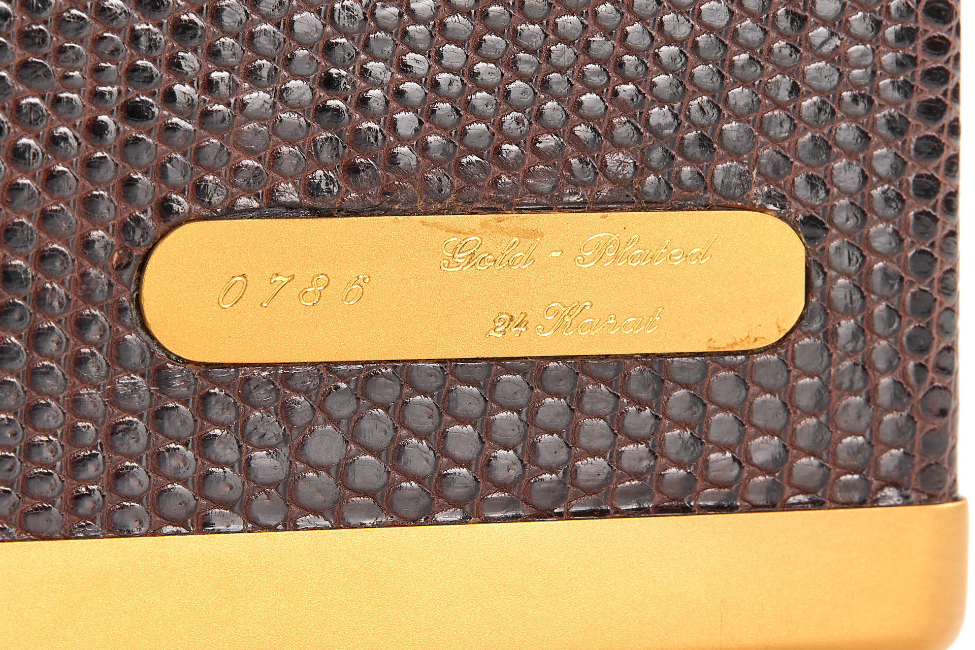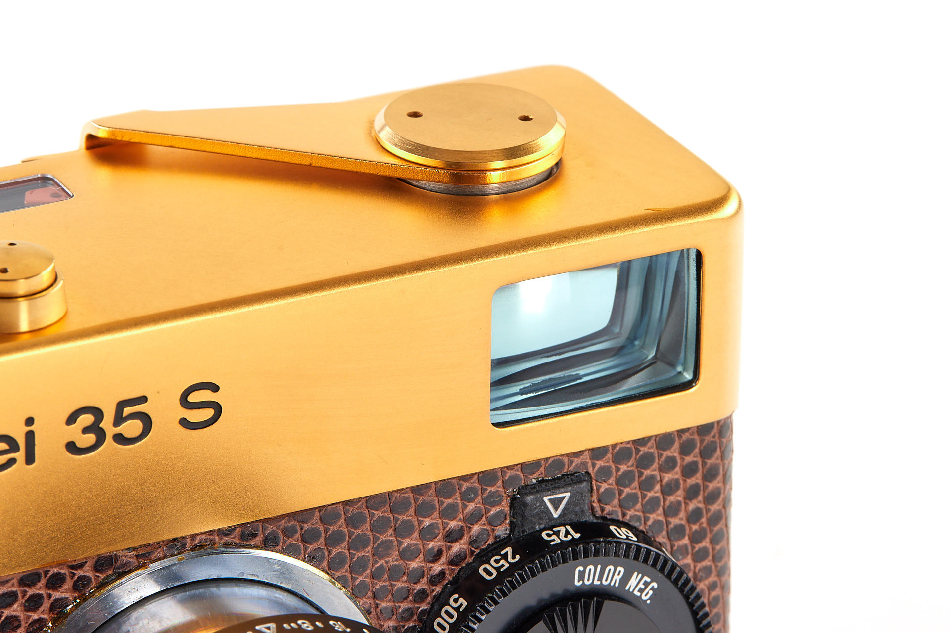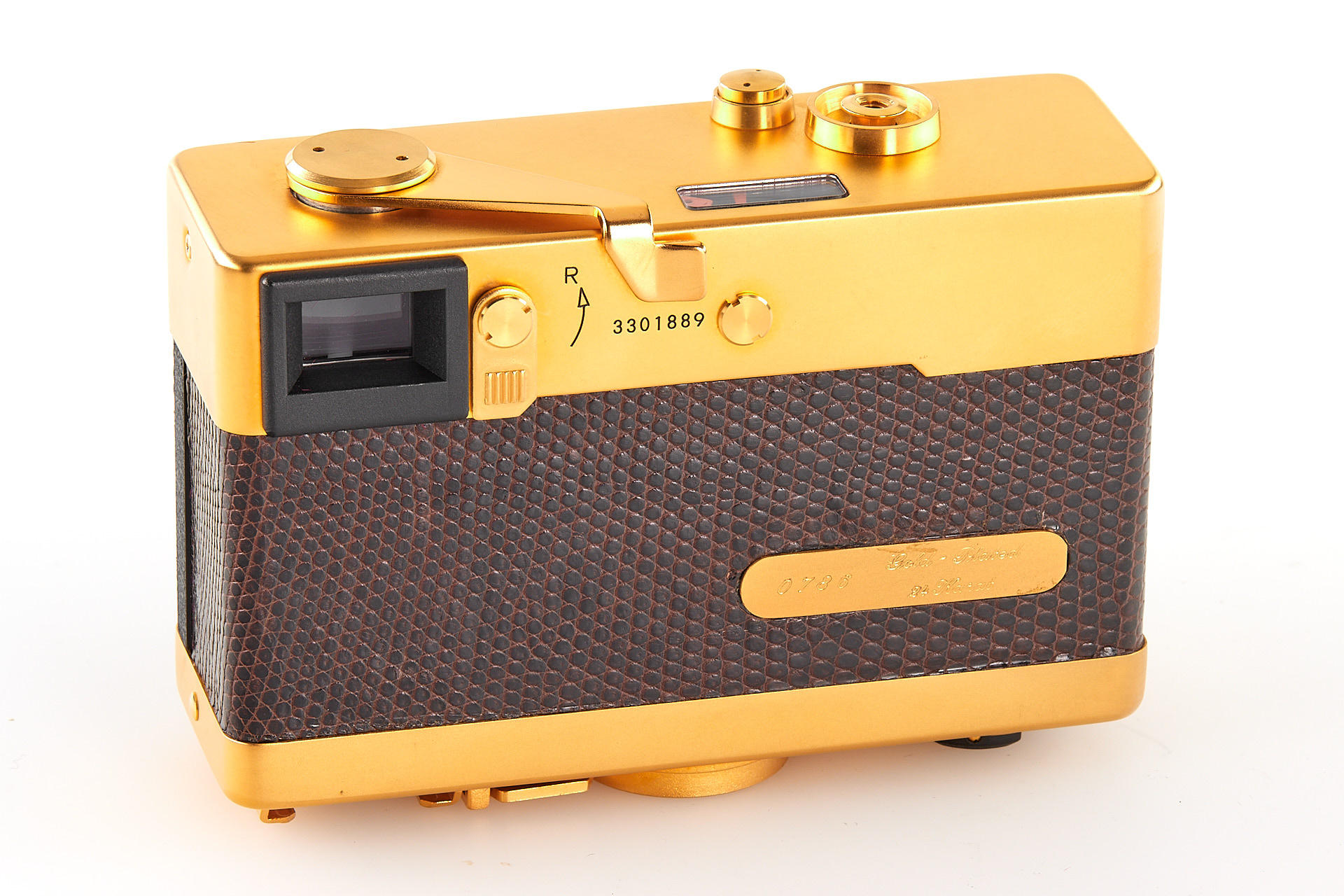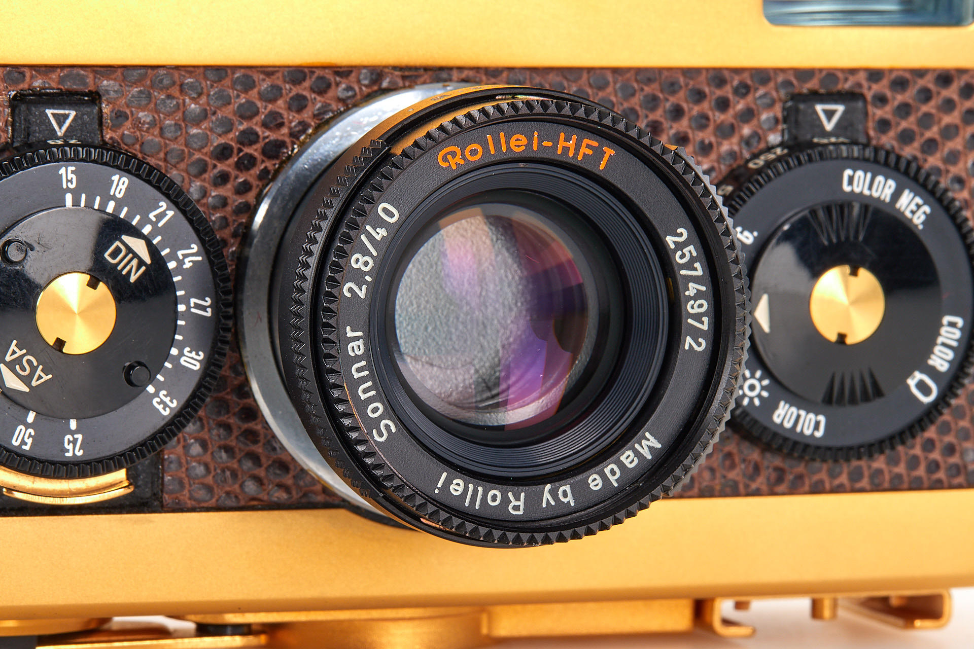 gold-plated Rollei 35S from a special edition of 1500 cameras, issued to commemorate 60 Years of Rollei, Sonnar 2.8/40mm no.2574972, with lizard skin case, strap, instructions, wooden presentation box and outer box
