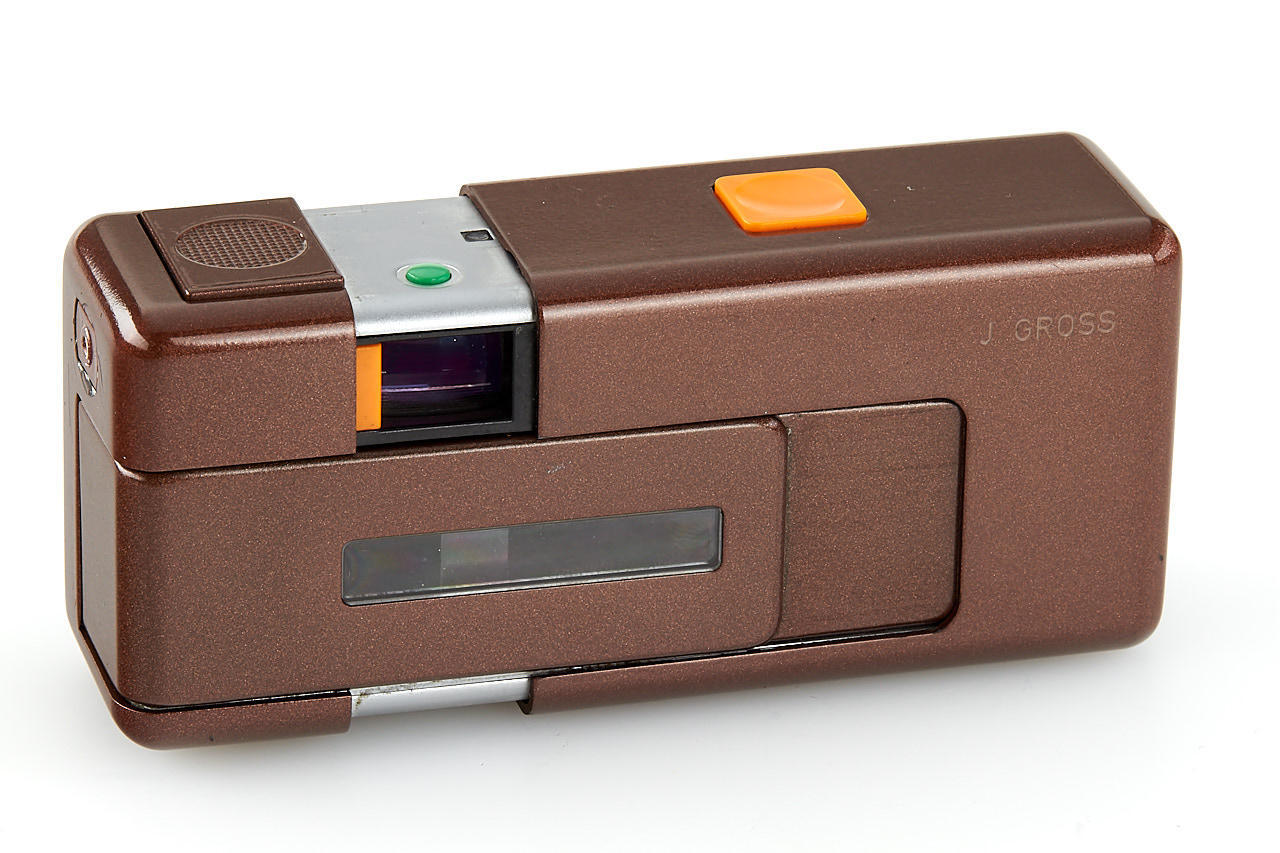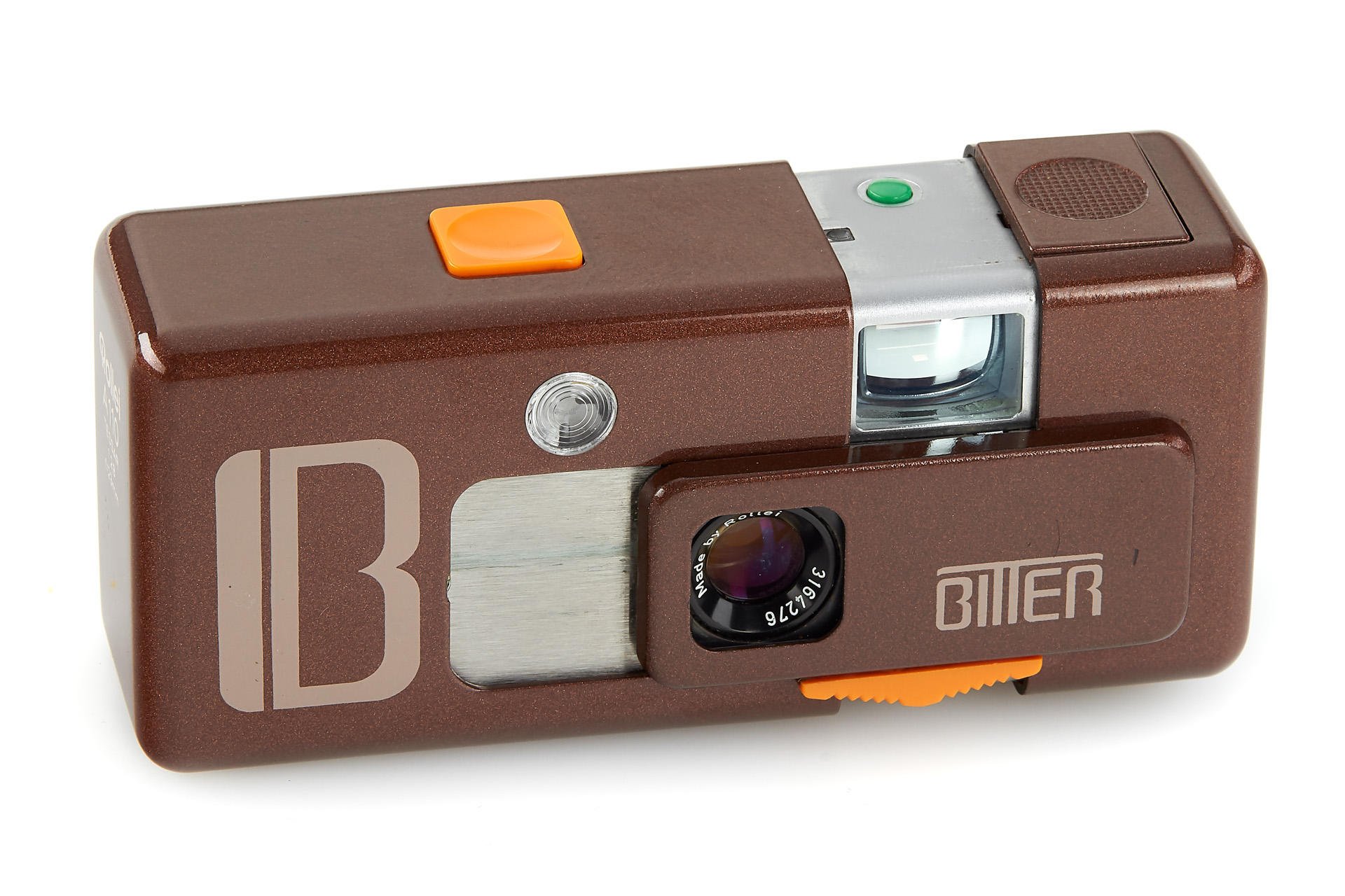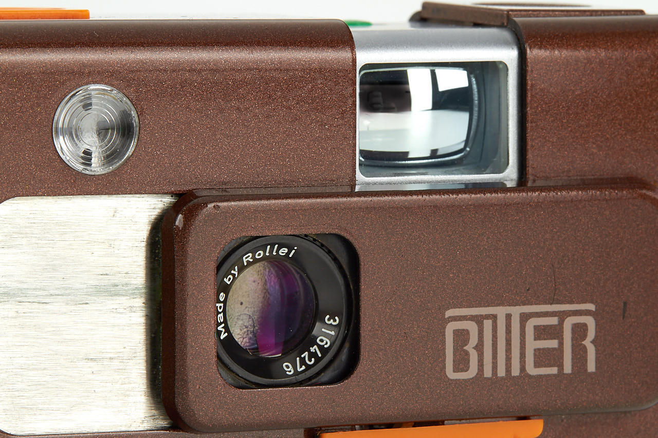 Rare brown Rollei 110 edition camera marked 'B' and 'BITTER' on front, on back engraved 'J. GROSS' (probably the previous owner). This limited edition of about 160 examples has been produced for the buyers of the famous Opel Bitter CD luxus coupé between 1974-1980. In near mint condition, with lens no.3164276, leather case, see Claus Prochnow 'Rollei Report 3', p.794