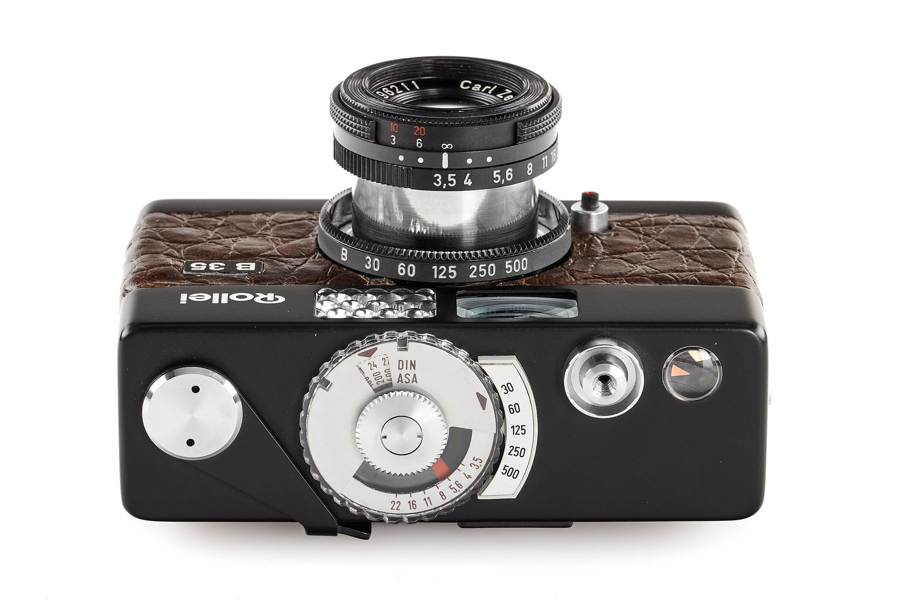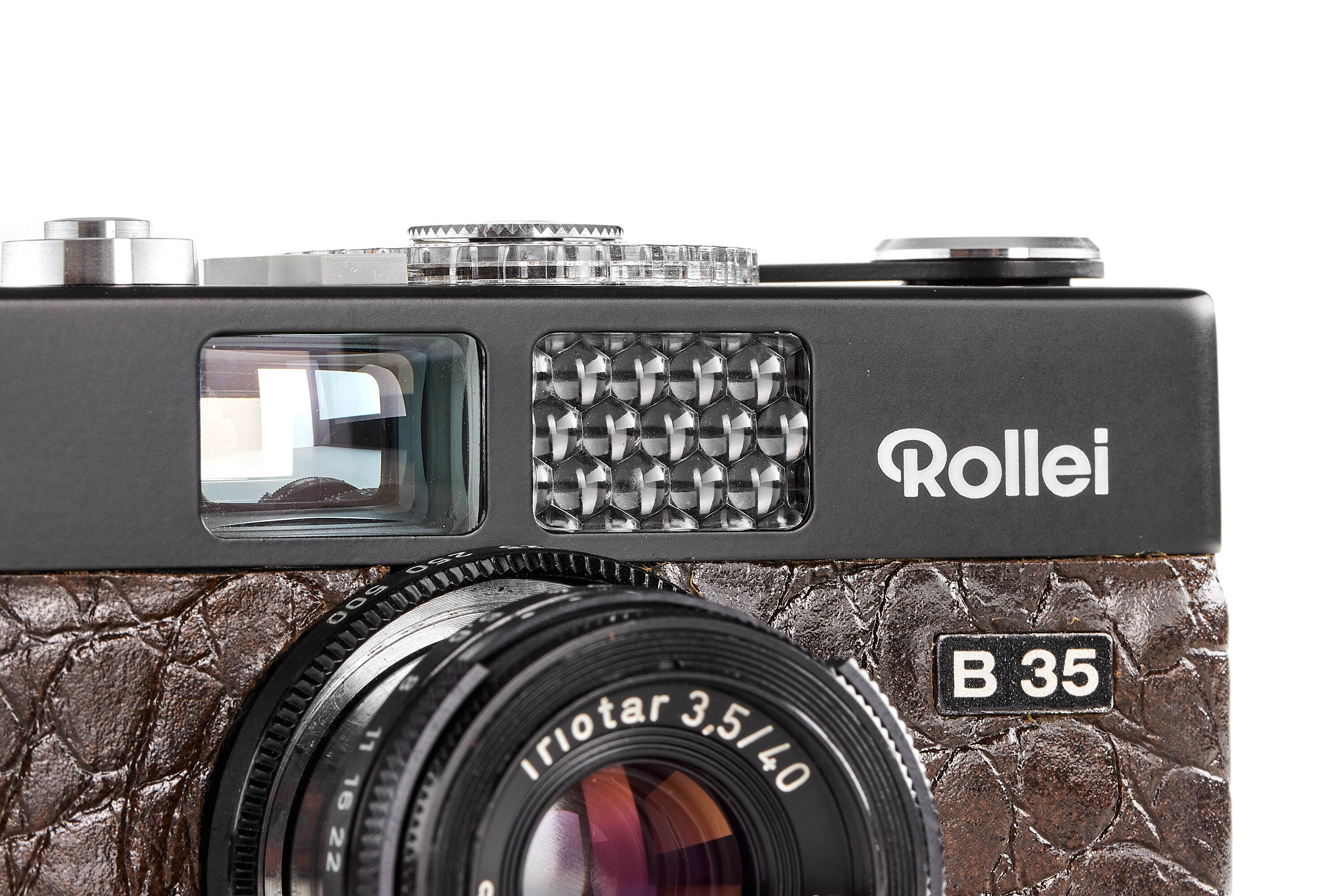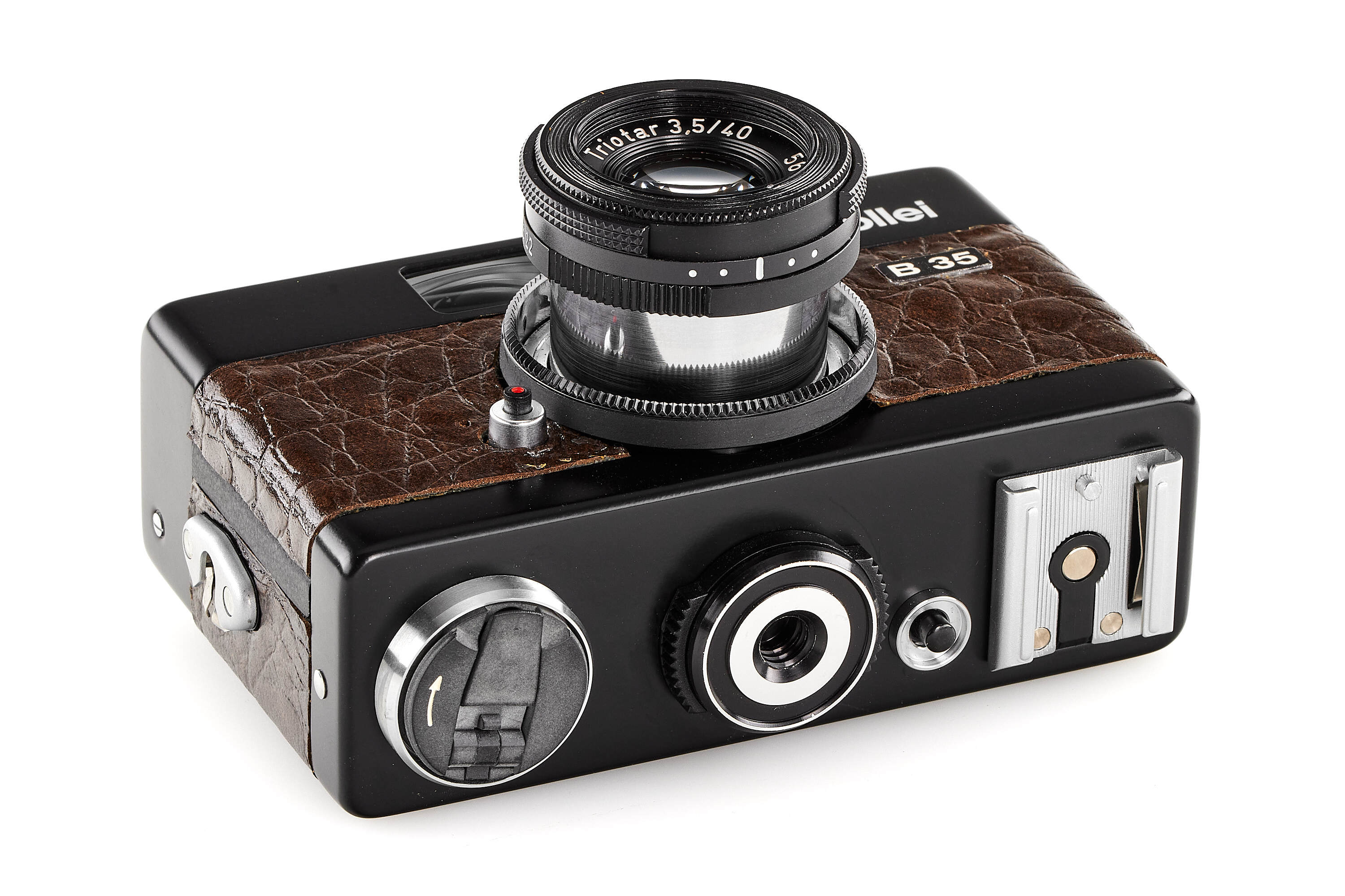 Very rare Rollei B35 with brown leather covering, produced in very small numbers to test market acceptance, particularly in the USA. In near-mint condition, equipped with Triotar 3.5/40mm. This version is listed in Prochnow, Rollei Report 3, p. 30-728, among the other documented variants.