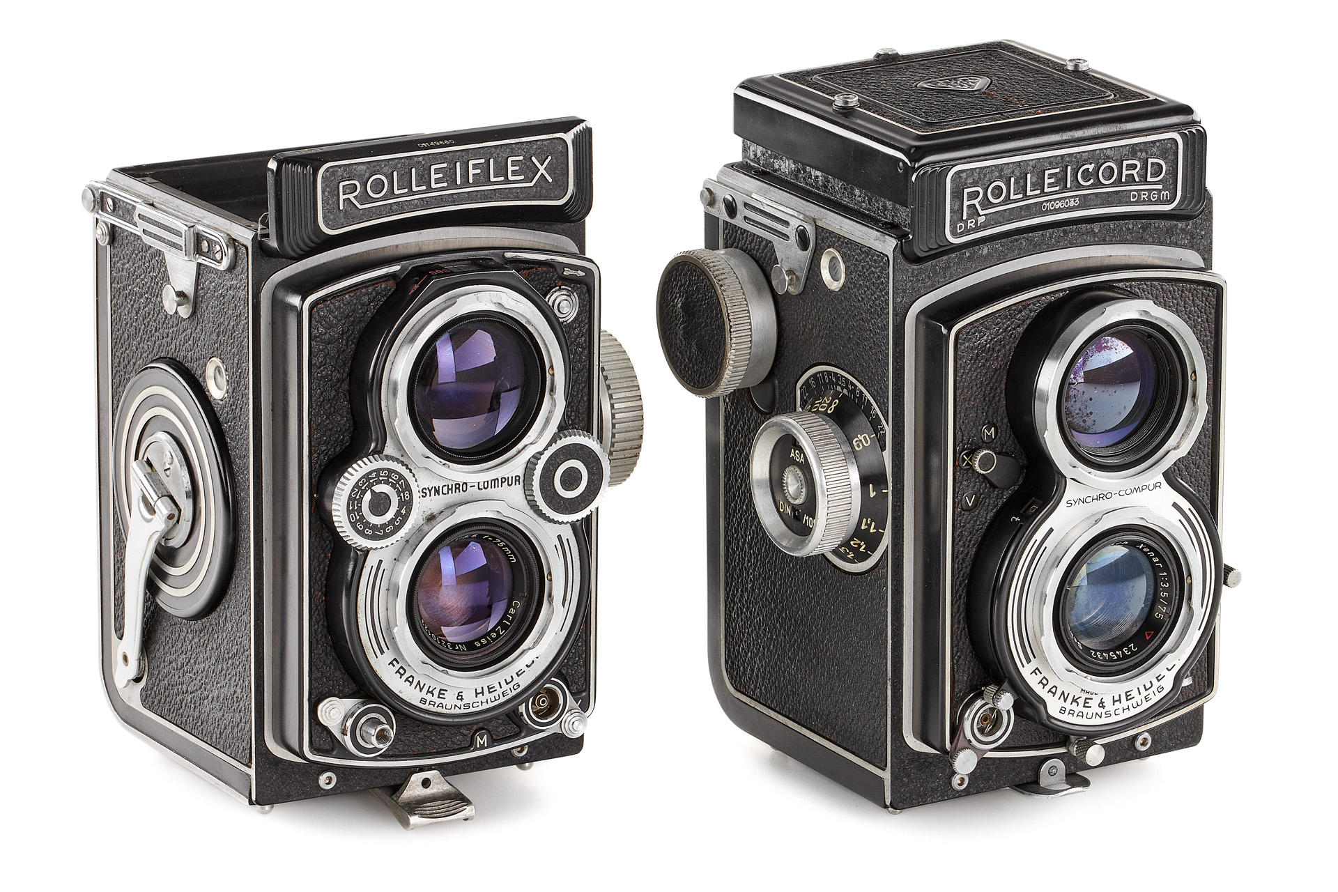 a very nice set including a rare display model Rolleicord V no.0196033 with Xenar 3.5/75mm no.2345432, and a display model Rolleiflex 3.5B second version no.01149680 (note the hand written inscription 'Att' for Attrape in the finder cavity) with Tessar 3.5/75mm no.3210123, both in good condition, some parts missing