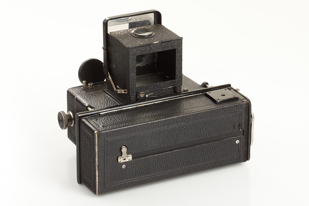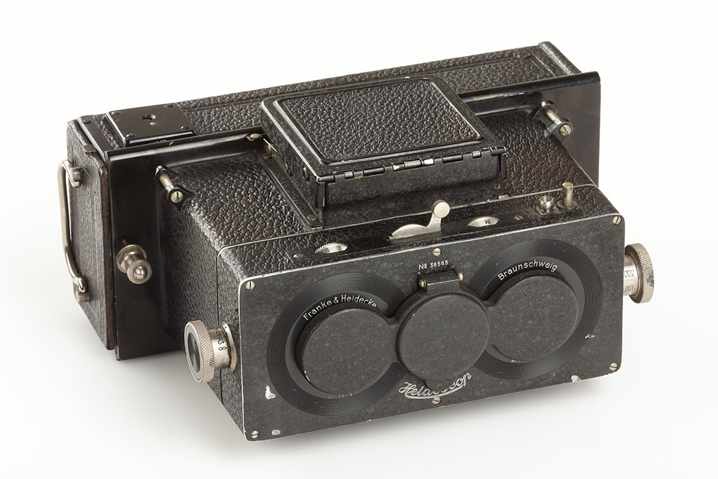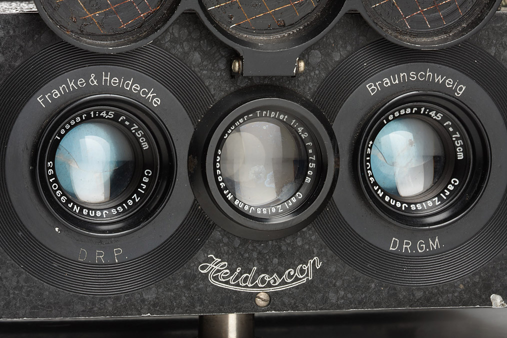 last version of 6x13cm Stereo Heidoscop in excellent original condition, Tessar 4.5/7.5cm lenses nos.990193/4 (shutter sticky), hinged cap, 2x original plate-magazine, in original Rollei leather case