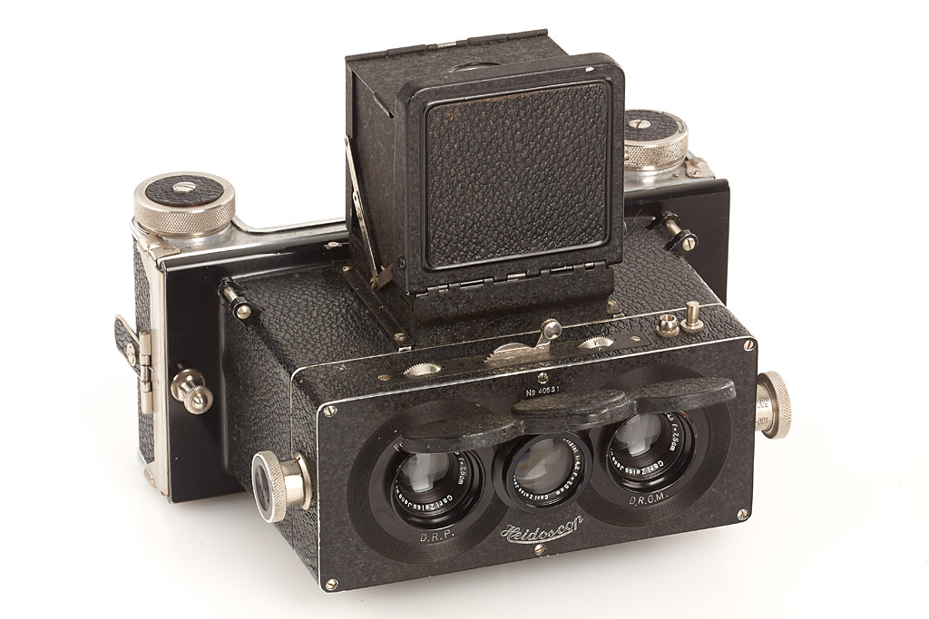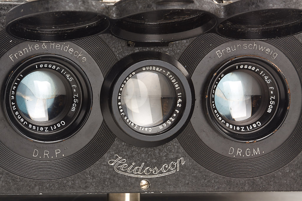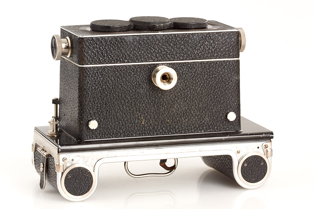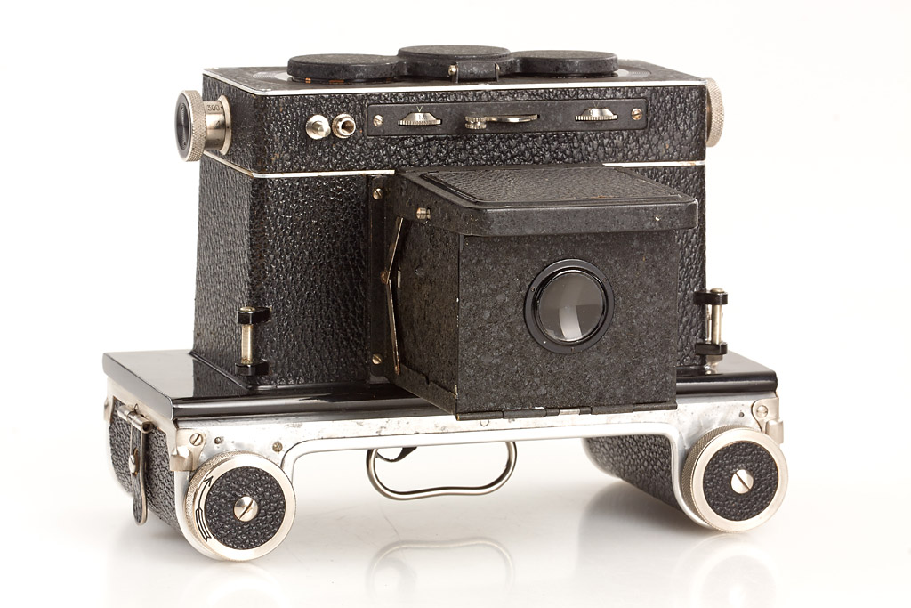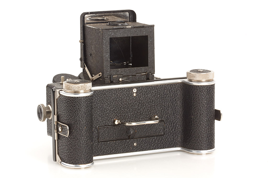 6x13cm, mint 4th model with Tessar 4.5/7.5cm lenses no.994111/2 with fixed lens cap, very rare original 120 rollfilm back, instruction book, case