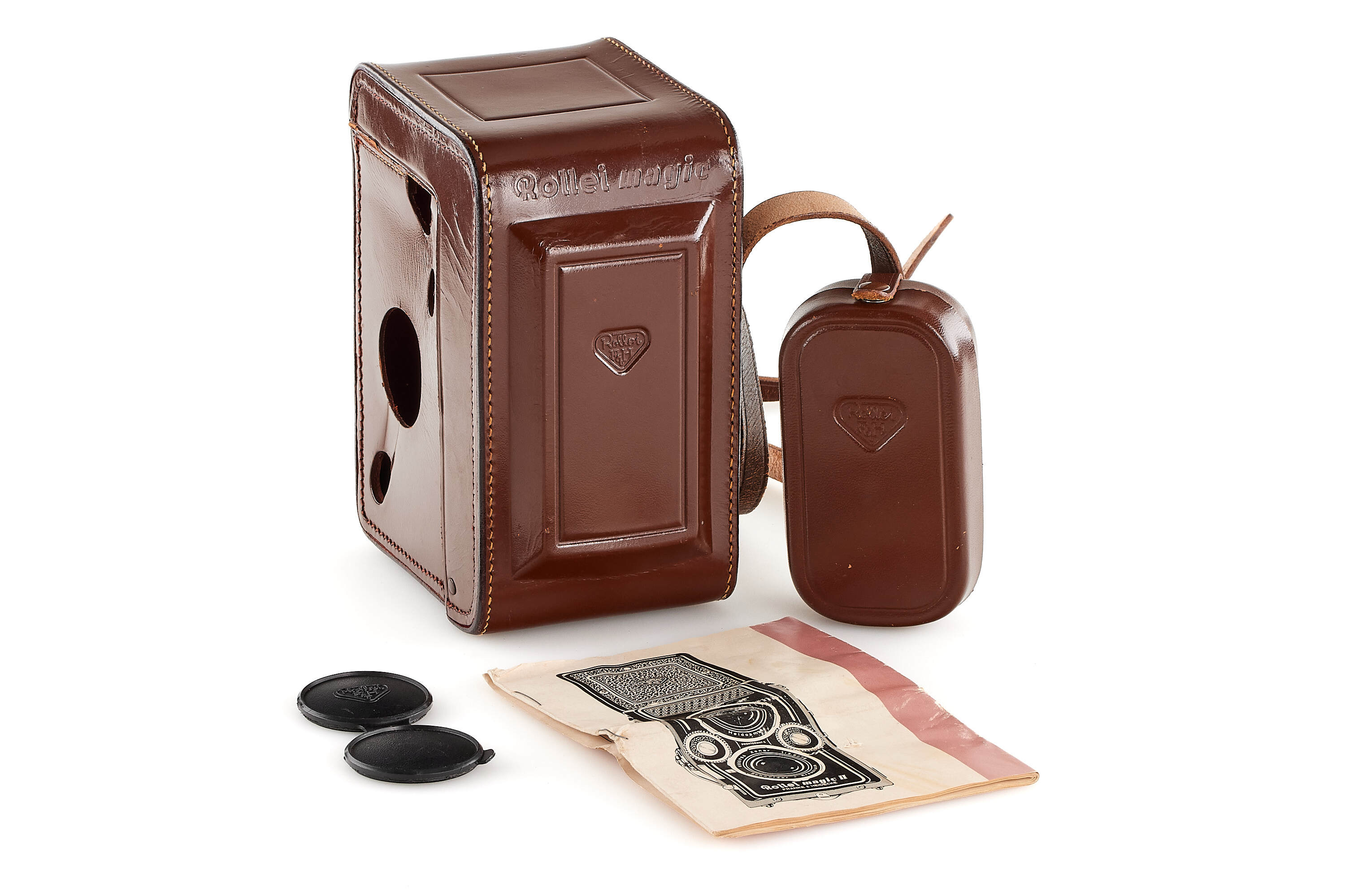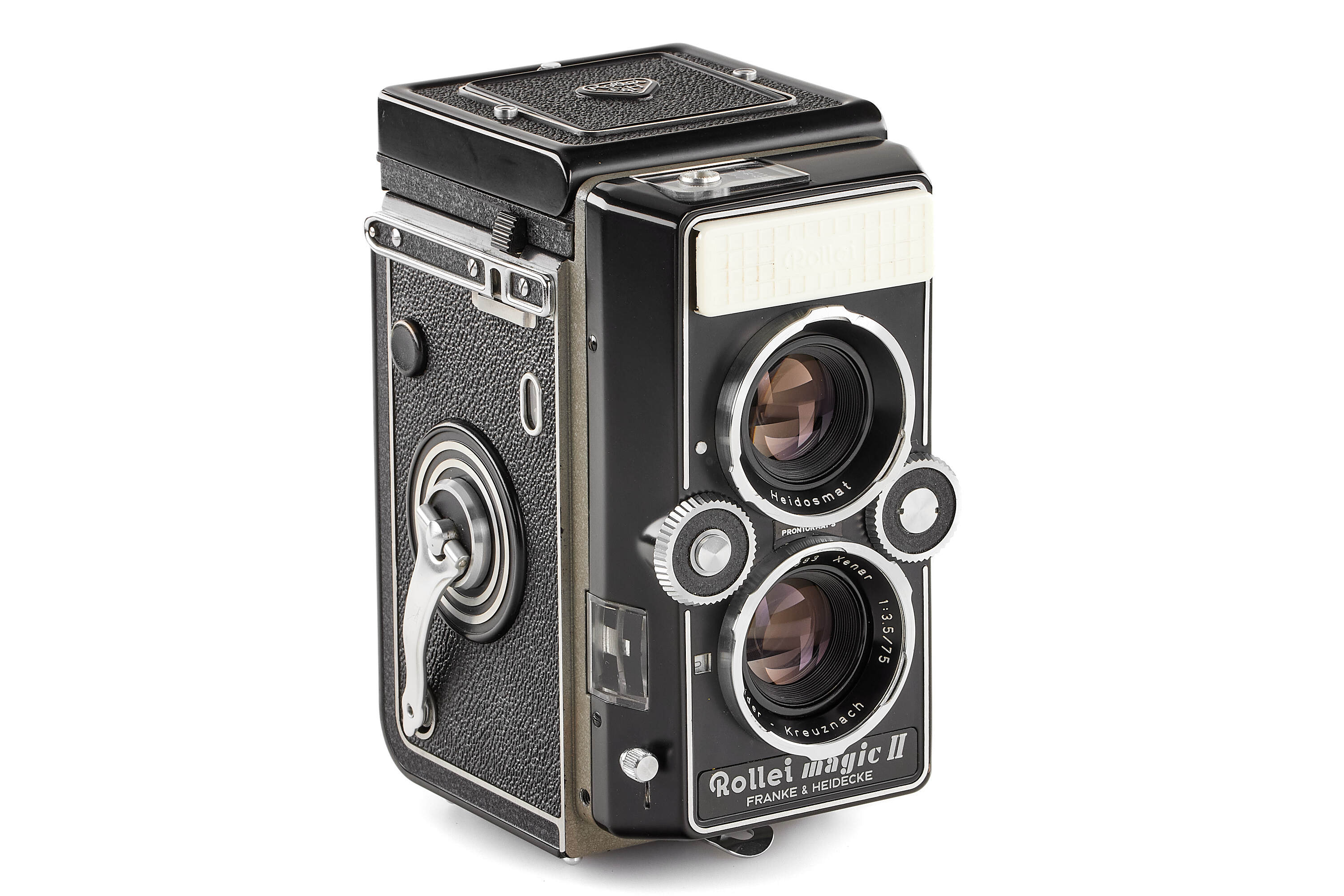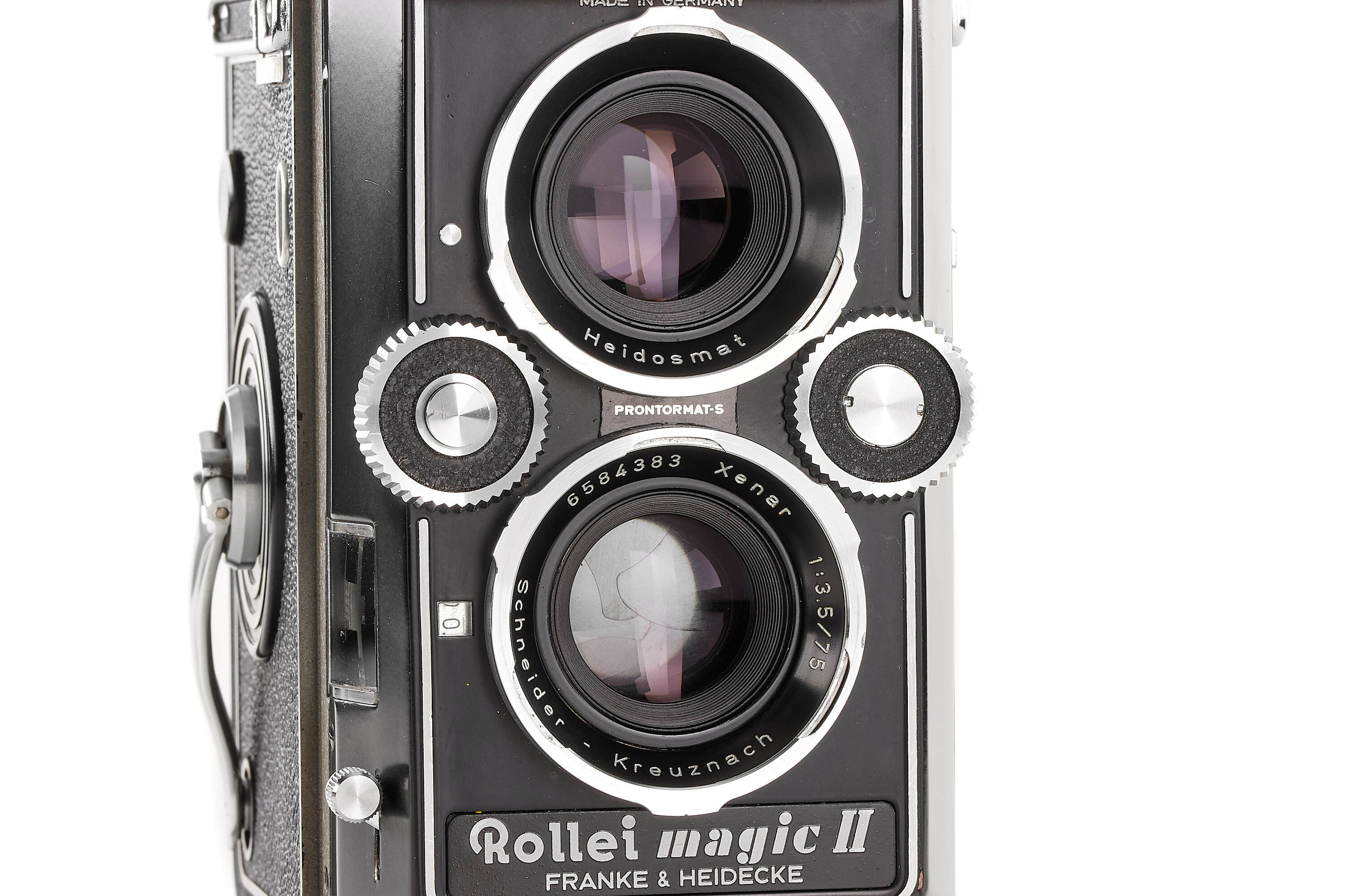 Extremely early Rollei Magic II, the second one ever released, production officially starts with no.2535000, in mint condition, with Xenar 3.5/75mm no.6584383, optics showing some cleaning marks, with plastic lenses cap, yellow, orange filters and hood in leather case, strap, leather eveready case and French instructions.