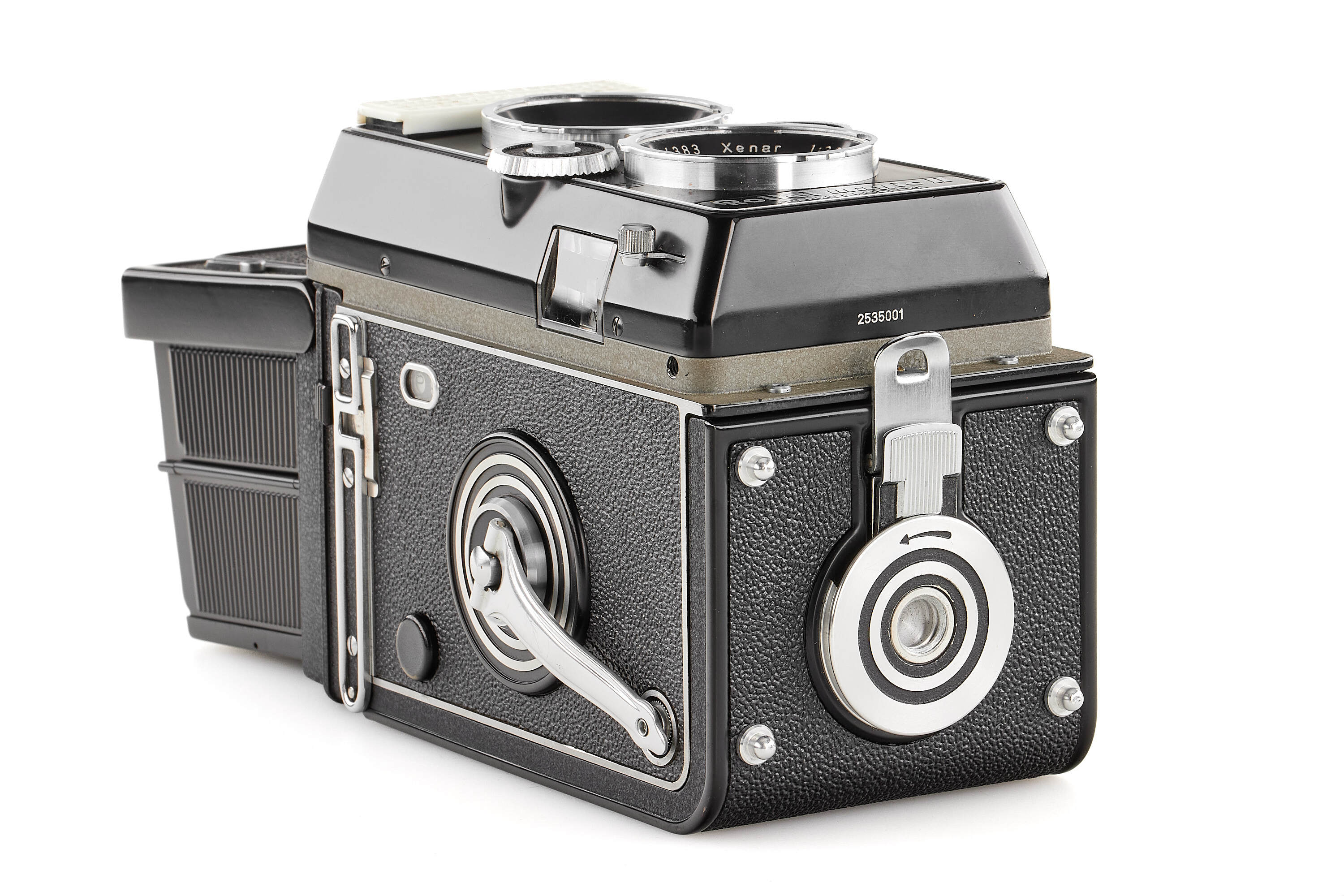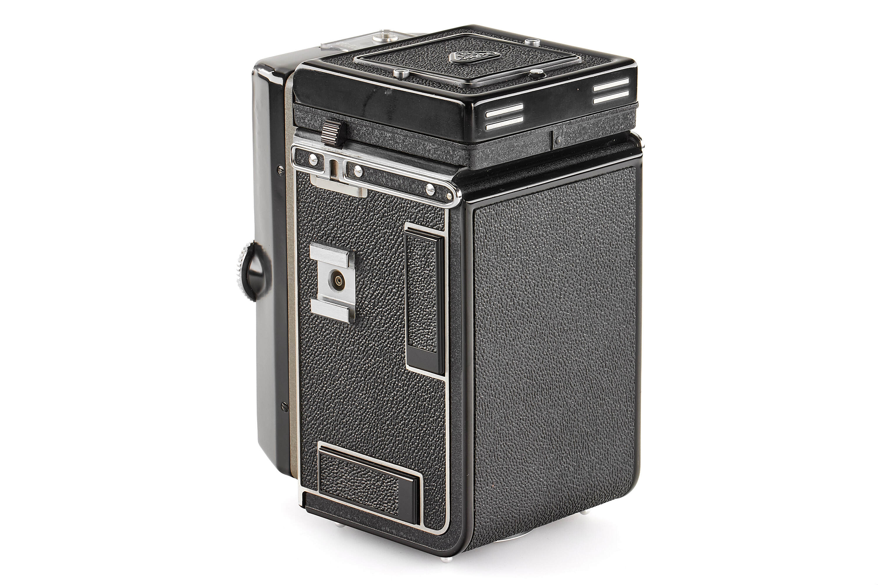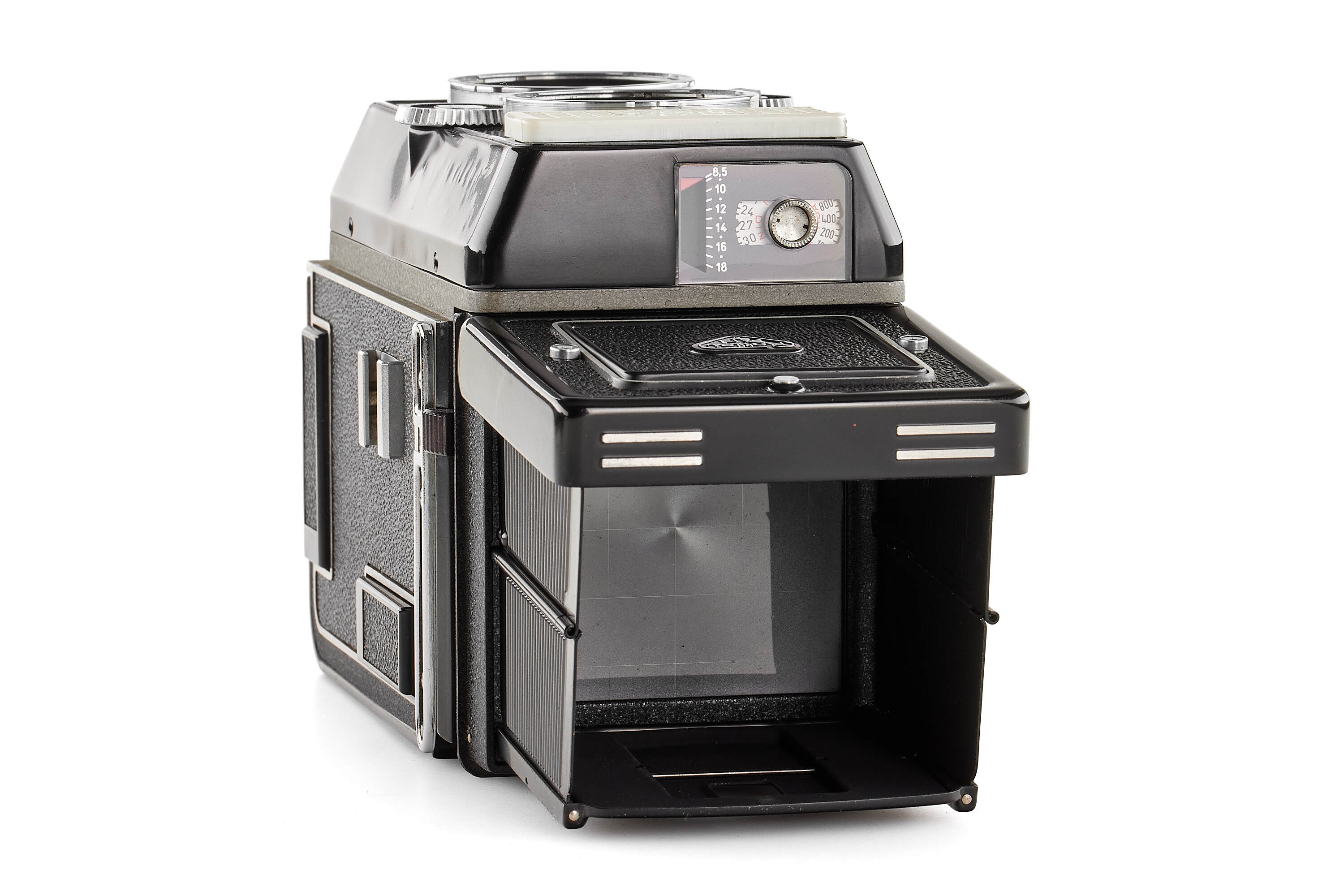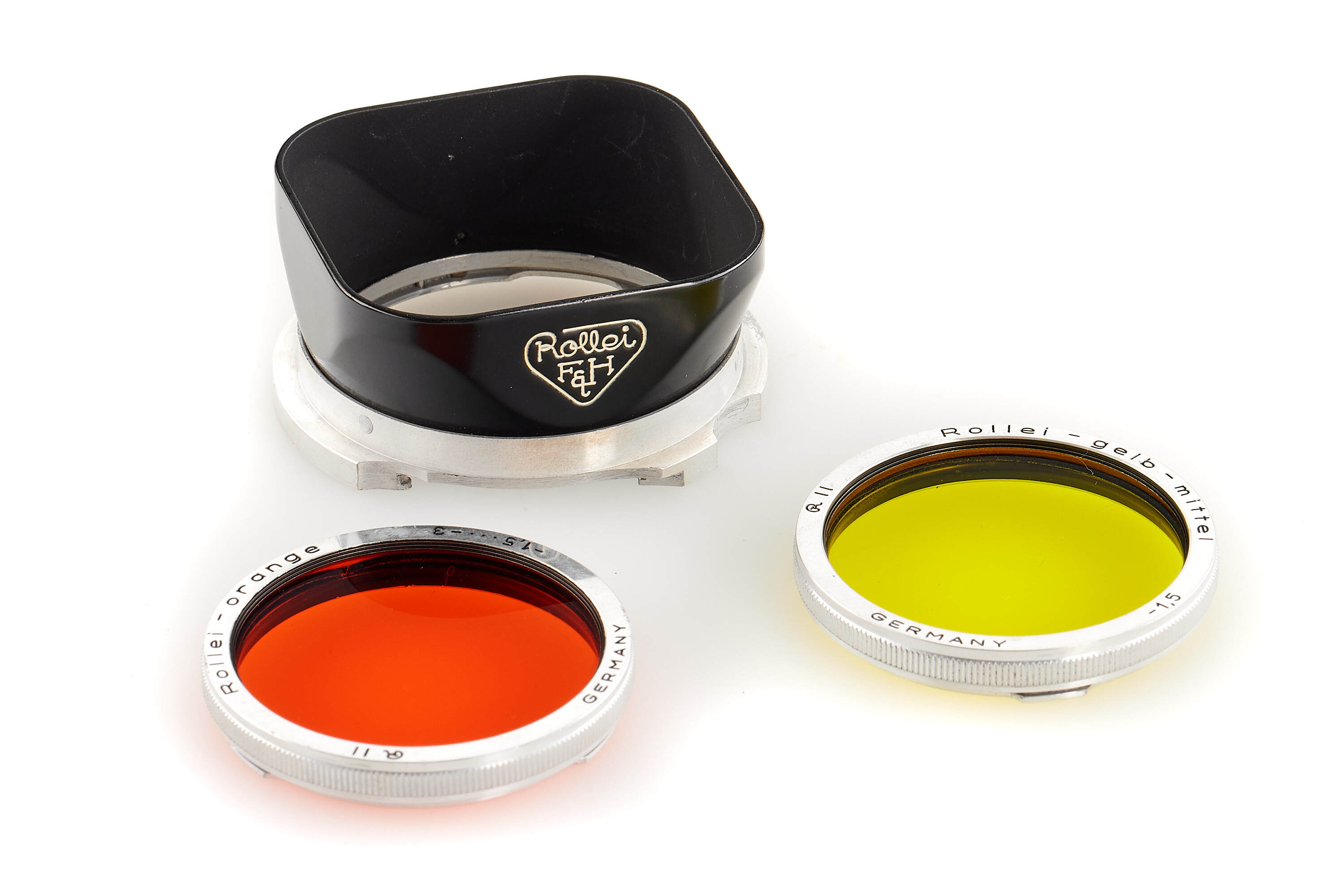 Extremely early Rollei Magic II, the second one ever released, production officially starts with no.2535000, in mint condition, with Xenar 3.5/75mm no.6584383, optics showing some cleaning marks, with plastic lenses cap, yellow, orange filters and hood in leather case, strap, leather eveready case and French instructions.
