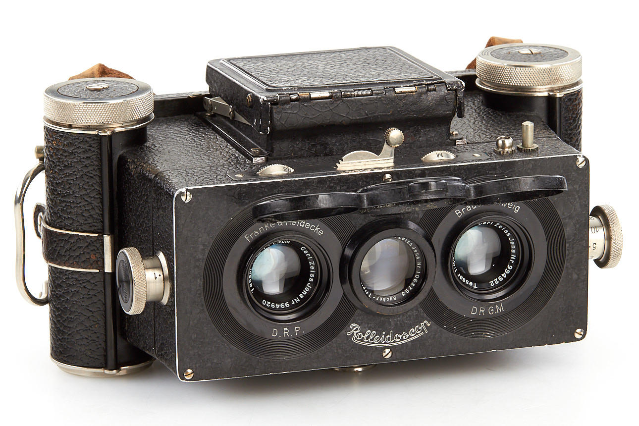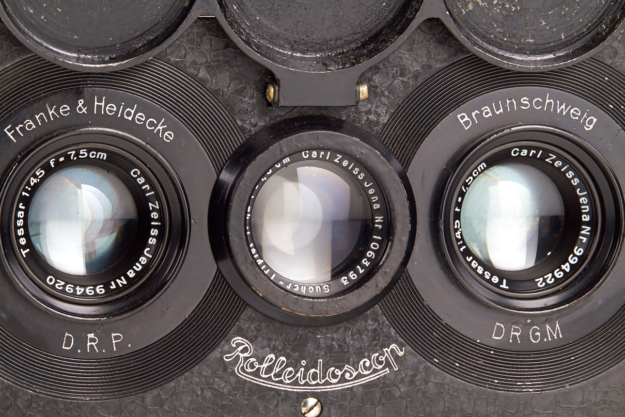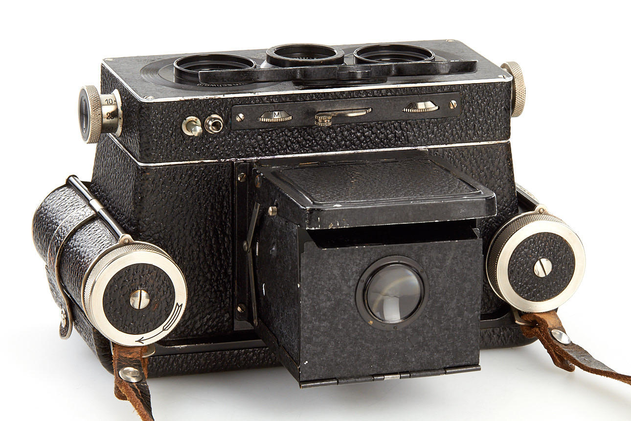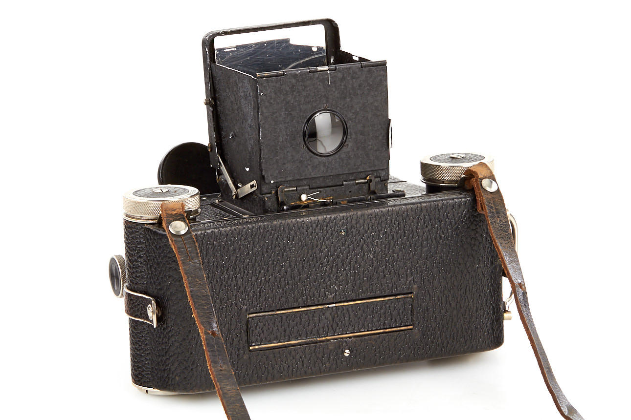 late version 6x13cm stereo-camera for 120 film, in very good and working condition, Tessar 4.5/7.5cm lenses no.994920 and 994922, with strap and leather case
