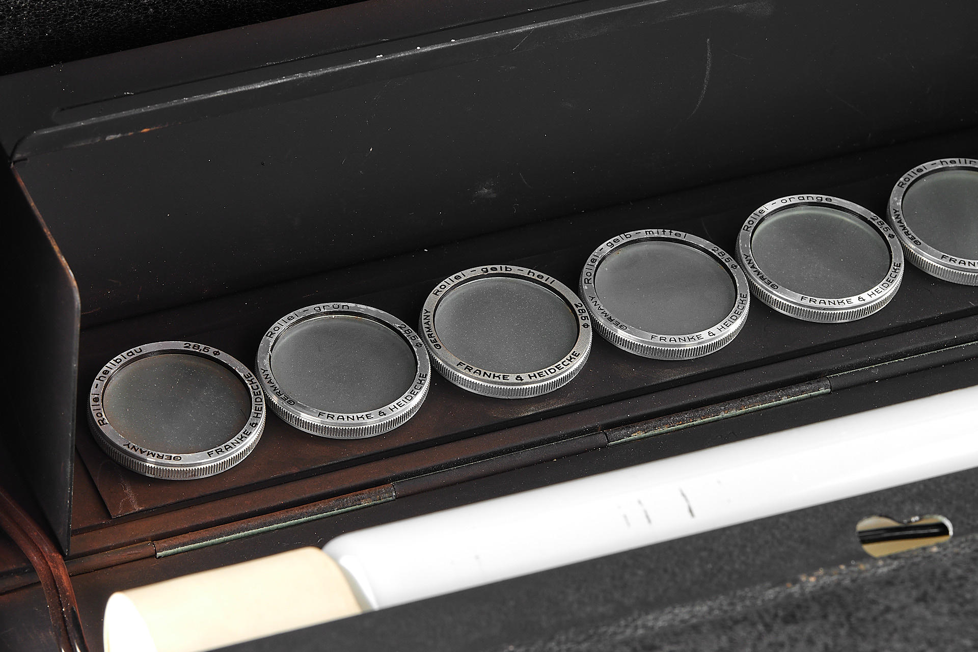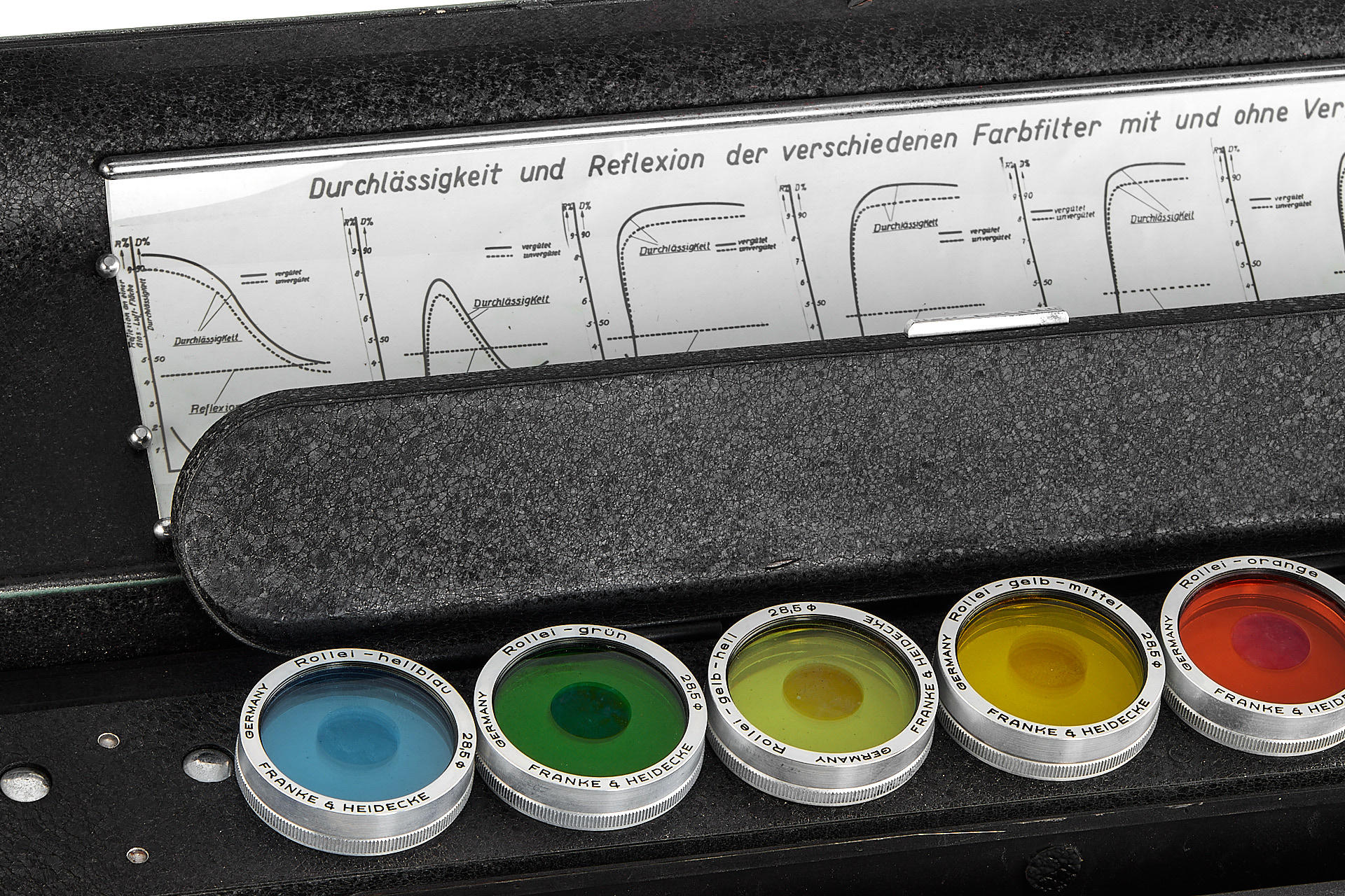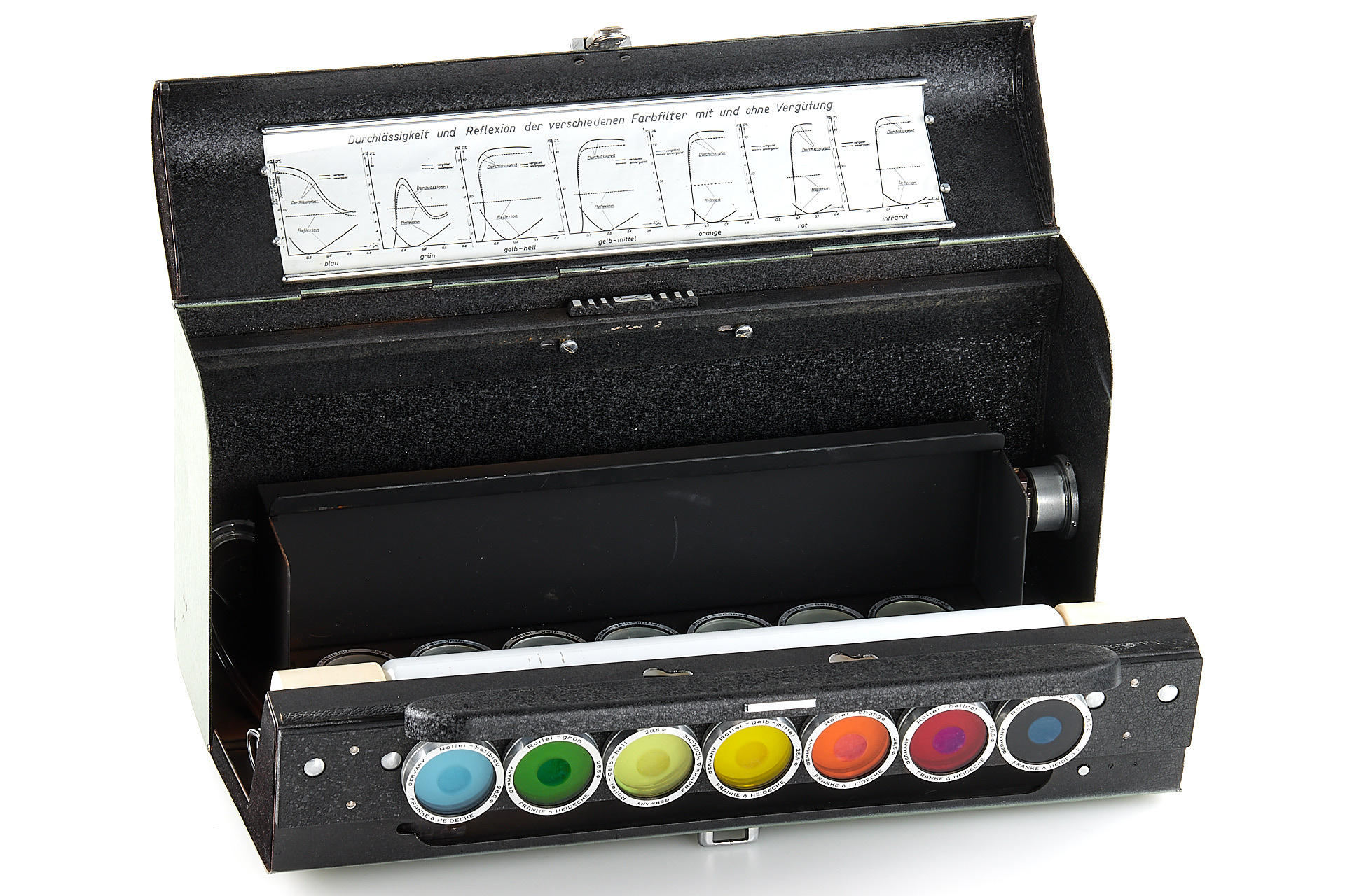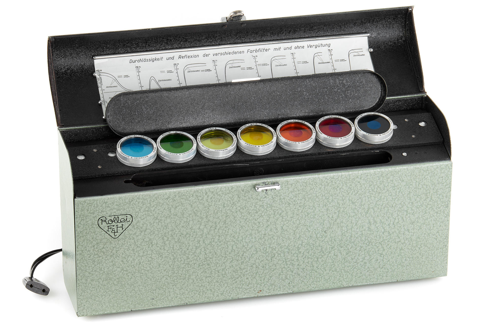 a unique presentation box to show transparency and reflection of coated versus uncoated filters, including fourteen modified filters - seven colour filters on the outside and seven filters only with coating on the inside, everything in metal, hammertone painted case (electric not tested), in excellent condition, ex Rollei factory