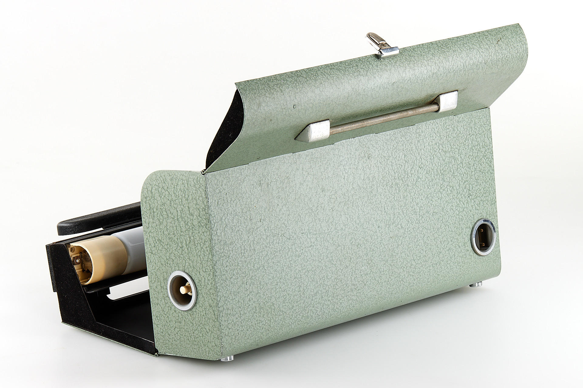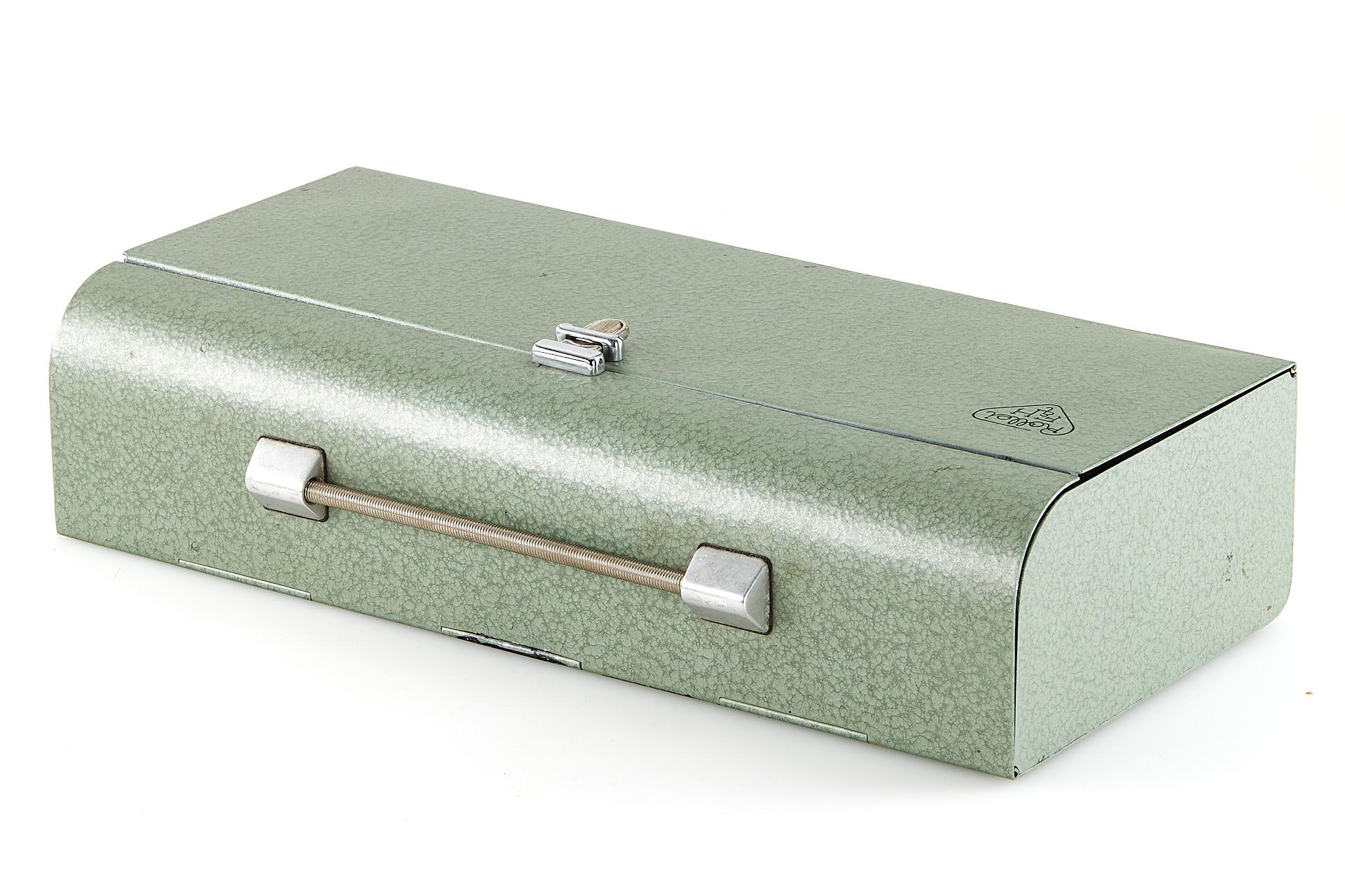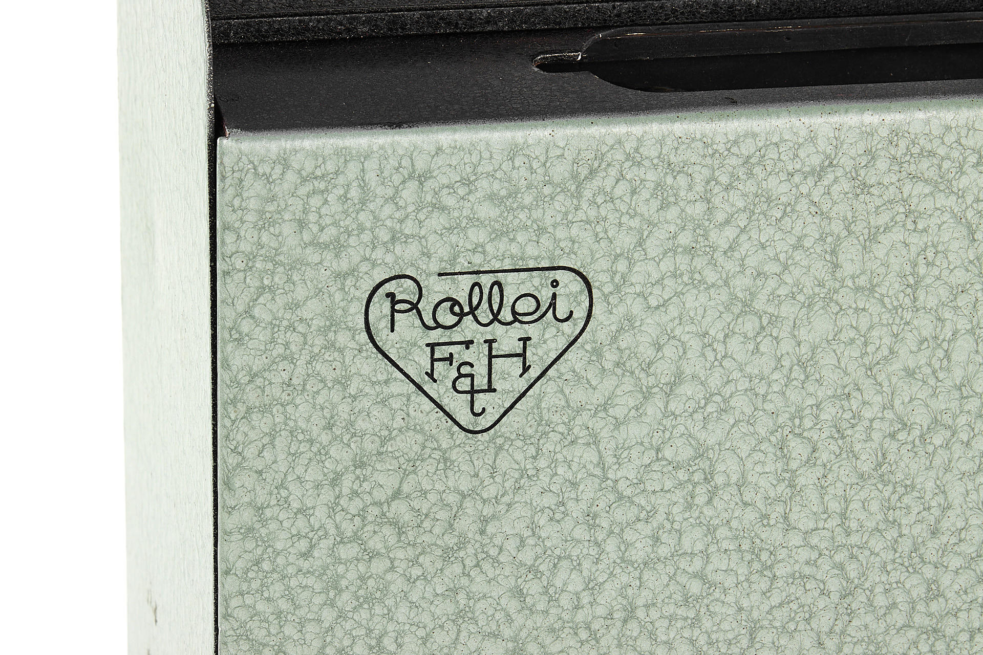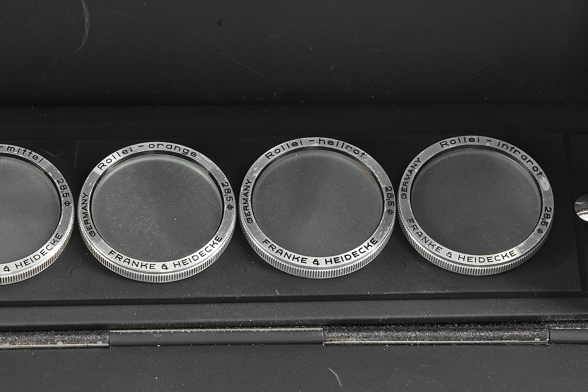 a unique presentation box to show transparency and reflection of coated versus uncoated filters, including fourteen modified filters - seven colour filters on the outside and seven filters only with coating on the inside, everything in metal, hammertone painted case (electric not tested), in excellent condition, ex Rollei factory