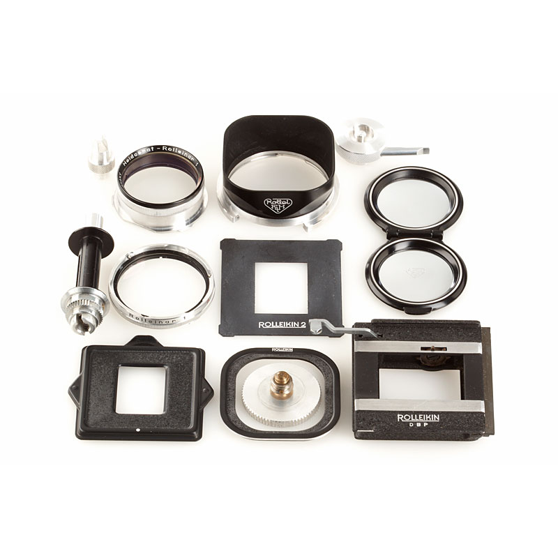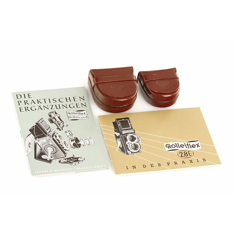 mint metered 2.8E with Planar 2.8/80mm no.1857663 taking lens, Heidosmat 2.8/80mm no.756721 viewing lens (clean optics, cap), diffuser, strap, everready case, Rolleigrid focusing screen (box), hood (case), Rolleinar 1 (case), Rolleikin 2,8 (case), instructions