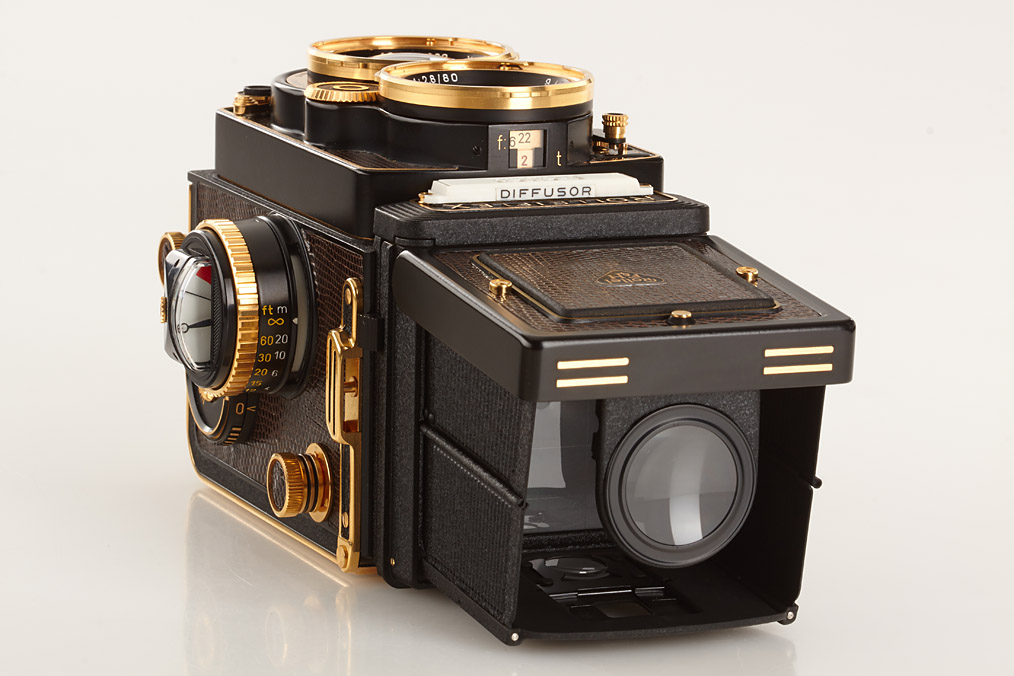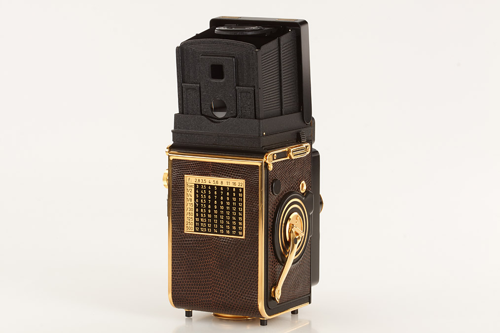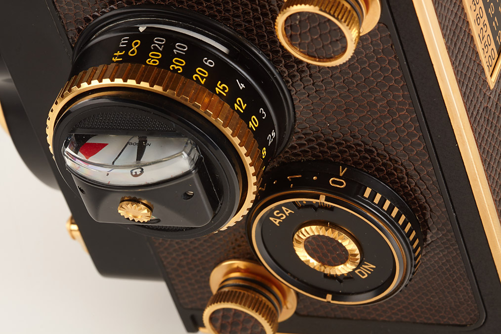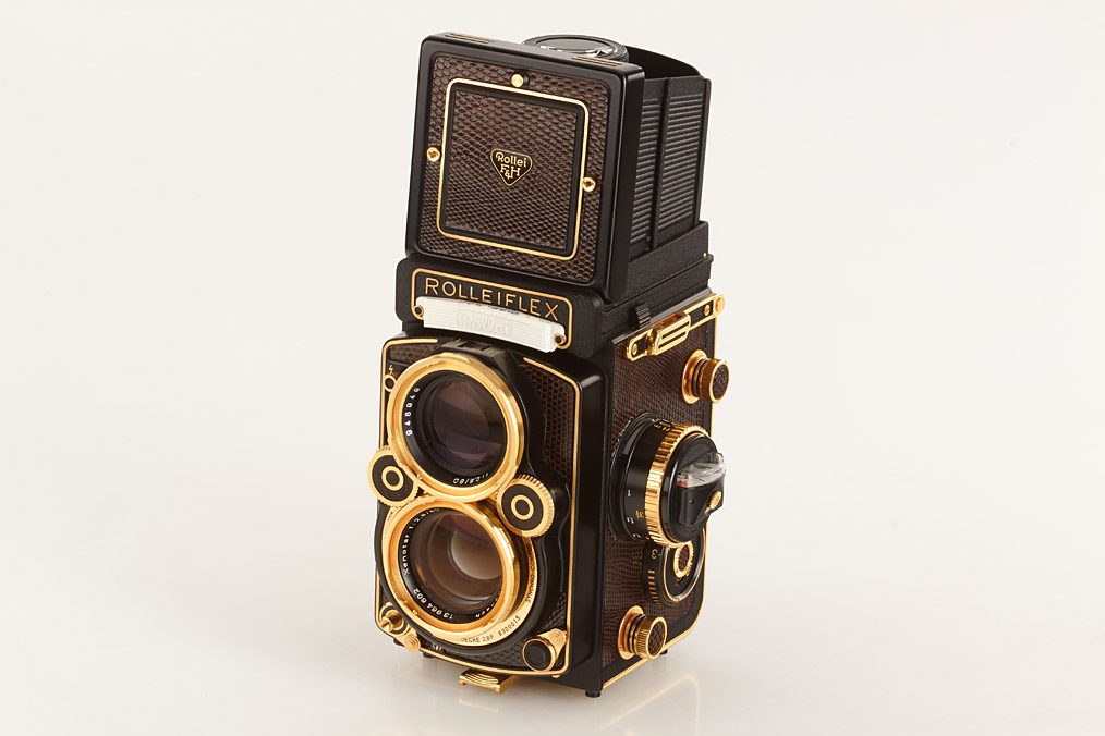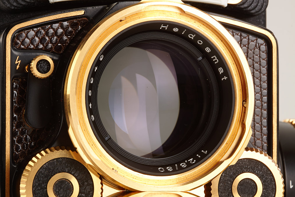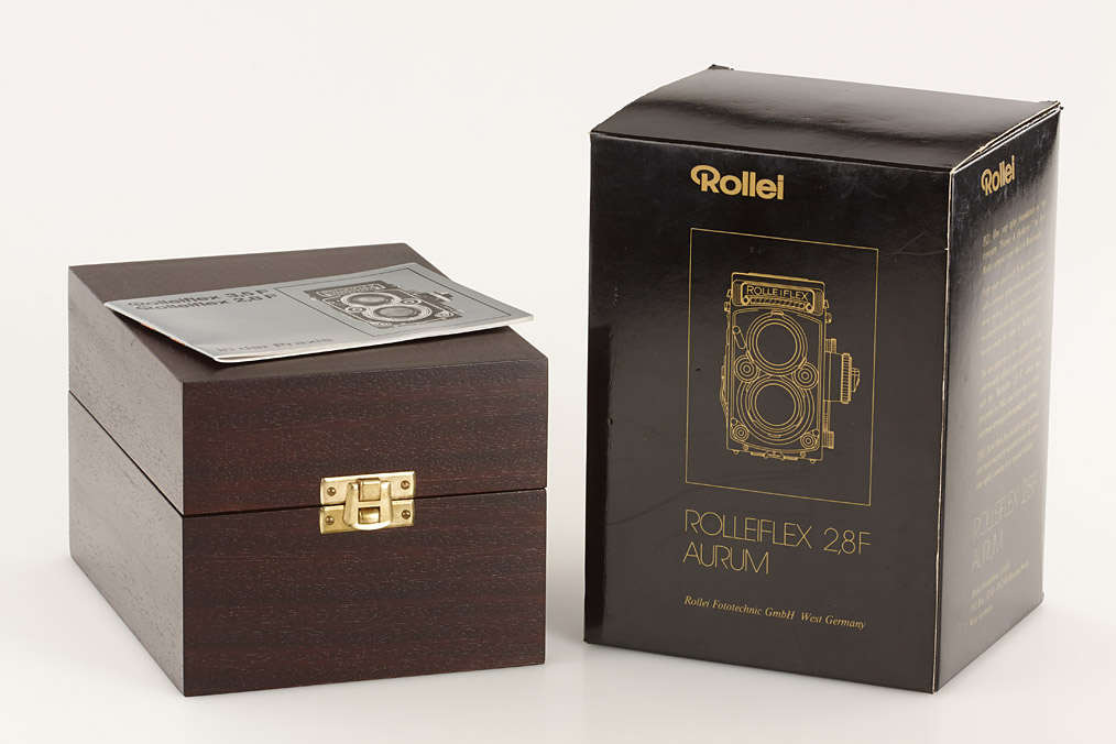 gold plated edition in new condition with Xenotar 2.8/80mm no.13964602, wooden box, strap, cap, instructions, warranty card and maker's box