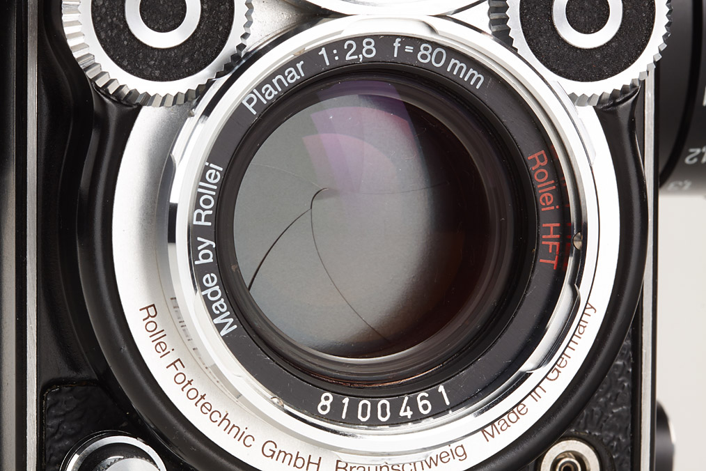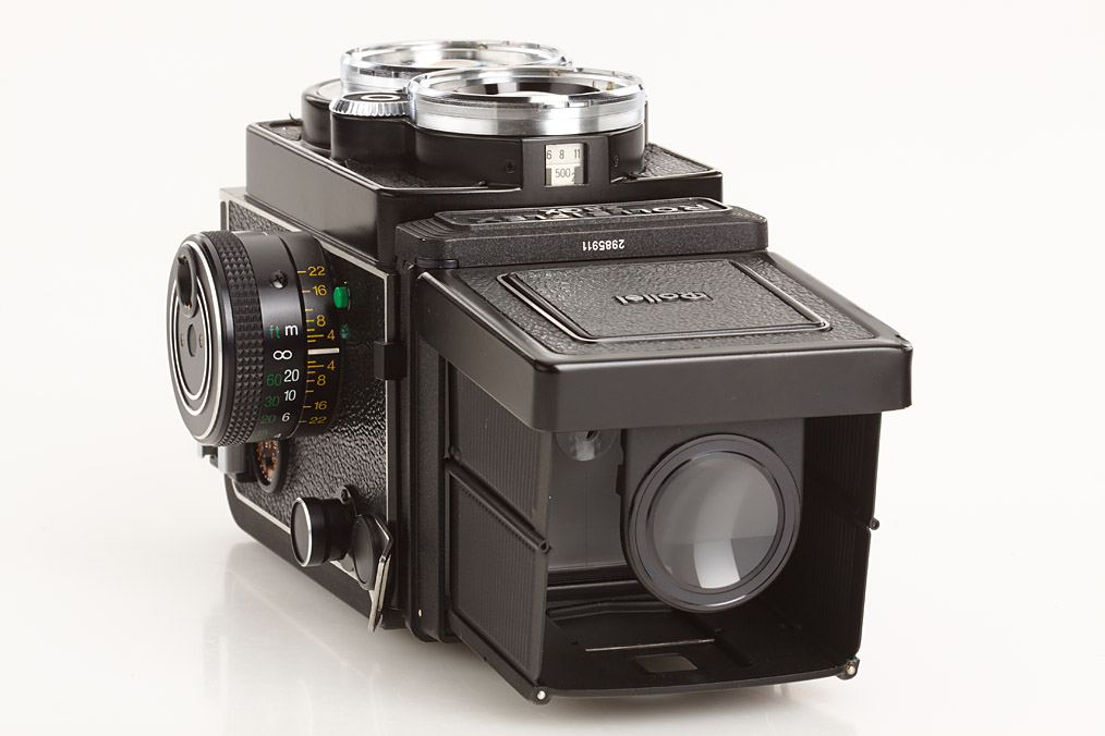 first type in mint condition (except small dent on finder hood), with Planar 2.8/80mm no.8100461 Rollei HFT, hood
