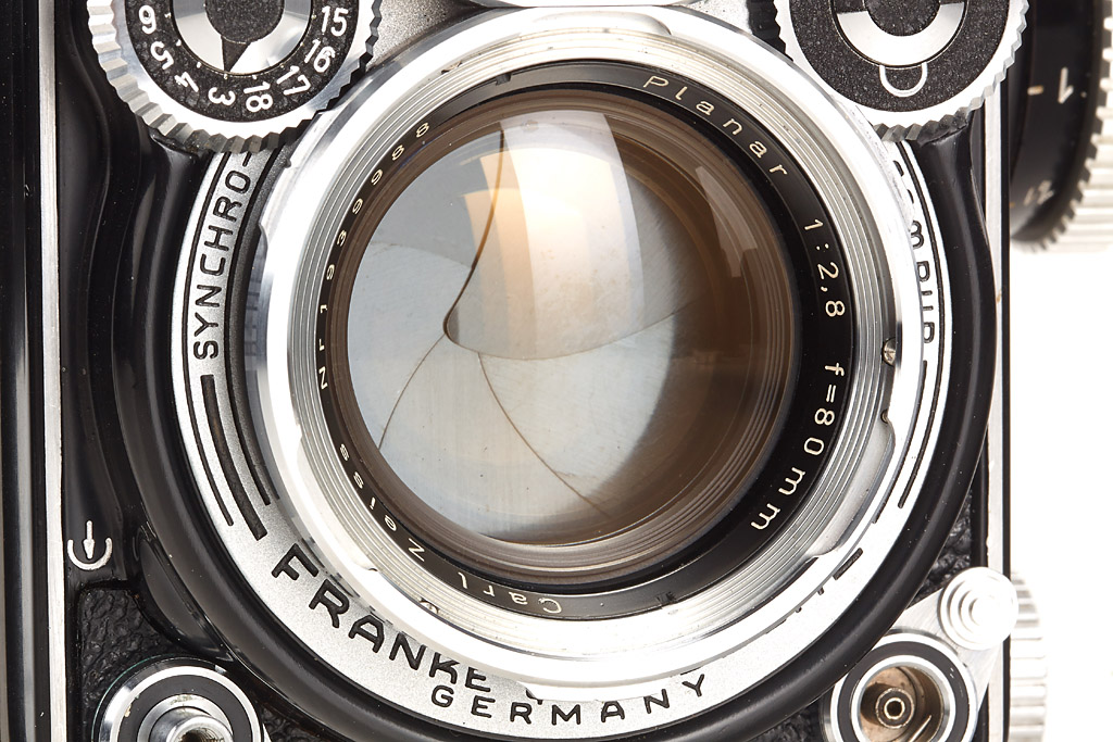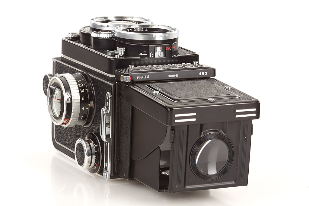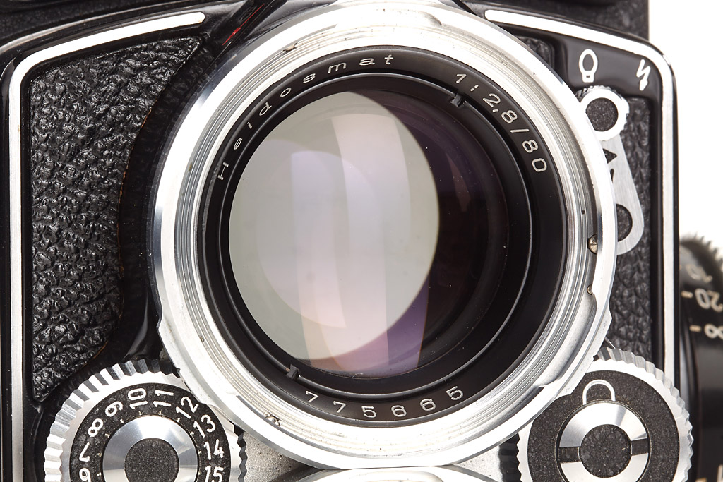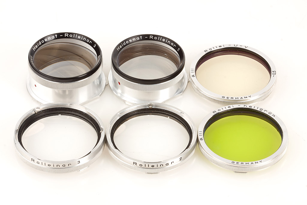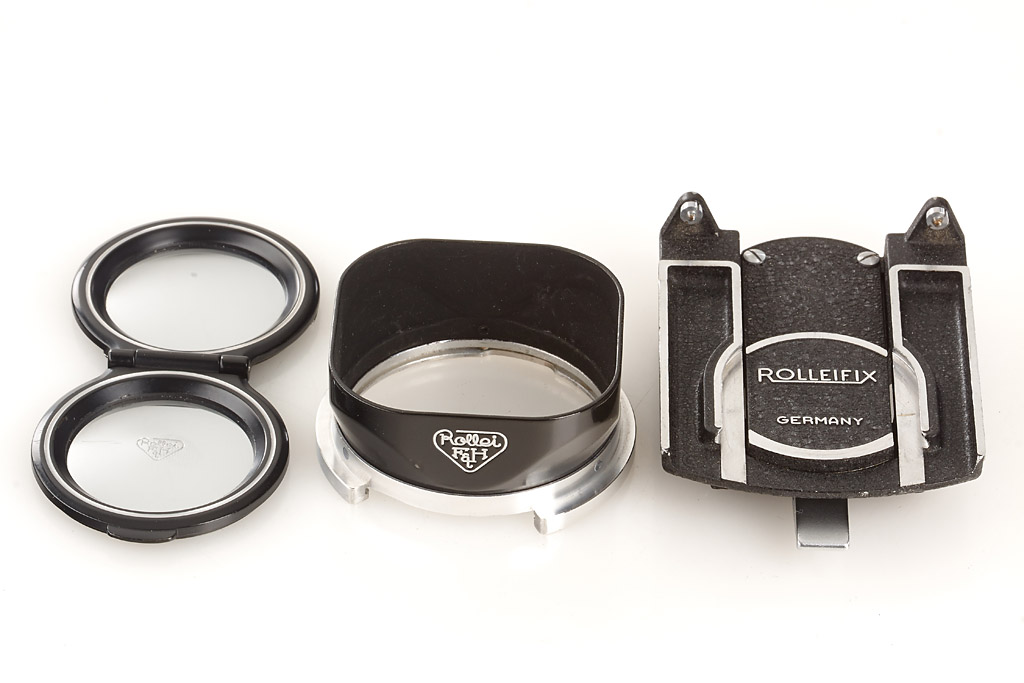metered camera in almost mint condition with Planar 2.8/80mm no.1939988 taking lens, Heidosmat 2.8/80mm no.775665 viewing lens (cap), strap, everready case, meter protector, focusing hood, metal hood (keeper), Rolleinar 2&3 (keeper), UV & green filter (keeper), Rolleikin 2.8 set in case, Rolleifix tripod adapter, instructions and brochures