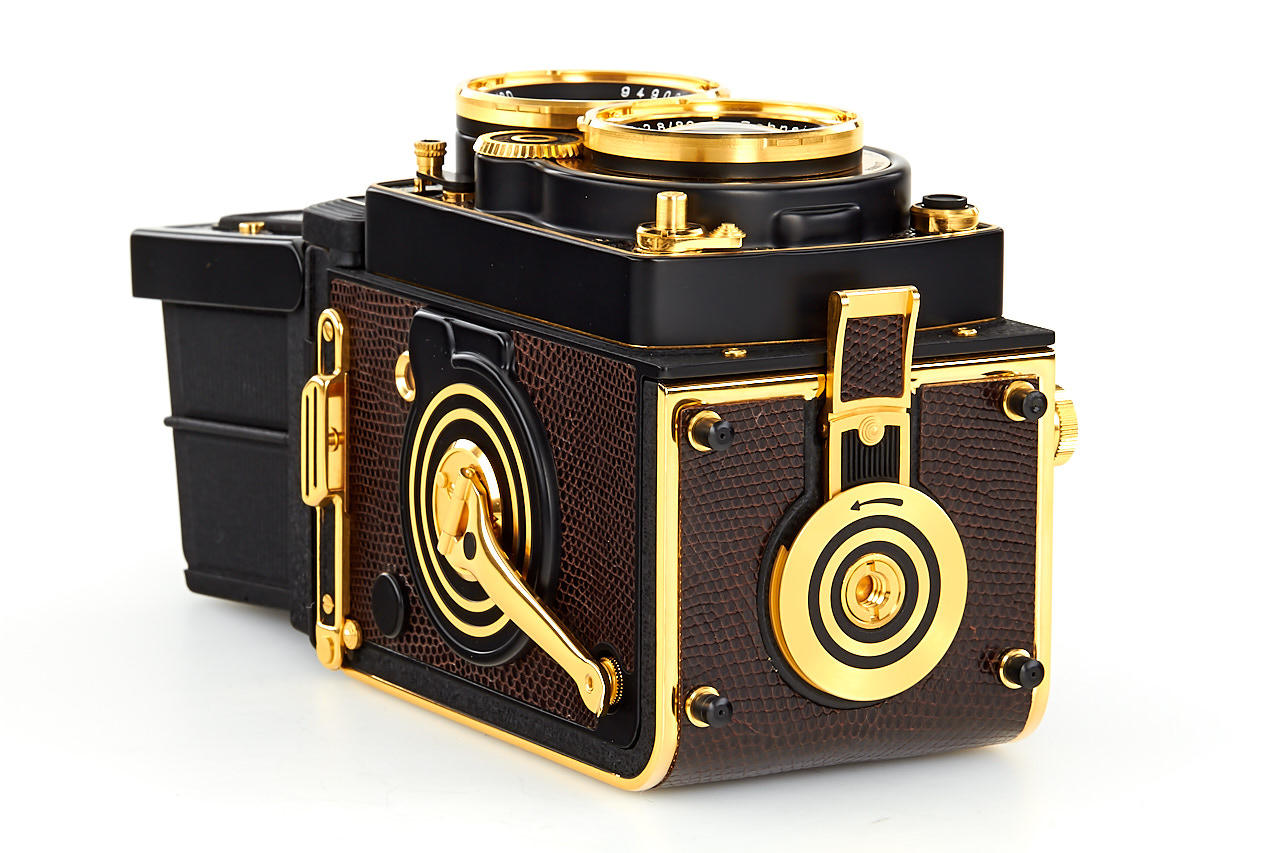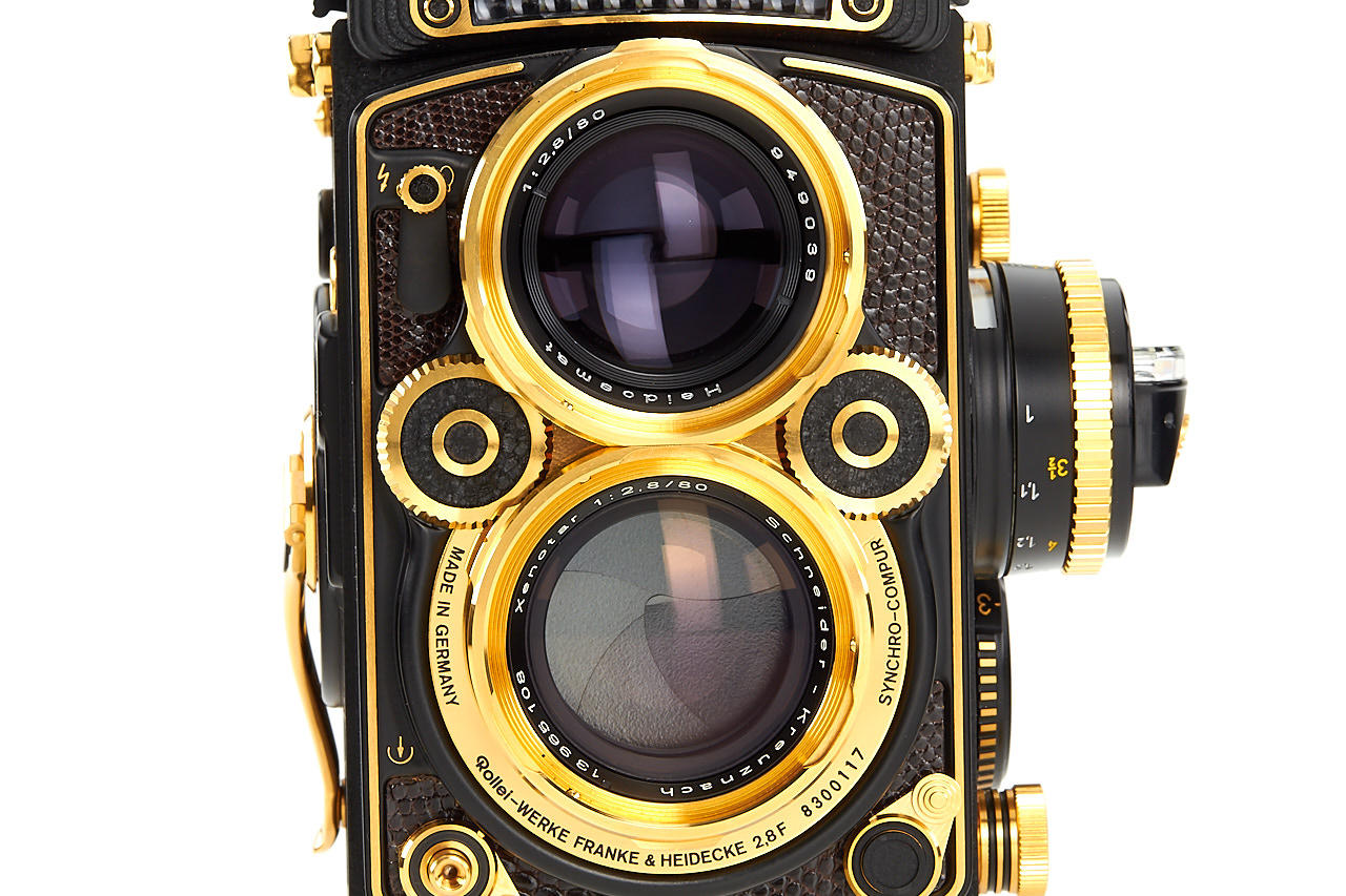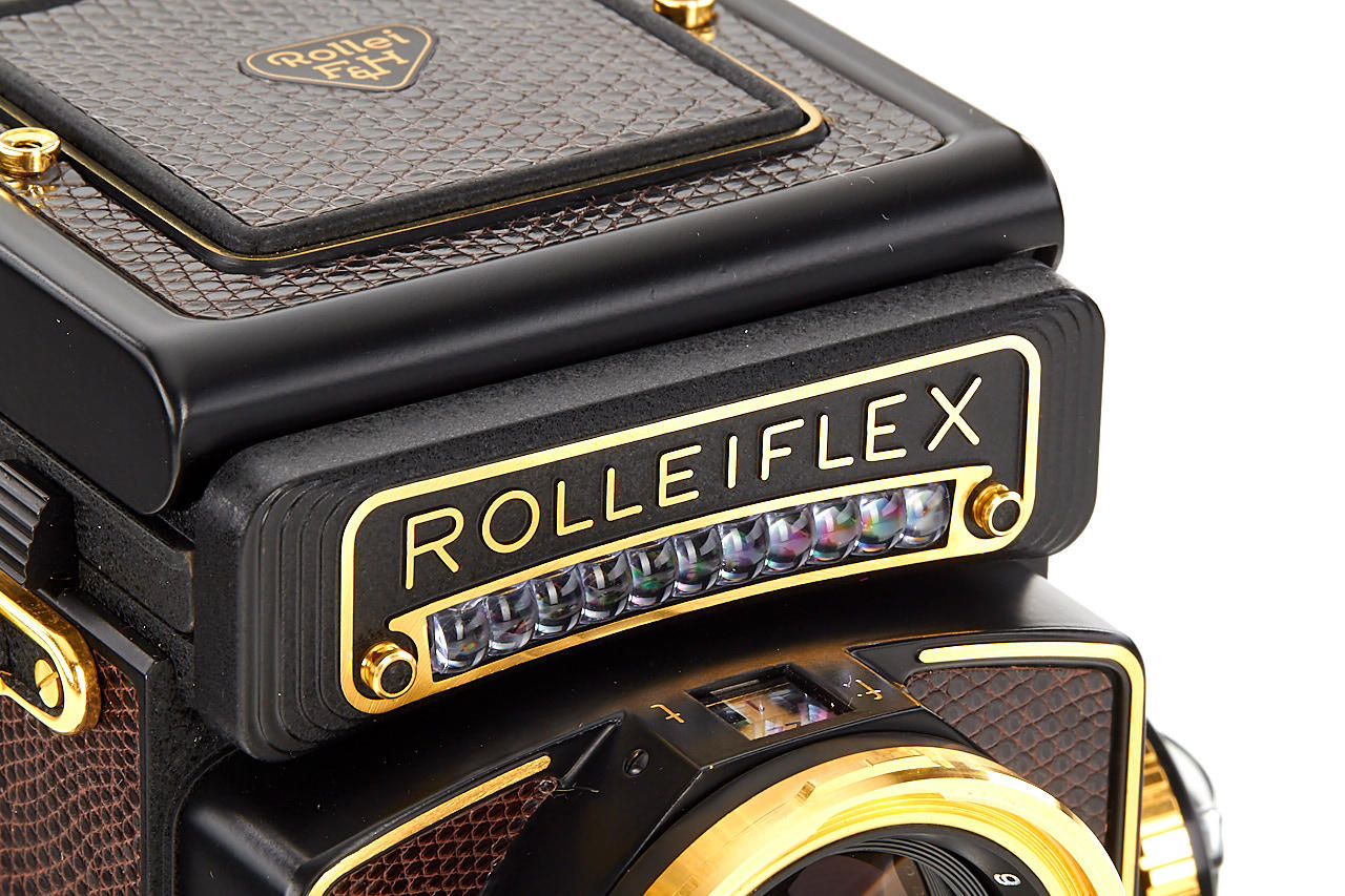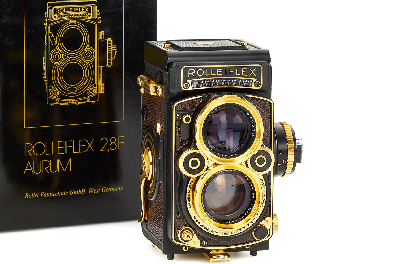 gold-plated special edition Rolleiflex in mint condition, with Xenotar 2.8/80mm no.13965108, lens cap, wooden presentation box, strap, warranty, instructions and maker's box, only 1500 these rare cameras have been made after the F-series production has been suspended