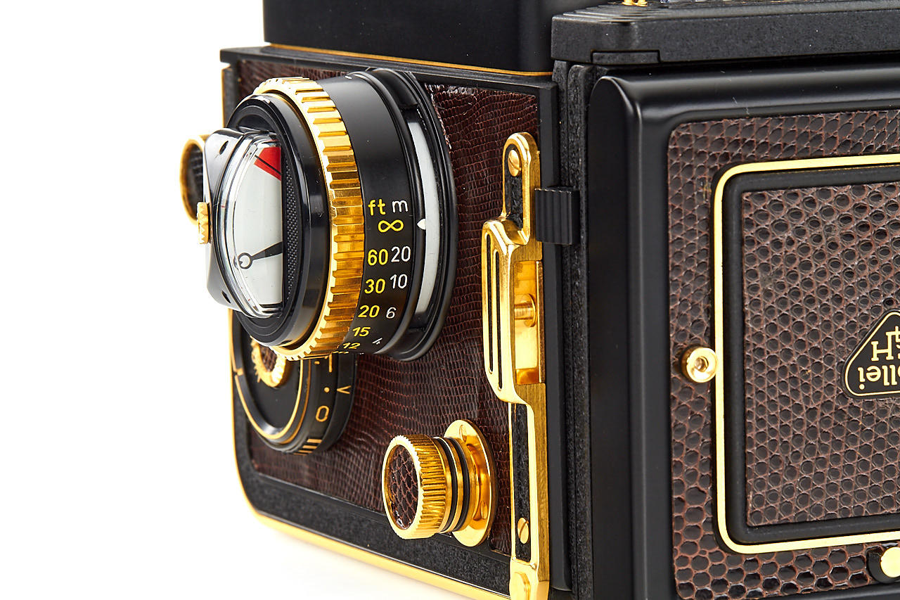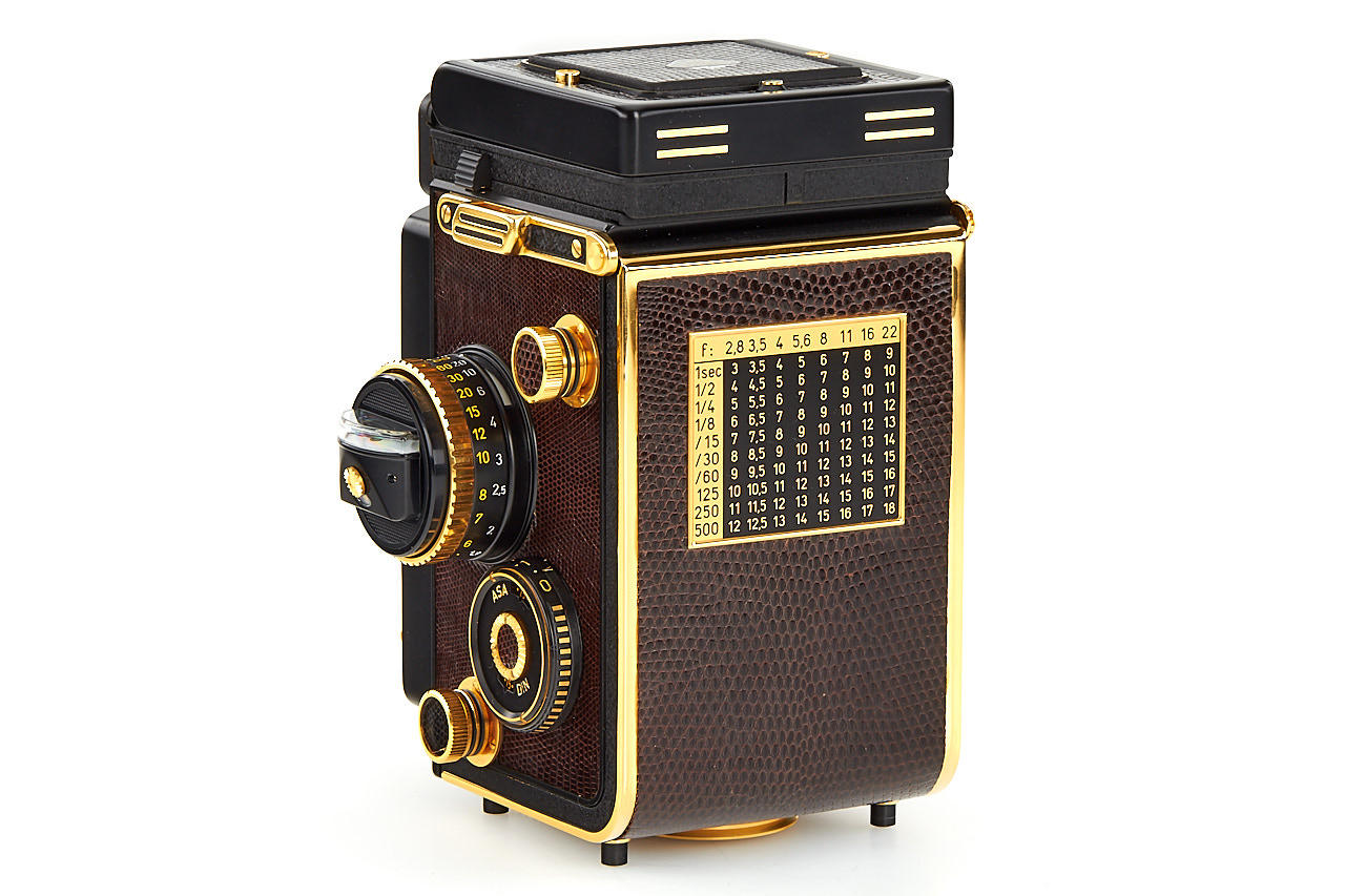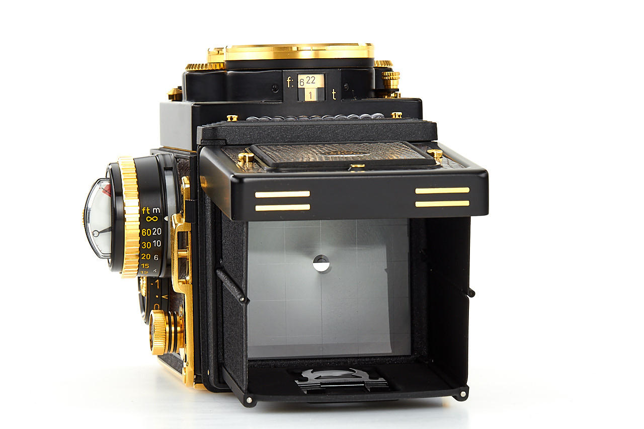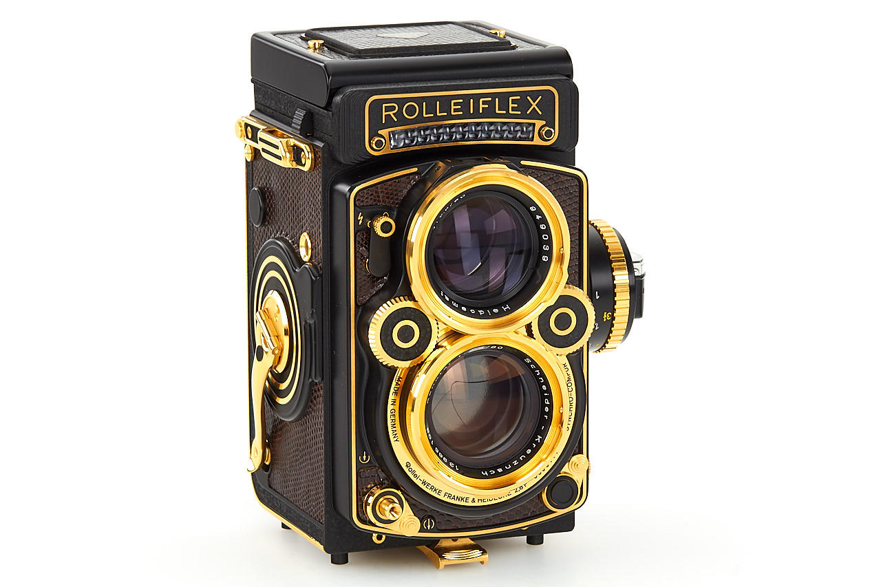gold-plated special edition Rolleiflex in mint condition, with Xenotar 2.8/80mm no.13965108, lens cap, wooden presentation box, strap, warranty, instructions and maker's box, only 1500 these rare cameras have been made after the F-series production has been suspended
