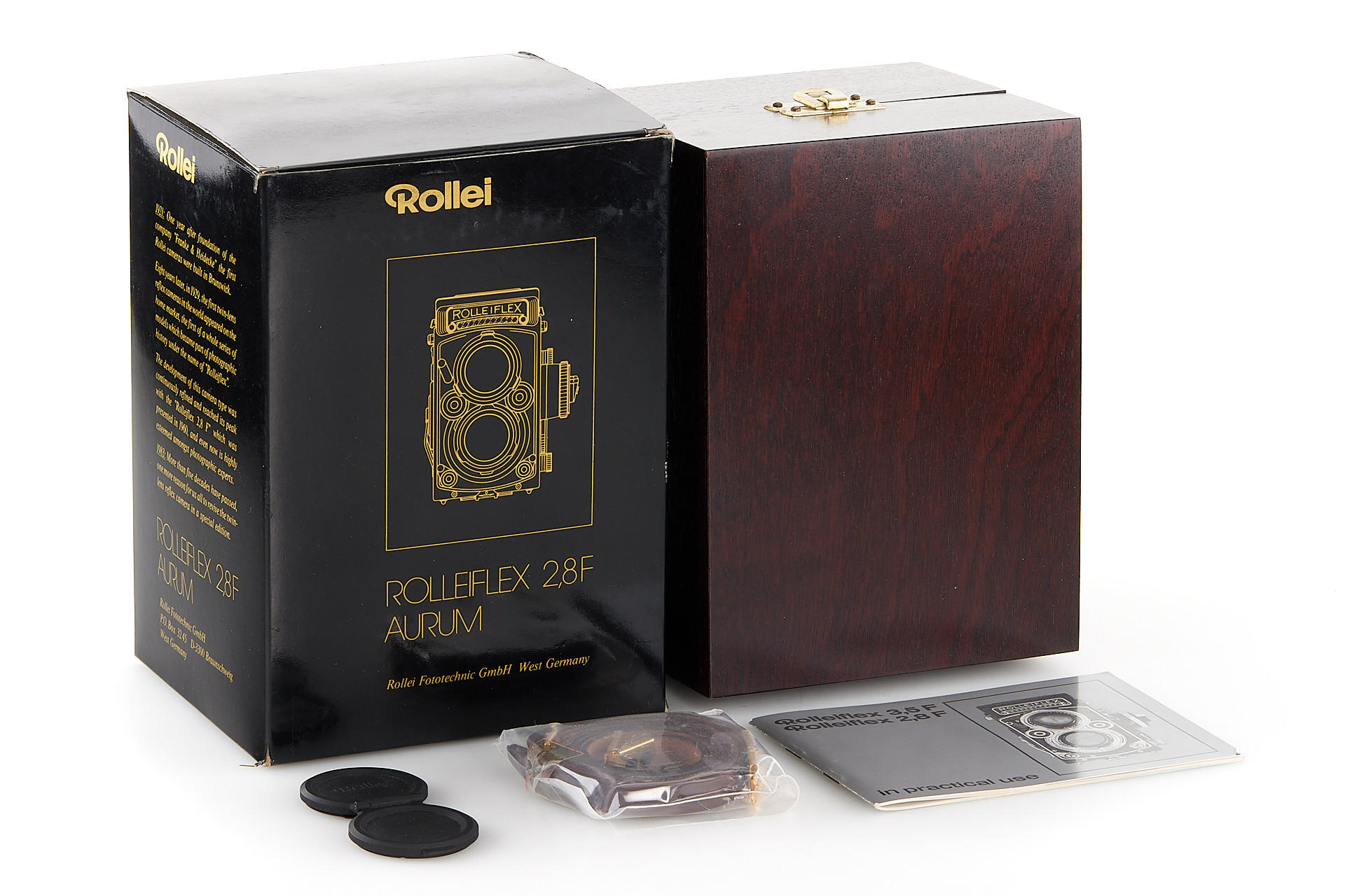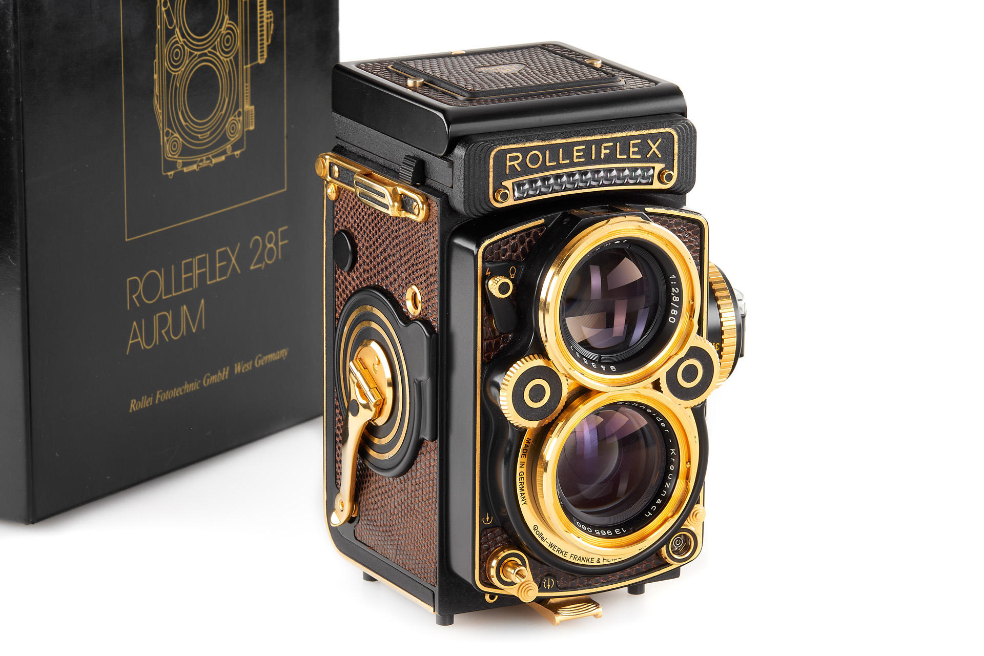 gold-plated special edition Rolleiflex in almost mint condition, with Xenotar 2.8/80mm no.13965060, lens cap, strap, wooden presentation box, instructions and outer box, only 1500 of these rare cameras have been made after the F-series has been suspended