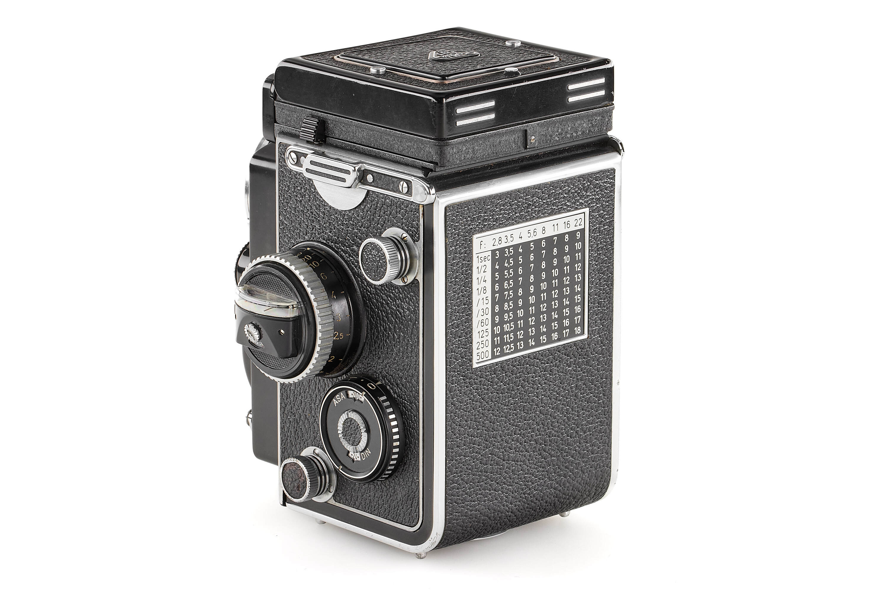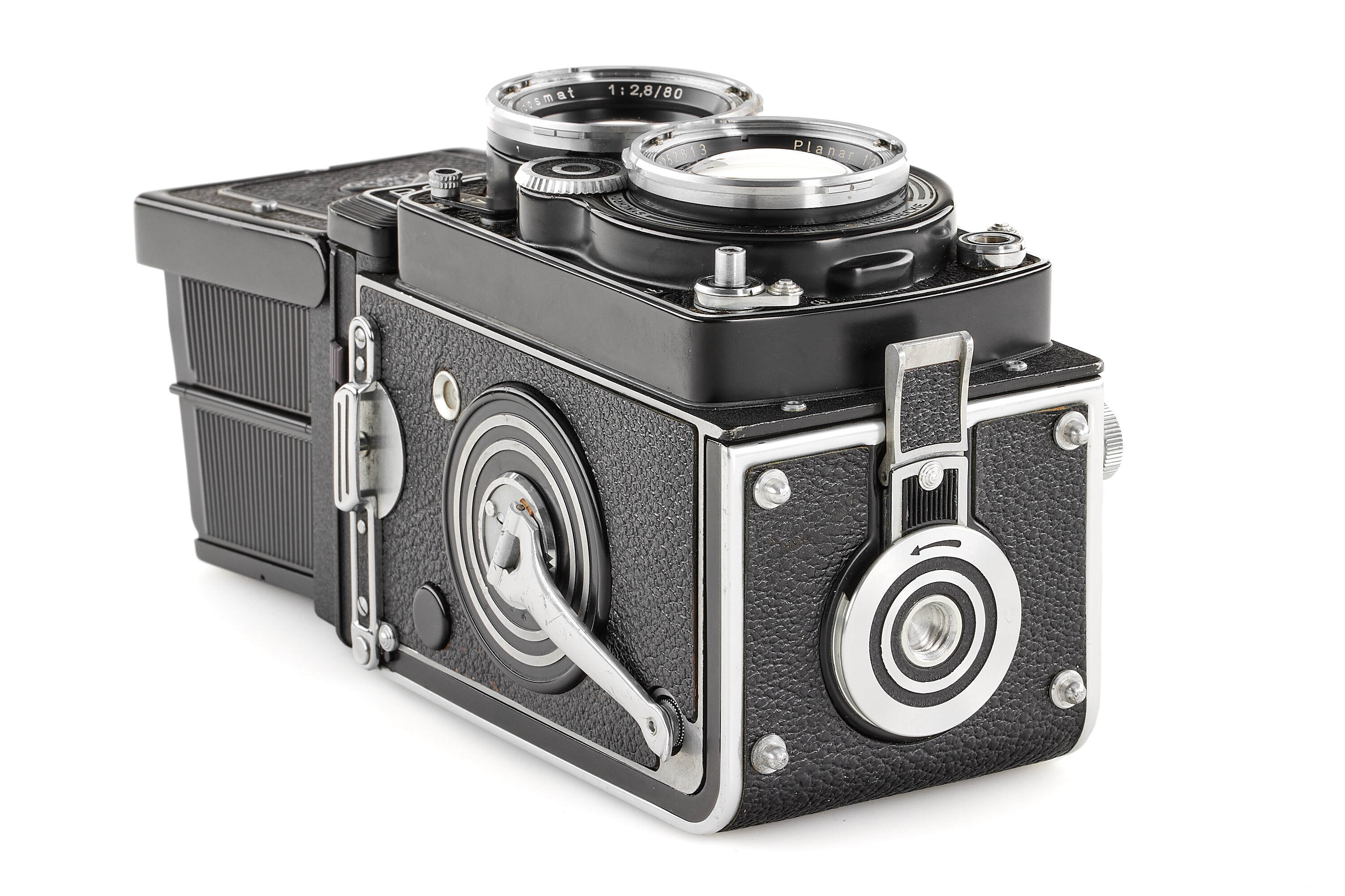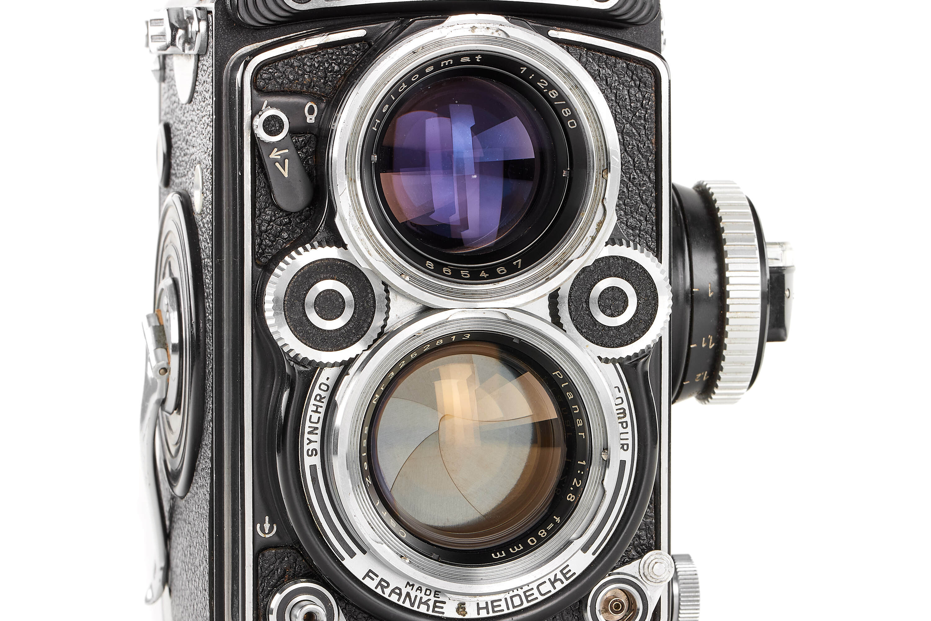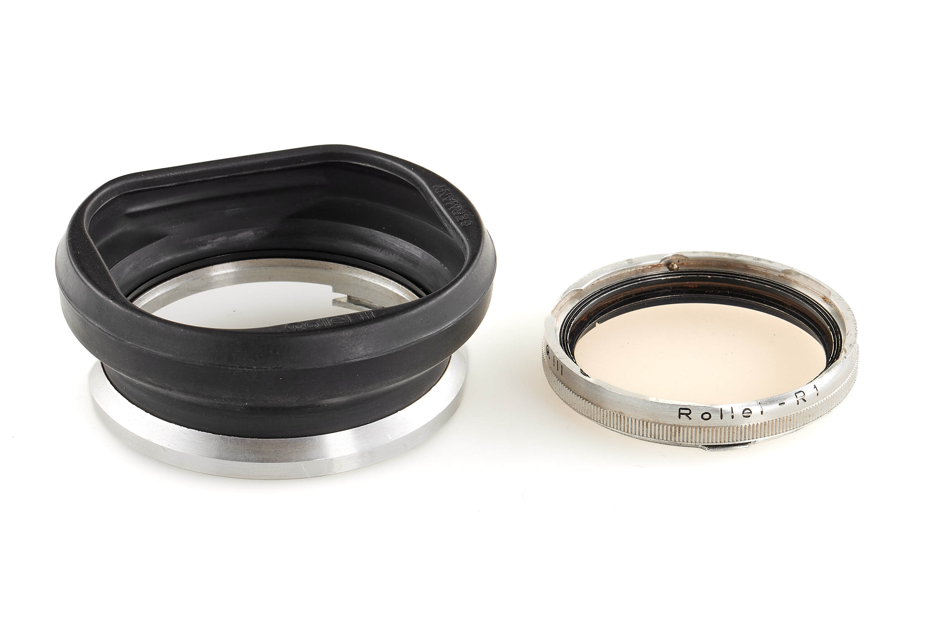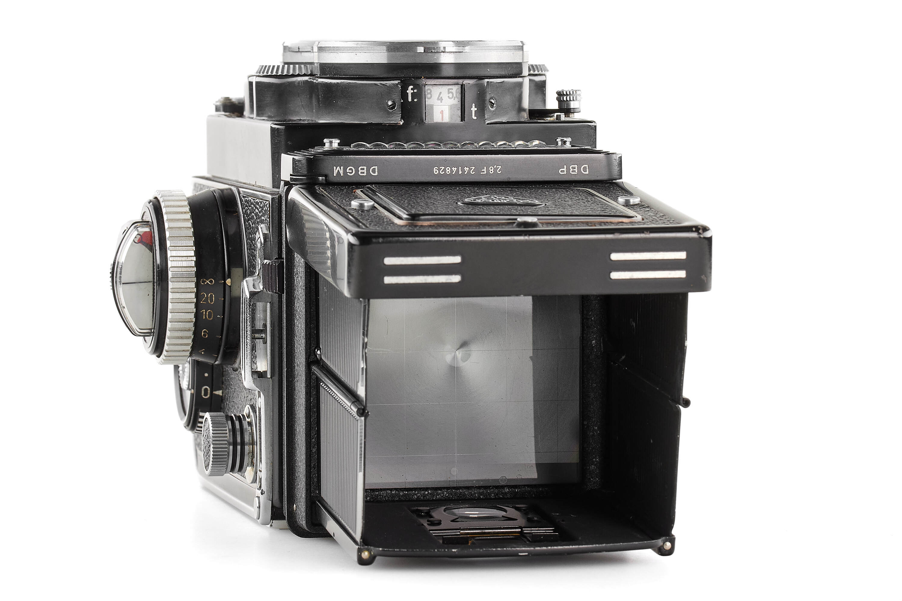Very nice classic professional 6x6 camera in meter scale, in almost mint condition, light meter accurate, with Planar 2.8/80mm no.3252813, good lenses only showing few and light cleaning marks, with filter protection (cond. B) and rubber hood.