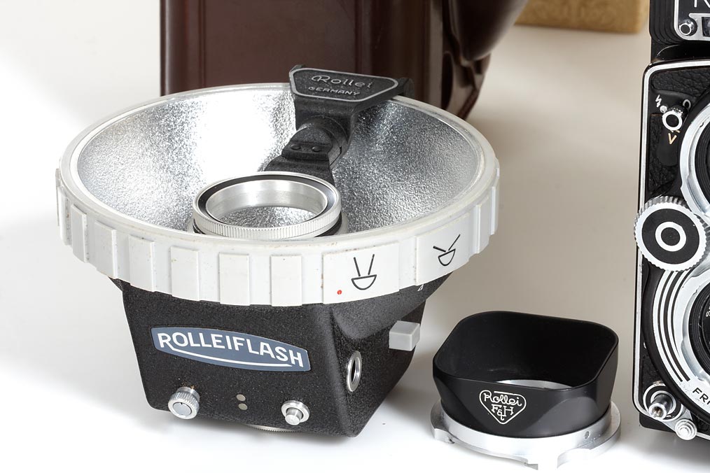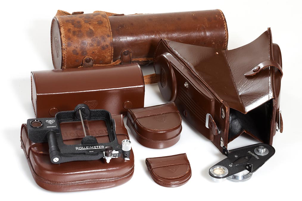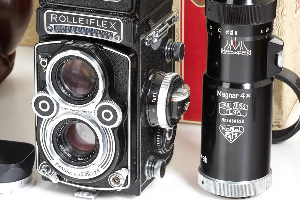 near mint late 3rd model 3.5F with exposure meter, in good working order, Xenotar 3.5/75mm no.7810066 taking lens, Heidosmat 2.8/75mm no.629951 viewing lens, cap, case, strap, maker's box, Rolleiflash with case in maker's box, Carl Zeiss Magnar 4x no.2450522 with case (cond. B+), Rolleimeter 3.5 in maker's box, panorama head inmaker's box, yellow filter in maker's box, green filter in maker's box,Rolleinar 3 in maker's box, hood in maker's box, case for filters in maker's box, extension hood with binocular magnifier in maker's box