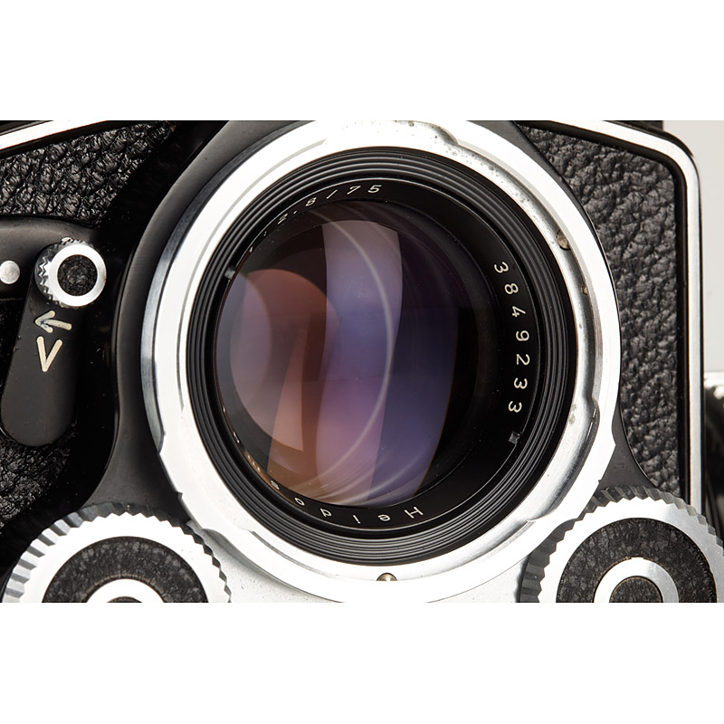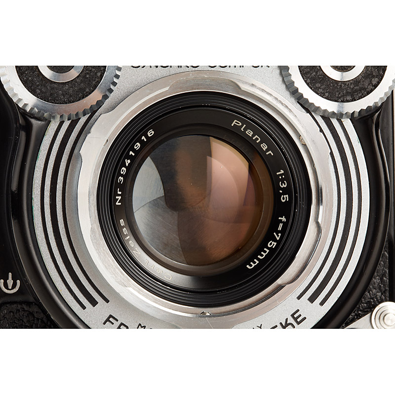 near mint and in perfect working order, Planar 3.5/75mm taking lens no.3941916, hood, UV filter, leather case, strap