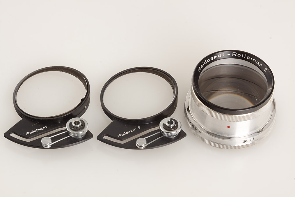 near mint metered Rolleiflex with Planar 3.5/75mm no.4772102, (meter not operable, cap, everready case with big ear), Rolleinar 3 in maker's box, Rolleimarin 4 no.2610 with flash in maker's boxes, Rolleinar 1 and 2 in maker's box, several unused flash bulbs, small exposure meter in underwater housing, Rollei P11 projector with Heidosmat 2.8/150mm (cap, magazine, cables, instructions) and two books